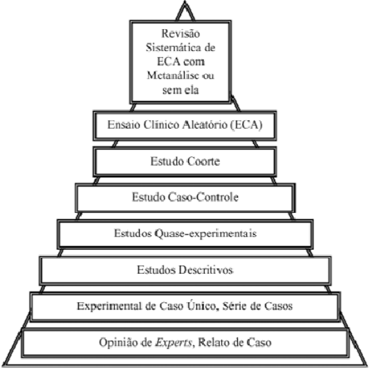 Prática em Saúde Baseada em Evidências A prática em saúde baseada em evidências (PSBE) - é um movimento dos profissionais de saúde que se baseia na aplicação do método científico a toda a prática em saúde. Evidências significam, aqui, provas científicas. Um dos criadores deste movimento foi o professor Archie Cochrane, pesquisador britânico autor do livro Effectiveness and Efficiency: Random Reflections on Health Services (1972). Sua luta levou à crescente aceitação popular do conceito da Medicina baseada em evidências. Seu trabalho foi reconhecido e homenageado com a criação dos centros de pesquisa de medicina baseada em evidências – os Cochrane Centers – e de uma organização internacional chamada de Cochrane Collaboration. Usando técnicas oriundas da ciência, engenharia e estatística tais como meta-revisões da literatura existente, análise de risco-benefício e experimentos clínicos randomizados e controlados, a prática em saúde baseada em evidências luta para que todos os profissionais de saúde façam o "uso consciencioso, explícito e judicioso da melhor evidência atual" quando fazem decisões em seu trabalho de cuidado individual dos pacientes. Como nem todo artigo científico publicado alcança qualidade suficiente para ser considerado como adequado para auxiliar na tomada de decisão clínica, um hierarquia de qualidade de evidência disponível foi concebida em forma de pirâmede (Figura1) de forma que revisões sitemáticas com ou sem metanálise (estatística) são as principais fontes de informação para os terapeutas, enquanto textos sobre opniões e relatos de caso não provêm informação adequada para tal. Figura 1. Hierarquia da evidência: investigações com localização superior na hierarquia indicam maior força da evidência† i . A prática da PSBE implica não somente conhecimento e experiência clínicas, mas também “expertise” em procurar, encontrar, interpretar e aplicar os resultados de estudos científicos epidemiológicos aos problema individual de seus pacientes. Implica também conhecer como calcular e comunicar os riscos e os benefícios dos diferentes cursos de ação aos seus pacientes. Para os fisioterapeutas a PSBE tornou-se uma ‘preocupação’ desde que a American Physical Therapy Association inclui como meta para estes profissionais prover atendimentos baseados em evidências científicas. Por exemplo, se um fisioterapeuta diz que há necessidade de se realizar a uma determinada modalidade eletroterapêutica no protocolo de atendimento de um paciente, ele deverá fornecer uma evidência - uma prova científica - dessa afirmação. Assim, o fisioterapeuta deverá procurar por exemplo por um estudo em que foram acompanhados um número suficiente de pacientes que receberam a mesma modalidade por ele proposta comparado com um número semelhante de outros pacientes receberam uma outra modalidade por um período de tempo adequado. Qualquer profissional que realize qualquer afirmação sobre a saúde de uma pessoa sem embasá-la em estudos científicos está fazendo medicina baseada em autoridade e não medicina baseada em evidências científicas. Nesse Fórum pede-se que a partir da condição dolorosa designada para seu grupo, seja elaborada uma busca em bases de dados utilizando opções avançadas de busca de forma a apresentar e discutir as evidências científicas disponíveis para elaboração de tratamento conservador não-farmacológicos. Para realizar a busca selecione palavras chaves a partir dos termos comuns referentes à condição clínica de interesse a ser tratada e usando opções avançadas iniciar a busca pelos artigos que contém a melhor evidência científica para responder a pergunta do Fórum. Como limites de busca usar as expressões que designam o tipo de estudo e que limitam as buscas a estudos com humanos. Veja os exemplos, da base PUBMED, a seguir: ` Busque a partir da condição clínica e desconsidere as opções medicamentosas e não-consevadoras. Você pode usar a opção NOT para excluir esses métodos de tratamento. Lembre-se de não limitar exclusivamente a fisioterapia ou reabilitação quando tiver interesse em técnicas que não são exclusivas dessa profissão. Utilize a opção Publication Type para definir o tipo de estudo, começando sempre pelas metanálises, seguido de revisões sistemáticas, guias práticos ou consensos e por fim os estudos clínicos aleatorizados e controlados. Só pesquise por estudos clínicos sem aleatorização ou controle quando os anteriores não estiverem disponiveis para a sua condição clínica. Nessa base de dados é possível armazenar no histórico termos que queremos repetir em novas buscas e também visualizar em números quantos artigos foram localizados sem uma pré-visualização dos títulos se você apenas armazenar as buscar usando a opção "Add to history" ao final dos campos de busca. Se estiver em dúvida quando ao que escrever a frente do campo de busca, use a opção "Show index list" a direita do espaço reservado para digitação e visualize algumas das opções disponíveis. Alguns opções de filtro também estão disponíveis na página de visualização dos títulos, no canto esquerdo. Com o resultado das buscas e os resumos dos artigos, tentar obtê-los na integra para leitura crítica. Se metanálises e revisões sistemáticas não estiverem disponíveis procure classificar o resultado da busca como sugerido a seguir: A. Forte evidência – achados (favoráveis ou não ao tratamento/protocolo/técnicas) consistentes em múltiplos RCTs de alta qualidade; B. Moderada evidência - achados (favoráveis ou não) consistentes em um RCT de alta qualidade e um ou mais em RCTs de menor qualidade; C. Limitada evidência - achados (favoráveis ou não) consistentes em um ou mais em RCTs de menor qualidade; D. Conflitante evidência – resultados (favoráveis ou não) conflitantes entre os RCTs; 5. Sem evidências