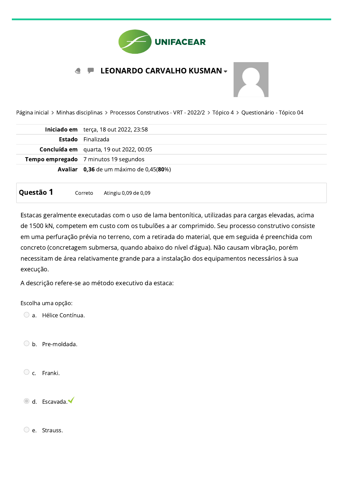 Iniciado em terça, 18 out 2022, 23:58 Estado Finalizada Concluída em quarta, 19 out 2022, 00:05 Tempo empregado 7 minutos 19 segundos Avaliar 0,36 de um máximo de 0,45(80%) Questão 1 Correto Atingiu 0,09 de 0,09 Estacas geralmente executadas com o uso de lama bentonítica, utilizadas para cargas elevadas, acima de 1500 kN, competem em custo com os tubulões a ar comprimido. Seu processo construtivo consiste em uma perfuração prévia no terreno, com a retirada do material, que em seguida é preenchida com concreto (concretagem submersa, quando abaixo do nível d’água). Não causam vibração, porém necessitam de área relativamente grande para a instalação dos equipamentos necessários à sua execução. A descrição refere-se ao método executivo da estaca: Escolha uma opção: a. Hélice Contínua. b. Pre-moldada. c. Franki. d. Escavada. e. Strauss. LEONARDO CARVALHO KUSMAN Página inicial Minhas disciplinas Processos Construtivos - VRT - 2022/2 Tópico 4 Questionário - Tópico 04 https://ava.unifacear.edu.br/ https://ava.unifacear.edu.br/user/view.php?id=11699&course=110495 javascript:void(0) https://ava.unifacear.edu.br/ https://ava.unifacear.edu.br/course/view.php?id=110495§ion=0 https://ava.unifacear.edu.br/course/view.php?id=110495§ion=4 https://ava.unifacear.edu.br/mod/quiz/view.php?id=799748 Questão 2 Incorreto Atingiu 0,00 de 0,09 Acerca de estacas do tipo hélice contínua, julgue os itens que se seguem. I) Estacas do tipo hélice contínua são estacas caracterizadas pela grande velocidade de execução, que apresentam ausência de vibrações e ruídos excessivos. II) A utilização de estacas do tipo hélice contínua possibilita alto controle de arrasamento e baixa perda de concreto. III) A utilização de estacas do tipo hélice contínua possibilita alta produtividade comparada a outros tipos de estacas de fundação, alta capacidade de carga das estacas e podem ser executadas acima ou abaixo do lençol freático. Assinale a alternativa correta: Escolha uma opção: a. Somente I correta. b. I, II e III corretas. c. I e III corretas. d. I e II corretas. e. II e III corretas. Questão 3 Correto Atingiu 0,09 de 0,09 Na construção civil são aplicados vários tipos de fundações que geralmente são classi�cadas em diretas e indiretas. Sobre os tipos de fundação listados a seguir é correto a�rmar o seguinte: I – Estaca escavada II – Sapatas III – Radier IV – Fundação corrida V – Blocos VI – Hélice contínua Escolha uma opção: a. I, III e VI são fundações profundas e II, IV e V são fundações super�ciais. b. II e VI são fundações profundas e I, III, IV e V são fundações super�ciais. c. II e V são fundações profundas e I, III, IV e VI são fundações super�ciais. d. I e VI são fundações profundas e II, III, IV e V são fundações super�ciais. e. II, III, IV e V são fundações profundas e I e VI são fundações super�ciais. Questão 4 Correto Atingiu 0,09 de 0,09 Uma fundação profunda moldada in loco, é executada mediante a introdução no terreno, por rotação, de um trado. A injeção de concreto é feita pela haste central do trado simultaneamente à sua retirada. A armadura é sempre colocada após a concretagem. O procedimento executivo descrito acima refere-se: Escolha uma opção: a. Aos tubulões a ar comprimido b. Às estacas Franki c. Às estacas hélice contínua d. Aos tubulões a céu aberto e. Às estacas Strauss Questão 5 Correto Atingiu 0,09 de 0,09 Em construção civil, as fundações podem ser classi�cadas como diretas ou indiretas. Em relação a essa nomenclatura, assinale a a�rmativa correta. Escolha uma opção: a. As fundações diretas, são construídas por materiais extraídos da natureza, enquanto nas fundações indiretas, utilizam-se materiais derivados. b. Nas fundações diretas, a base da fundação apresenta uma seção larga, enquanto nas fundações profundas, o comprimento é preponderante sobre a seção transversal. c. Nas fundações diretas, o alicerce da construção está diretamente ligado à fundação, enquanto nas fundações indiretas, não há conexão entre o alicerce e a fundação. d. As fundações diretas, são executadas in loco, enquanto as fundações indiretas, são constituídas de elementos prémoldados. e. Nas fundações diretas, a resistência do solo é feita pelo atrito lateral da fundação, enquanto nas fundações indiretas, a resistência é feita por meio de sua base. ◄ Slides - Fundações Indiretas Seguir para... Tópico 05 - Livro Texto ► https://ava.unifacear.edu.br/mod/resource/view.php?id=799746&forceview=1 https://ava.unifacear.edu.br/mod/resource/view.php?id=799754&forceview=1