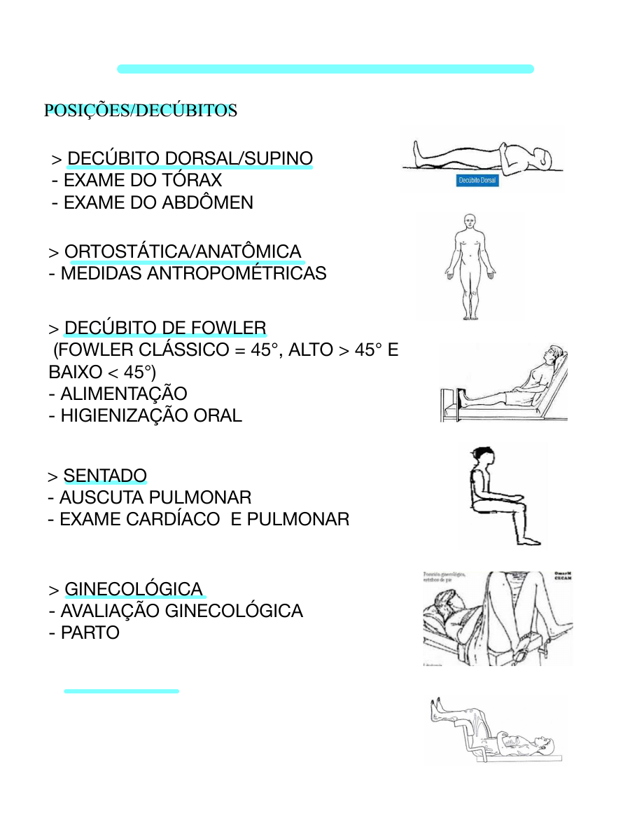 EXAME FÍSICO POSIÇÕES/DECÚBITOS > DECÚBITO DORSAL/SUPINO - EXAME DO TÓRAX - EXAME DO ABDÔMEN > ORTOSTÁTICA/ANATÔMICA - MEDIDAS ANTROPOMÉTRICAS > DECÚBITO DE FOWLER (FOWLER CLÁSSICO = 45°, ALTO > 45° E BAIXO < 45°) - ALIMENTAÇÃO - HIGIENIZAÇÃO ORAL > SENTADO - AUSCUTA PULMONAR - EXAME CARDÍACO E PULMONAR > GINECOLÓGICA - AVALIAÇÃO GINECOLÓGICA - PARTO > LITOTÔMICA - CIRURGIA (HEMORROIDECTOMIA E PERINEOPLASTIA) > SIMS - EXAME RETAL - CLISTER EVACUATIVO > TRENDELENBURG - CIRURGIA (TRAQUEOSTOMIA) - MELHORAMENO DO RETORNO VENSO > PROCLIVE/TRENDELENBURG INVERTIDO - CIRURGIA (CARDIACA, CEREBRAL) > DECÚBITO LATERAL DIREITO OU ESQUERDO - CIRURGIA > DECÚBITO VENTRAL/PRONA - FACILITA A RESPIRAÇÃO (MELHOR EXPANSÃO DO PULMÃO E MÚSCULOS INTERCOSTAIS > GENUPEITORAL/MAOMETANA - CIRURGIA (RETAL, RIN) - EXAMES RETAIS - FACILITA A ELIMINAÇÃO DE GASES