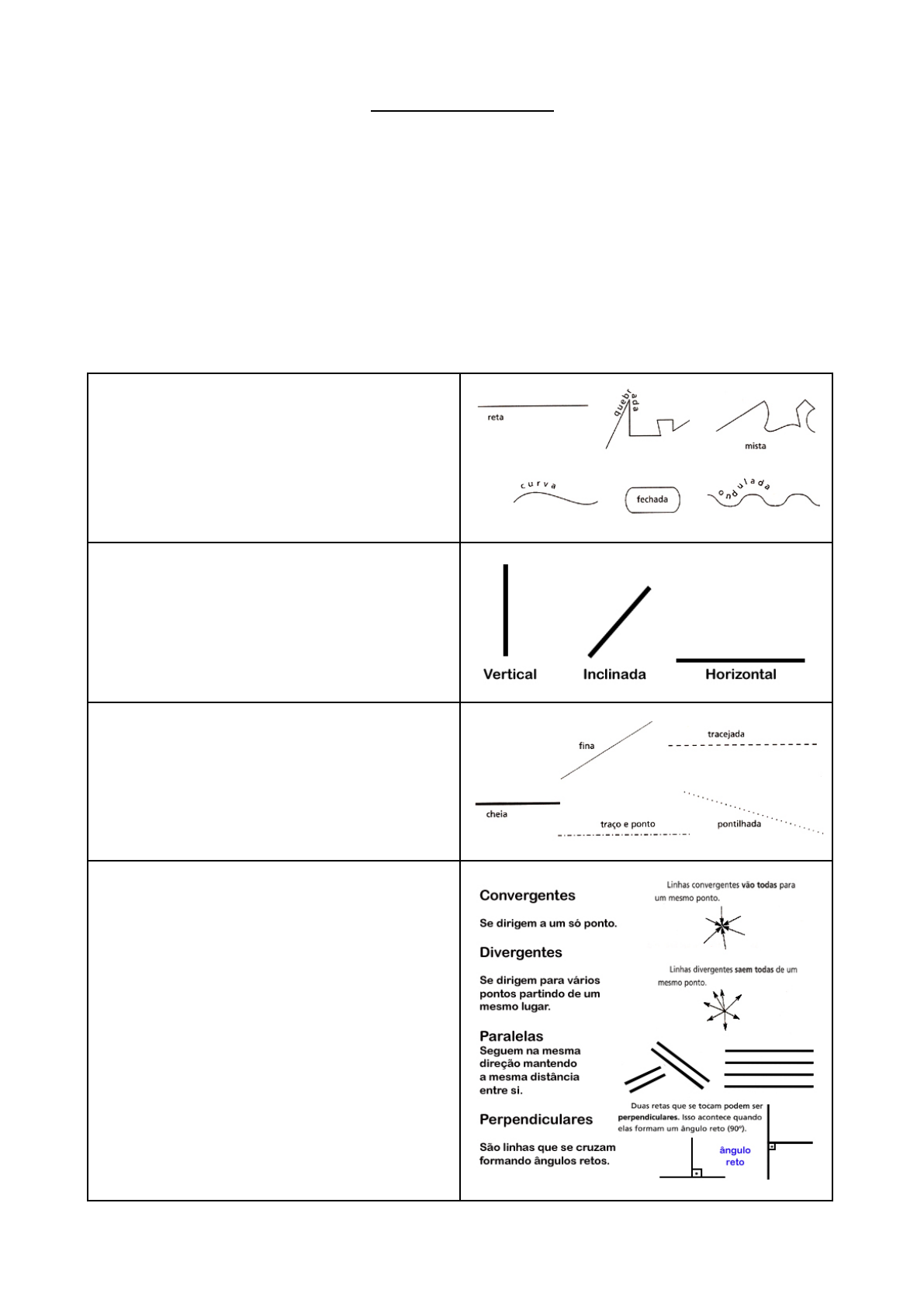 LINHAS E CURVAS A linha, assim como o ponto, é elemento essencial na composição visual. A linha está presente em nossa vida e em todas as coisas que estão ao nosso redor, especialmente na natureza. Observe a folha de uma árvore! Quantas linhas não possui? Inúmeras não é mesmo? Os nossos cabelos também são exemplos de linhas: se são lisos são linhas retas, se são crespos, encaracolados ou cacheados são linhas curvas, onduladas ou espiraladas. A linha é obtida através de infinitos pontos. Também é obtida através do “rastro” de um ponto. Quando se coloca um ponto em movimento, ele forma uma linha. A linha é o elemento básico de todo grafismo e um dos mais usados. Representa a forma de expressão mais simples e pura, porém também a mais dinâmica e variada. Podemos classificar as linhas da seguinte maneira: 1 – Quanto à forma a linha pode ser: 2 – Quanto à posição a linha pode ser: 3 – Quanto ao traçado a linha pode ser: 4 – Quanto à direção as linhas podem ser: