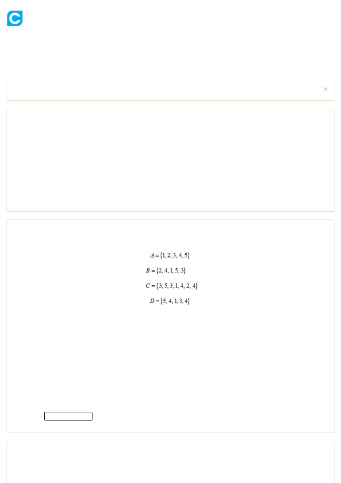 Raciocínio Lógico Matemático (/aluno/timeli… Av - Subst. 2 - Raciocínio Lógico Matemático Sua avaliação foi confirmada com sucesso (/notific × Informações Adicionais Período: 15/11/2022 00:00 à 19/11/2022 23:59 Situação: Cadastrado Pontuação: 900 Protocolo: 813061338 Avaliar Material 1) a) b) c) d) e) 2) Texto base: Considere os conjuntos a seguir: Podemos considerar como conjuntos iguais: Alternativas: A e B. D e C. B e C. B e D. A, B e C. Alternativa assinalada Texto base: Considere as seguintes afirmações: I. Existem conjuntos com um número finito e outros com um número infinito de elementos. https://colaboraread.com.br/aluno/timeline/index/3353522202?ofertaDisciplinaId=1843113 https://colaboraread.com.br/notificacao/index javascript:void(0); a) b) c) d) e) 3) a) b) c) d) e) 4) a) b) c) d) II. Conjuntos são formados somente por elementos indivisíveis, não podendo ser formados por outros conjuntos. III. Dois conjuntos são considerados iguais se possuem os mesmos elementos. Podemos considerar corretas somente as afirmações: Alternativas: I. II. III. I e III. Alternativa assinalada I e II. Texto base: Alternativas: Alternativa assinalada Texto base: Alternativas: {..., -3, -2, -1, 0} {..., -3, -2, -1} Alternativa assinalada {..., -3, -2, -1, 0, 1, 2, 3, ...} e) 5) a) b) c) d) e) {0, 1, 2, 3, 4, ...} {1, 2, 3, 4, ...} Texto base: Considere os pontos A(2, -6) e B(-1, 1). De acordo com suas coordenadas, podemos dizer que eles estão localizados, respectivamente, nos quadrantes: Alternativas: 2º e 4º. 2º e 1º. 4º e 2º. 3º e 4º. Alternativa assinalada 1º e 3º.