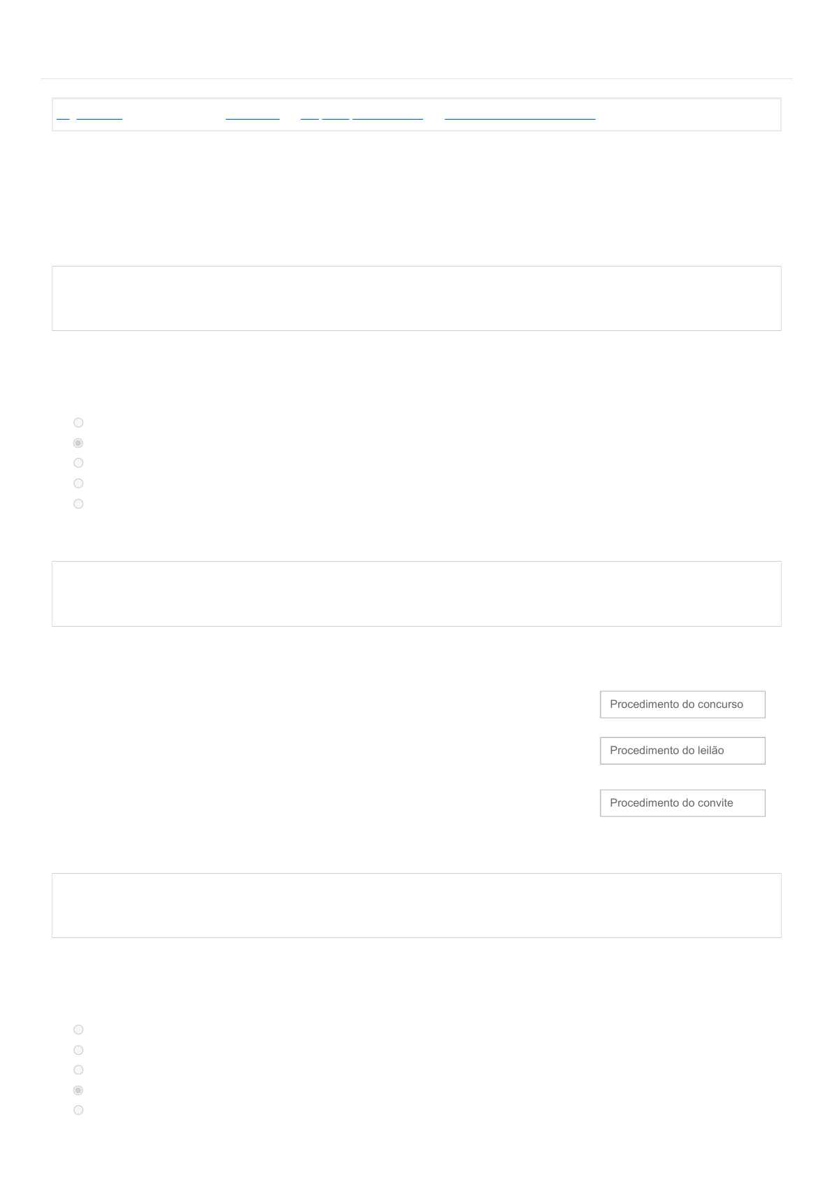 16/11/2022 16:02 3.5 Teste seus conhecimentos: Revisão da tentativa https://aprendamais.mec.gov.br/mod/quiz/review.php?attempt=1242806&cmid=18492#question-1249417-5 1/4 Página inicial / Meus cursos / LCT2022B / 3 Tipos e procedimentos / 3.5 Teste seus conhecimentos Iniciado em quarta, 16 nov 2022, 15:39 Estado Finalizada Concluída em quarta, 16 nov 2022, 16:02 Tempo empregado 23 minutos 17 segundos Avaliar 7,00 de um máximo de 10,00(70%) Questão 1 Correto Atingiu 1,00 de 1,00 Questão 2 Correto Atingiu 1,00 de 1,00 Questão 3 Correto Atingiu 1,00 de 1,00 Quanto ao sistema de registro de preços, pode-se NEGAR que: Escolha uma opção: a. Será regulamentado por decreto, atendidas as peculiaridades regionais. b. Os preços registrados serão publicados semestralmente para orientação da Administração, na imprensa oficial. c. Será precedido de ampla pesquisa de mercado. d. O TCU entende que o sistema de registro de preços é uma forma de obtenção de preços mais baixos. e. É definido como o conjunto de procedimentos para registro formal de preços relativos à prestação de serviços, aquisição e locação de bens, para contratações futuras. Associe as modalidades de licitações com as suas características/regras/leis para funcionamento. A Lei de Licitações não estabelece o procedimento a ser adotado pelo concurso, remetendo sua disciplina a regulamento próprio, de acordo com o artigo 52 da Lei de Licitações e Contratos; O edital deve ser amplamente divulgado, principalmente no município em que se realizará o leilão. O procedimento é simplificado: a convocação dos licitantes é feita por escrito, mediante carta-convite, com 05 (cinco) dias úteis de antecedência, dirigida a pelo menos 03 (três) interessados, escolhidos pela unidade administrativa. Procedimento do concurso Procedimento do leilão Procedimento do convite São atos da fase interna do pregão presencial, SALVO: Escolha uma opção: a. Justificativa da necessidade de contratação e definição do objeto. b. Definição das sanções por inadimplemento e das cláusulas do contrato. c. Designação do pregoeiro e da equipe de apoio. d. Sessão pública para o recebimento das propostas e credenciamento dos licitantes. e. Definição das exigências de habilitação e dos critérios de aceitação/julgamento das propostas. https://aprendamais.mec.gov.br/ https://aprendamais.mec.gov.br/course/view.php?id=432 https://aprendamais.mec.gov.br/course/view.php?id=432#section-3 https://aprendamais.mec.gov.br/mod/quiz/view.php?id=18492 16/11/2022 16:02 3.5 Teste seus conhecimentos: Revisão da tentativa https://aprendamais.mec.gov.br/mod/quiz/review.php?attempt=1242806&cmid=18492#question-1249417-5 2/4 Questão 4 Correto Atingiu 1,00 de 1,00 Questão 5 Incorreto Atingiu 0,00 de 1,00 Questão 6 Incorreto Atingiu 0,00 de 1,00 Questão 7 Correto Atingiu 1,00 de 1,00 O procedimento da licitação fica a cargo de uma comissão , permanente ou especial, seja na modalidade concorrência, tomada de preços ou convite. Destaca-se que, no convite , nas pequenas unidades administrativas em que a exiguidade de pessoal disponível justifique a medida, a comissão poderá ser substituída por um servidor formalmente designado . São procedimentos da Licitação, EXCETO: Escolha uma opção: a. Abertura dos envelopes contendo a documentação relativa à habilitação dos concorrentes e sua apreciação. b. Não devolução dos envelopes fechados aos concorrentes inabilitados, contendo as respectivas propostas. c. Deliberação da autoridade competente quanto à homologação e adjudicação do objeto da licitação. d. Verificação da conformidade de cada proposta com os requisitos do edital. e. Julgamento e classificação das propostas de acordo com os critérios de avaliação constantes do edital. Identifique a alternativa CORRETA: Escolha uma opção: a. Serão habilitados os proponentes que não apresentarem documentos exigidos em edital. b. A adjudicação equivale à aprovação do procedimento licitatório pela autoridade superior. c. Os documentos de habilitação poderão ser dispensados em parte nos casos de convite, concurso, fornecimento de bens para pronta entrega e leilão. d. A homologação é o ato de atribuir ao vencedor o objeto da licitação. e. Não é necessário desclassificar uma proposta financeira em razão do preço excessivo ou inexequível. A licitação é um procedimento que exige uma sucessão de atos e fases da administração e do licitante. 16/11/2022 16:02 3.5 Teste seus conhecimentos: Revisão da tentativa https://aprendamais.mec.gov.br/mod/quiz/review.php?attempt=1242806&cmid=18492#question-1249417-5 3/4 Questão 8 Correto Atingiu 1,00 de 1,00 Questão 9 Incorreto Atingiu 0,00 de 1,00 Questão 10 Correto Atingiu 1,00 de 1,00 Havendo a desclassificação de todas as propostas ou, ainda, a inabilitação de todos os licitantes o que a Administração deve fazer? Escolha uma opção: a. Nenhuma das alternativas. b. Poderá fixar aos licitantes o prazo de 05 (cinco) dias úteis para a apresentação de novas propostas ou outros documentos (convite são 03 dias úteis). c. Poderá fixar aos licitantes o prazo de 08 (oito) dias úteis para a apresentação de novas propostas ou outros documentos (convite são 03 dias úteis). d. Sempre deverá anular o procedimento licitatório. e. Sempre deverá revogar o procedimento licitatório. Os tipos de licitação são estabelecidos pelo: menor preço, melhor técnica, técnica e preço e menor lance ou oferta. Escolha uma opção: Verdadeiro Falso As modalidades licitatórias aplicadas ao sistema de registro de preços são: Escolha uma opção: a. Concorrência e tomada de preços b. Leilão e tomada de preços c. Pregão e convite d. Convite e concurso e. Concorrência e pregão. ◄ 3.4 Sistema de registro de preços Seguir para... 4.1 Contratação direta: dispensa licitação ► https://aprendamais.mec.gov.br/mod/page/view.php?id=18491