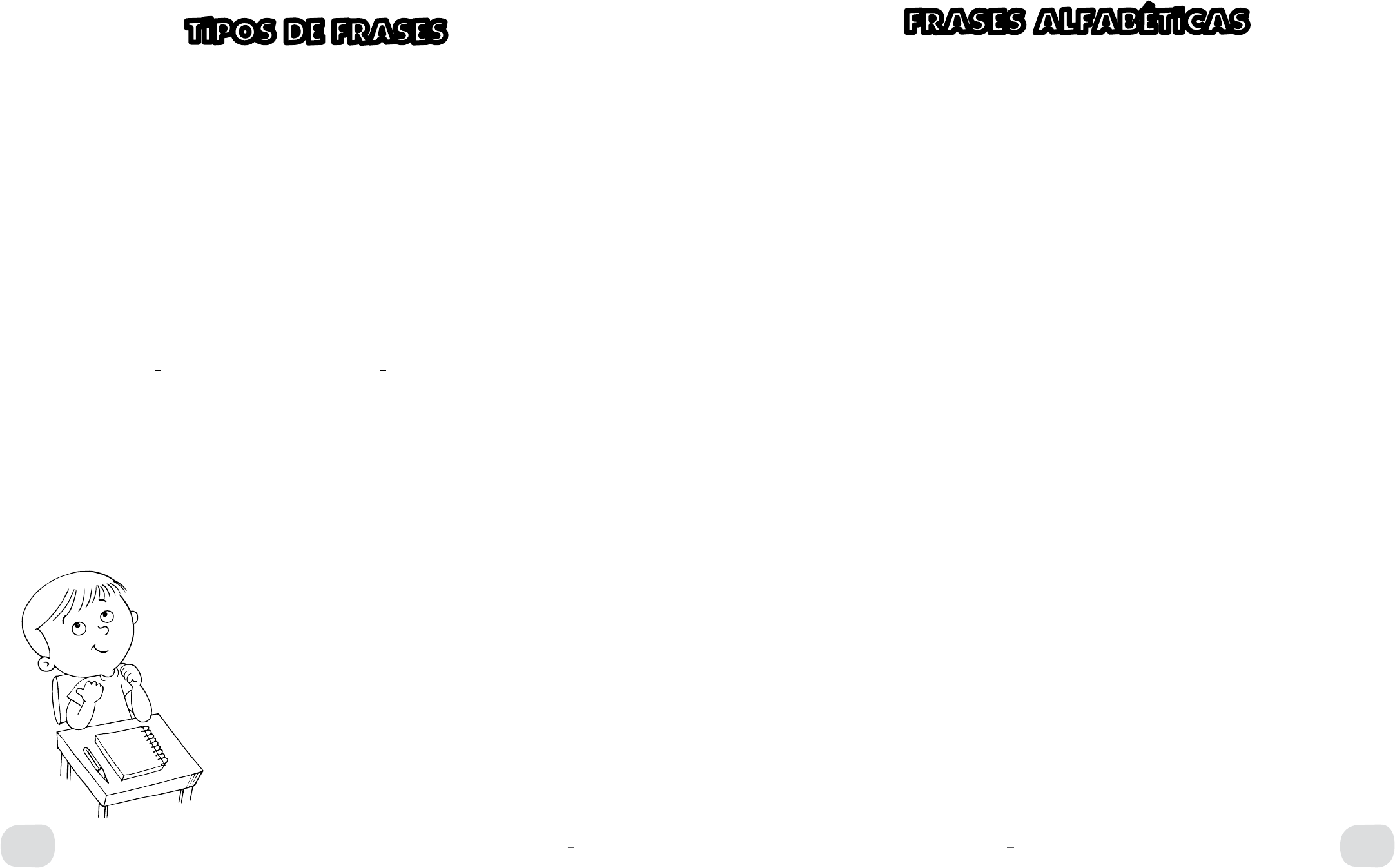 26 27Oficina de REFORÇO ESCOLAR – 5O ANO Oficina de REFORÇO ESCOLAR – 5O ANO TIPOS DE FRASES Frase é a palavra com sentido completo que faz a comunicação entre duas ou mais pessoas. Existem vários tipos de frases: Frase afirmativa - Uma afirmação. Termina com um ponto final (.). Frase interrogativa - Faz uma pergunta. Termina com ponto de interrogação (?). Frase exclamativa - Indica admiração, espanto, alegria; expressa uma emoção. Termina com um ponto de exclamação (!). Frase negativa - Nega alguma coisa. Termina com um ponto final (.). Frase imperativa - Dá uma ordem, faz um pedido. Termina com um ponto final (.) ou um ponto de exclamação (!). Numere a 2ª coluna de acordo com a 1ª coluna (A) Frase afirmativa. (E) Frase exclamativa. (I) Frase interrogativa. (N) Frase negativa. (IM) Frase imperativa. ( ) Vá logo para a escola, menino. ( ) Quem deixou o sapato fora do lugar? ( ) Gostei muito de te ver novamente. ( ) Roberta não viu quando a criança caiu. ( ) Como é bonita essa bailarina! ( ) Não gosto de comer jiló. ( ) Saia rápido! ( ) Todos os dias, Simone vai à academia. ( ) Que pergunta sem sentido! ( ) Quantos anos Camila vai fazer? FRASES ALFABÉTICAS Escreva frases com cada uma das letras do alfabeto, de modo que cada uma delas tenha apenas palavras que se iniciem com a letra inicial correspondente. Ex.: A – Arnaldo ama Amanda. Agora é sua vez... B – ____________________________________________________________ C – ____________________________________________________________ D – ____________________________________________________________ E – ____________________________________________________________ F – ____________________________________________________________ G – ____________________________________________________________ H – ____________________________________________________________ I – _____________________________________________________________ J – _____________________________________________________________ L – ____________________________________________________________ M – ____________________________________________________________ N – ____________________________________________________________ O – ____________________________________________________________ P – ____________________________________________________________ Q – ____________________________________________________________ R – ____________________________________________________________ S – ____________________________________________________________ T – ____________________________________________________________ U – ____________________________________________________________ V – ____________________________________________________________ X – ____________________________________________________________ Z – ____________________________________________________________ IM I A N E N IM A E I Resposta pessoal. Tipos de frases Frases alfabéticas