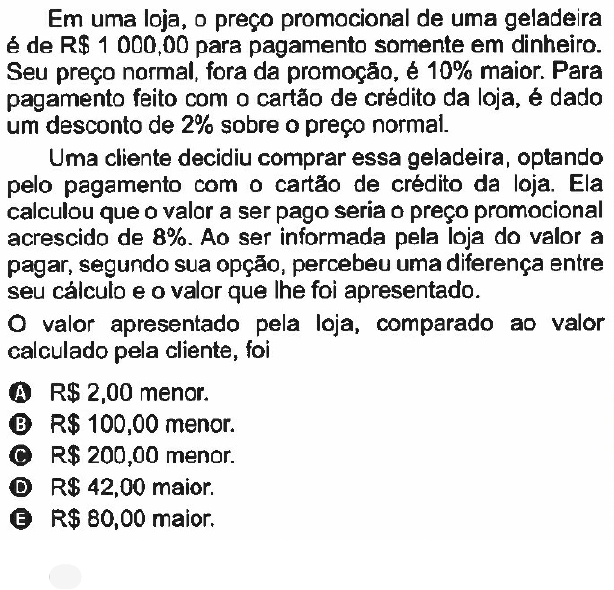 Questão 176 A . Resolução: Pelo enunciado, temos: Preço promocional: R$1 000,00 (Em dinheiro) Preço normal: R$1 000,00 ∙ (1 + 0,1) = R$ 1 100,00 Pagamento no cartão de crédito: R$1 100,00 ∙ (1 - 0,02) = R$ 1 078,00. Valor calculado pela cliente: R$1 100,00 ∙(1 + 0,08) = R$ 1 080,00. Com isso, o valor apresentado pela loja, comparado ao valor calcula pela cliente, foi: R$ 1 080,00 – R$ 1 078,00 = R$ 2,00 Portanto, R$ 2,00 menor.
