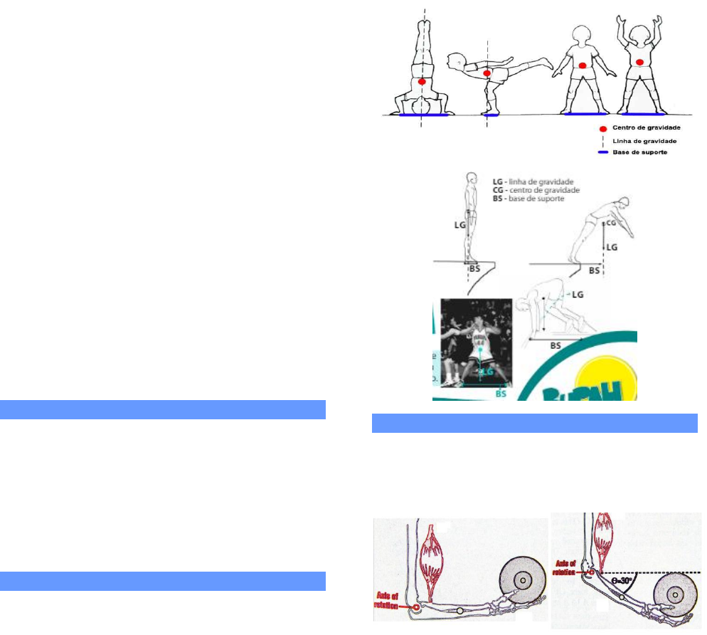 Fernanda Brescia – Fisioterapia 2º período Força e gravidade Força = todo agente capaz de produzir ou modifi- car um movimento, ou capaz de deformar um corpo. Ex.: força da gravidade, força muscular, etc Força é uma grandeza vetorial é representada por um vetor, que representa a intensidade, dire- ção e sentido da força. Juntamente com o ponto de aplicação, essas características constituem os elementos da força Ponto de aplicação = é o ponto do corpo no qual se aplica a força Direção = trajetória do corpo sob a ação da força. Existem diversas direções e, em cada direção, há sempre dois sentidos Sentido = orientação que segue a força (para cima, par baixo, à esquerda...) Intensidade = é a qualidade da força apli- cada As unidades de força mais utilizadas no estudo são Newton (N) e quilograma-força (kgf) Considerações sobre a força da gravidade Atração entre os corpos e o centro da terra Depende da distância em relação ao centro da terra Massa X peso F = m.a Centro de gravidade (CG) É um ponto ao redor do qual a massa de um corpo encontra-se uniformemente distribuída O local onde é aplicada a resultante das forças peso é o centro de gravidade Pode ser representado através da linha de gravi- dade (LG) Linha gravitacional = é a linha imaginaria que passa pelo centro de gravidade no sentido vertical até o solo Equilíbrio = estabilidade corporal Para a manutenção do equilíbrio do corpo hu- mano a linha de gravidade deve estar sobre a base de suporte (BS). Quanto maior a base e pro- ximidade do centro de gravidade, maior será a es- tabilidade Diagrama de corpo livre É um desenho simplificado sobre as forças exter- nas e internas que influem no sistema biomecâ- nico Ângulo de 90º possui mais força aplicada do que de 30º Torque Conhecido também como momento de uma força É o produto desta força multiplicado pela distância perpendicular de sua linha de ação ao eixo do movimento É o efeito rotatório de uma força Fernanda Brescia – Fisioterapia 2º período É a tendência de rotação causada quando uma força é aplicada a uma certa distância de um eixo de rotação Torque = F x d x cos o T = torque D = distancia F = força BF = braço de força R = resistência BR = braço de resistência F x BR = torque de força R x BR = torque de resistência Alavancas É a barra solida, rígida e móvel do ponto de apoio. É submetida a duas forças: potência e resistência Uma alavanca é uma barra rígida que gira em torno de um ponto fixo quando uma força é apli- cada para vencer a resistência Uma quantidade maior de força ou um braço de alavanca mais longo aumentam o movimento de força Elementos da alavanca: Ponto de apoio (PA): é o ponto onde se apoia a alavanca para realizar o movi- mento Potência ou força motriz (P): é a força que aplicamos à alavanca, para mover ou equilibrar os sistemas Resistência ou força resistente (R): é a força que deve ser vencida Braço da potência (P): é a distância que vai do ponto de apoio até o ponto de aplica- ção da potência Braço de resistência (BR): é a distância que vai do ponto de apoio até o ponto de apli- cação da resistência No corpo humano: Haste rígida segmento corporal envol- vido no movimento Ponto fixo articulação Força potente força muscular Força resistente peso dos segmentos corporais envolvidos no movimento Fernanda Brescia – Fisioterapia 2º período Tipos de alavancas Alavanca de primeira classe ou interfixa: O ponto de apoio fica situado entre a resistência e a potencia É a alavanca de equilíbrio a força necessária para vencer a resistência depende do compri- mento dos braços de potência resistência P = R ou R = P Alavanca de segunda classe ou interesistente: A resistência se situa entre o ponto de apoio (PA) e a potência (P) Podemos chama-la de alavanca de força, o braço da força potência (BP) é maior, produzindo uma potência elevada e um decréscimo no caminho percorrido É pouco encontrada no corpo humano Alavanca de terceira classe ou interpotente: A potência (P) fica entre o ponto de apoio (PA) e a resistência (R) Esta é uma alavanca de velocidade, uma vez que permite aos músculos inserirem-se próximos as ar- ticulações e produzirem movimentos rápido e am- plos, perdendo a força O braço de resistência é maior que o braço de po- tencia É a mais comum no corpo Não oferece vantagem mecânica Fernanda Brescia – Fisioterapia 2º período Vantagem mecânica (VM) A vantagem mecânica de uma alavanca resulta da relação entre o braço da força potente e o braço da força resistente As alavancas de 2ª classe apresentam maior VM VM = braço da força potente / braço da força re- sistente É uma medida de eficiência da alavanca. É a razão entre a distância do braço de força (mo- mento interno) e de resistência (momento ex- terno) em relação ao eixo