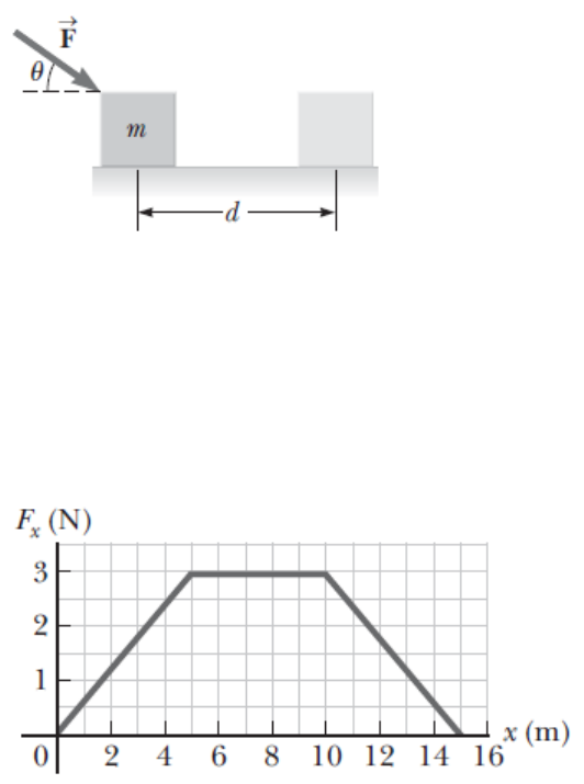 Trabalho 2 etapa 1) Um bloco de massa m = 2,50 kg é empurrado por uma distância d = 2,20 m ao longo de uma mesa horizontal sem atrito por uma força aplicada constante de módulo F = 16,0 N direcionada a um ângulo θ = 25,0° abaixo da horizontal, como mostrado na Figura. Determine o trabalho realizado no bloco pela (a) força aplicada, (b) força normal exercida pela mesa, (c) a força gravitacional e (d) força resultante sobre o bloco. (Resposta: 31,9 J) 2) Uma partícula está sujeita a uma força Fx que varia com a posição, como mostrado na Figura. Encontre o trabalho realizado pela força sobre a partícula enquanto ela se move (a) de x = 0 a x = 5,00 m, (b) de x = 5,00 m a x = 10,0 m e (c) de x = 10,0 m a x = 15,0 m. (d) Qual é o trabalho total realizado pela força na distância de x = 0 a x = 15,0 m? (Resposta: 7, 50 J; 15,0 J; 7, 50 J; 30,0 J) 3) A força que age sobre uma partícula varia como mostrado na Figura. Encontre o trabalho realizado pela força sobre a partícula enquanto ela se move (a) de x = 0 a x = 8,00 m, (b) de x = 8,00 m a x = 10,0 m e (c) de x = 0 a x = 10,0 m. (Resposta: 4) Quando um corpo de 4,00 kg é pendurado verticalmente em certa mola leve que obedece à lei de Hooke, a mola é esticada 2,50 cm. Se o corpo de 4,00 kg for removido, (a) a que distância a mola é distendida se um corpo de 1,50 kg for pendurado nela? (b) Quanto trabalho um agente externo deve realizar para distender a mesma mola 4,00 cm de sua posição relaxada? (Resposta: 0.938 cm; 1.25 J) 5) Um vagão de carga de 6 000 kg corre ao longo dos trilhos com atrito desprezível. O vagão é trazido ao repouso por uma combinação de duas molas como ilustrado na Figura. Ambas as molas são descritas pela lei de Hooke e têm constantes elásticas k1 = 1 600 N/m e k2 = 3 400 N/m. Depois que a primeira mola comprime uma distância de 30,0 cm, a segunda mola age com a primeira para aumentar a força quando ocorre compressão adicional, como mostrado no gráfico. O vagão entra em repouso 50,0 cm depois de conectar primeiro o sistema de duas molas. Encontre a velocidade inicial do vagão. (Resposta: 0.299 m/s) 6) Uma partícula de 0,600 kg tem uma velocidade escalar de 2,00 m/s no ponto A e energia cinética de 7,50 J no ponto B. Qual é (a) sua energia cinética em A, (b) a velocidade escalar em B? e (c) o trabalho resultante realizado sobre a partícula por forças externas enquanto ela se move de A até B? (Resposta: 1,20 J; 5,00 m/s; 6,30 J) 7) Uma partícula de 4,00 kg está sujeita a uma força resultante que varia com a posição, como mostrado na Figura. A partícula parte do repouso em x = 0. Qual é a velocidade escalar dela em (a) x = 5,00 m, (b) x = 10,0 m, e (c) x = 15,0 m? (Resposta: 1,94 m/s; 3,35 m/s; 3,87 m/s) 8) Um bloco de massa m = 5,00 kg é solto do ponto A e desliza na pista sem atrito mostrada na Figura. Determine (a) a velocidade do bloco nos pontos B e C e (b) o trabalho resultante realizado pela força gravitacional sobre o bloco conforme ele se move do ponto A para o ponto C. 9) Uma partícula de massa de 0,500 Kg é arremessada de P como mostrado na figura. A partícula tem velocidade inicial vi com uma componente horizontal de 30,0 m/s. A partícula sobe até uma altura máxima de 20,0m acima de P. Utilizando a lei de conservação da energia, determine: (a) a componente vertical de vi (b) o trabalho feito pela força gravitacional sobre a partícula durante seu movimento de P até B e (c) as componentes horizontal e vertical quando a partícula alcança B. (Resposta: 19, 8 m/s; 294 J; 10) Dois corpos são conectados por um barbante leve que passa sobre uma roldana leve e sem atrito, como mostrado na Figura. O corpo de massa m1 = 5,00 kg é solto do repouso a uma altura h = 4,00 m acima da mesa. Usando o modelo de sistema isolado, (a) determine a velocidade do corpo de massa m2 = 3,00 kg assim que o corpo de 5,00 kg atinge a mesa e (b) encontre a altura máxima acima da mesa que o corpo de 3,00 kg alcança. (Resposta: 4,43 m/s; 5,00 m). 11) Um bloco de massa 0,250 Kg é colocado na parte superior de uma mola vertical leve com constante elástica de 5000 N/m e empurrado para baixo, de tal forma que a mola seja comprimida 0,100 m. Após o bloco ser solto do repouso, ele sobre e então deixa a mola. Qual é a altura máxima que ele sobre acima do ponto de partida? (Resposta: 10, 2 m) 12) Sob a ação de uma única força constante de intensidade de 50 N, paralela ao deslocamento horizontal, um ponto material de 5,0 Kg parte do repouso e percorre 12,8 m. Determine: (a) a aceleração do ponto material; (b) a velocidade atingida após percorrer 12,8 m (c) o trabalho realizado pela força. 13) Um indivíduo empurra uma caixa de peso 200 N ao longo de uma rampa de 25 m, para cima, com força de intensidade F = 150 N. Entre a caixa e o piso há uma força de atrito de intensidade de 30 N. Determine o trabalho realizado por todas a forças separadamente, e pela força resultante no trajeto AB, de 25 m. 14) Um homem empurra um carrinho ao longo de uma estrada plana, comunicando a ele uma força constante, paralela, ao deslocamento, e de intensidade 3,0x102 N. Determine o trabalho realizado pela força aplicada pelo homem sobre o carrinho, considerando deslocamento de 15 metros. 15) Uma partícula de massa 50g realiza um movimento circular uniforme quando presa a um fio ideal de comprimento 30 cm. O trabalho total realizado pela tração no fio, sobre a partícula, durante o percurso de uma volta e meia é: 16) O Centro de uma caixa de massa M desloca-se de uma distância d com aceleração a constante sobre a superfície horizontal de uma mesa sob a ação das forças F, fc, N e P. Considere fc a força de atrito cinético. De acordo com a figura, pode-se afirmar que realizam trabalho, apenas, as forças: a) F e fc b) F e N c) Fc e N d) Fc e P 17) Um homem puxa a corda com uma força constante, horizontal e de intensidade 1,0 x 10² N, fazendo com que o bloco sofra, com v