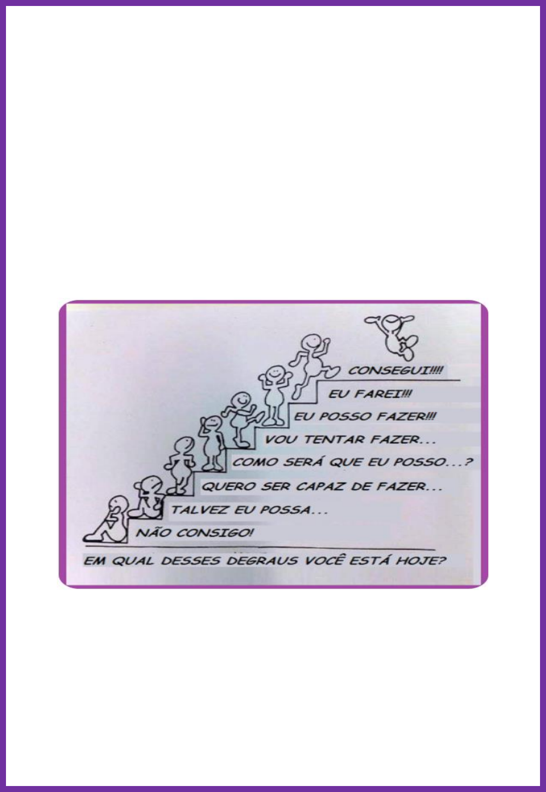 TUTORIA – 11/05/2022 – Prof.ª - Denise Estácio Nome:______________________________________série_______ “O degrau de uma escada não serve simplesmente para que alguém permaneça em cima dela, destina-se a sustentar o pé de um homem pelo tempo suficiente para que ele coloque o outro um pouco mais alto.” Thomas Huxley Reflexão da frase: É possível levantar diversas reflexões a partir dessas poucas palavras. Pense comigo! Quando estamos subindo alguma escada colocamos um pé enquanto vamos subindo o próximo para o degrau superior. Nesse processo fazemos um esforço para vencer a força da gravidade que nos empurra pra baixo. Enquanto estamos levantando o pé, o degrau atual assegura que estejamos nele durante o tempo de subida para o próximo degrau. Na vida acontece a mesma coisa! Só é possível alcançar o degrau superior depois que tivermos vivenciado tudo aquilo que precisávamos vivenciar no degrau atual. Essa elevação de degraus é a elevação da nossa consciência e da nossa própria maturidade na vida! É mais ou menos assim, os primeiros degraus representam aquilo que vivenciamos na infância. Temos diversas experiências, mas aos poucos vai surgindo o desejo de ir além, de enxergar um pouco mais e tentar algo mais difícil. Numere os degraus de baixo para cima e escreva como fara para subi - los. ___________________________________________________________________________ ___________________________________________________________________________ ___________________________________________________________________________ ___________________________________________________________________________ ___________________________________________________________________________ ___________________________________________________________________________ ___________________________________________________________________________ ___________________________________________________________________________