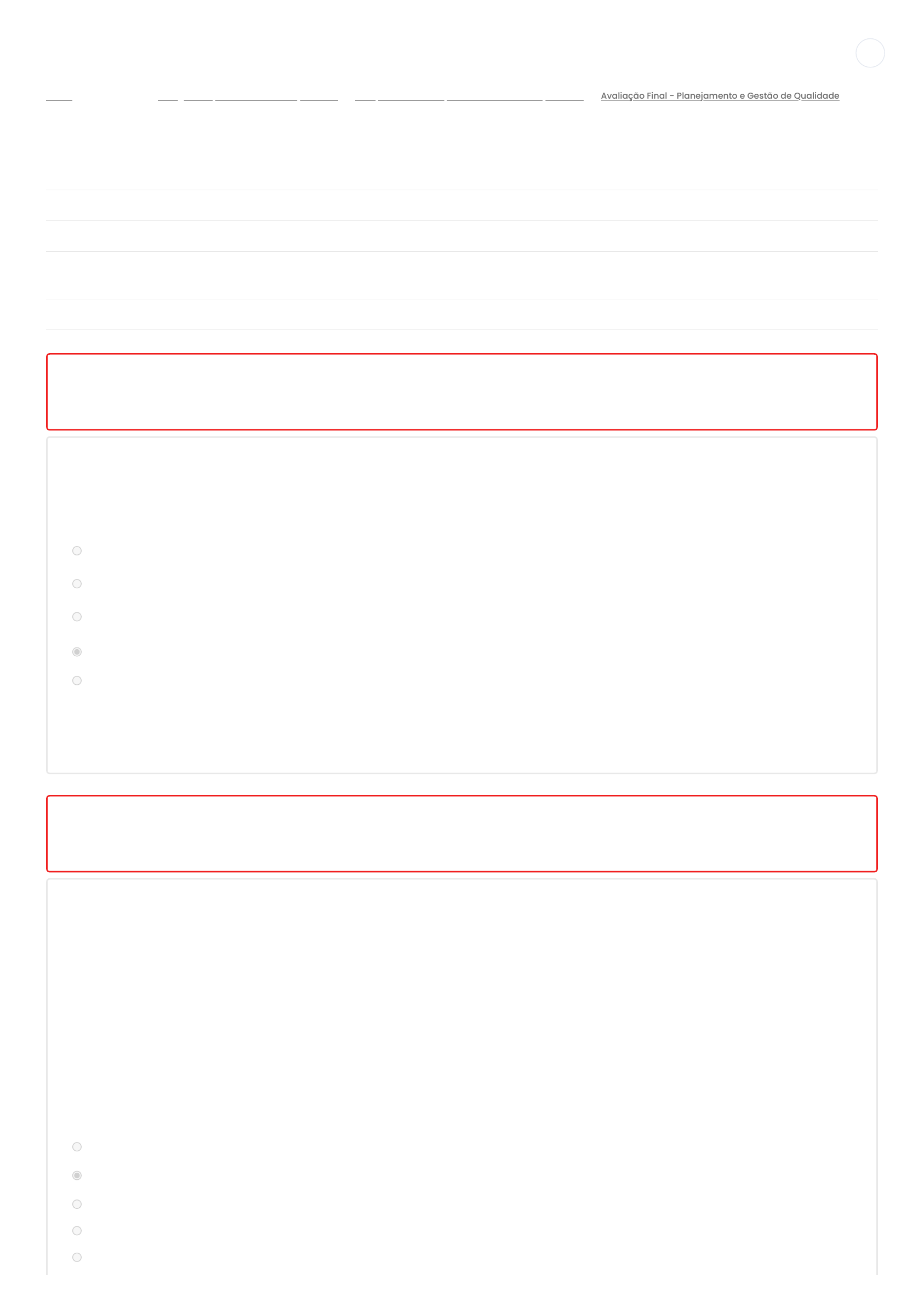 21/07/2022 20:53 Avaliação Final - Planejamento e Gestão de Qualidade: Revisão da tentativa https://ava.cenes.com.br/mod/quiz/review.php?attempt=25812&cmid=1990 1/4 - Meus cursos - - - Painel Pós-graduação em Gestão da Qualidade Disciplina 06 - Planejamento e Gestão da Qualidade Avaliação Final - Planejamento e Gestão de Qualidade Iniciado em Wednesday, 15 Jun 2022, 19:57 Estado Finalizada Concluída em Wednesday, 15 Jun 2022, 19:58 Tempo empregado 36 segundos Avaliar 1,0 de um máximo de 10,0(10%) Questão 1 Incorreto Atingiu 0,0 de 1,0 Para que a mudança dentro das organizações ocorra de forma efetiva e concreta, deve passar por alguns passos. O primeiro deles é o diagnóstico da situação atual e a definição de onde se quer chegar. Sobre o diagnóstico na gestão de mudança é correto afirmar: a. Sensibilizar os colaboradores e demais envolvidos com a empresa é uma das etapas do diagnóstico, pois eles também fazem parte da mudança. b. O diagnóstico é um processo de pouca importância, pois a fase mais importante é colocar as mudanças em prática. c. O diagnóstico deve ter um grau de análise mediano, já que é impossível pensar em todas os aspectos que influenciam uma organização d. A cultura organizacional tem pouca influência no processo da gestão da mudança. e. Deve ser feito um estudo dos elementos internos, que são os únicos que influenciam os processos organizacionais. A resposta correta é: Sensibilizar os colaboradores e demais envolvidos com a empresa é uma das etapas do diagnóstico, pois eles também fazem parte da mudança. Questão 2 Incorreto Atingiu 0,0 de 1,0 A TQM é uma abordagem que coloca a qualidade no coração de tudo que é feito por uma operação e inclui todas as atividades dentro de uma operação. Essa totalidade pode ser resumida pela forma que a TQM aborda os seguintes temas (SLACK; BRANDON-JONES; JOHNSTON, 2015): I – Atendimento das necessidades dos fornecedores. II – Inclusão de todos os clientes da organização. III – Exame de todos os custos relacionados com a qualidade, especialmente o custo de falhas. IV- Fazer “as coisas certo da primeira vez”, por exemplo, ressaltando a constituição da qualidade e não apenas a sua inspeção. V – Desenvolvimento de um processo de melhoria contínua. Dentre as assertivas anteriores, podemos considerar que estão corretas: a. I, III e V. b. I, II e IV. c. I, II e III. d. III, IV e V. e. II, IV e V. https://ava.cenes.com.br/my/ https://ava.cenes.com.br/course/view.php?id=14 https://ava.cenes.com.br/course/view.php?id=14§ion=9 https://ava.cenes.com.br/mod/quiz/view.php?id=1990 21/07/2022 20:53 Avaliação Final - Planejamento e Gestão de Qualidade: Revisão da tentativa https://ava.cenes.com.br/mod/quiz/review.php?attempt=25812&cmid=1990 2/4 A resposta correta é: III, IV e V. Questão 3 Incorreto Atingiu 0,0 de 1,0 As perdas devido ao fraco desempenho e à falta de qualidade podem representar de 20% a 30% das vendas brutas. Tanto as ações de melhoria da qualidade quanto a falta de ações no mesmo sentido podem gerar custos indesejáveis para a empresa, como, por exemplo: a. Custos de Prevenção e Avaliação. b. Custos de Auditorias e Certificação. c. Custos de Falhas Externas e Avaliação. d. Custos de Falhas Internas e Externas. e. Custos de Falhas Internas e de Prevenção. A resposta correta é: Custos de Falhas Internas e Externas. Questão 4 Incorreto Atingiu 0,0 de 1,0 Na nova versão da ABNT NBR ISO 26000:2010, são apresentados sete princípios da Responsabilidade Social (RS), que, em conjunto com as práticas e os temas centrais descritos na norma, constituem a base para a implementação prática da RS pela organização e sua contribuição para o desenvolvimento sustentável. De acordo com o trecho anterior, qual das alternativas a seguir representa os direitos humanos? a. Legalidade, direitos sociais e comportamento ético. b. Responsabilidade, direitos sociais e transparência. c. Transparência, direitos culturais e comportamento ético. d. Direitos econômicos, sociais e culturais. e. Comportamento ético, direitos econômicos e responsabilidade. A resposta correta é: Direitos econômicos, sociais e culturais. Questão 5 Correto Atingiu 1,0 de 1,0 O desenvolvimento sustentável é alcançado quando três dimensões, conhecidas também como pilares, atuam de forma integrada. Ele pode ser aplicado de forma micro (como, por exemplo, em uma empresa familiar) ou macro (aplicável a ações a serem desenvolvidas pelo país). Considerando o que foi dito anteriormente, qual das seguintes alternativas contém os aspectos que constituem o tripé da sustentabilidade? a. Econômico, cultural e ambiental. b. Ambiental, econômico e social. A atual concepção de tripé do desenvolvimento sustentável está alicerçada nos pilares econômico, ambiental e social. Alguns autores têm incluído aspectos culturais, tecnológicos e políticos a fim de complementar a questão da sustentabilidade como um todo. c. Social, político e tecnológico. 21/07/2022 20:53 Avaliação Final - Planejamento e Gestão de Qualidade: Revisão da tentativa https://ava.cenes.com.br/mod/quiz/review.php?attempt=25812&cmid=1990 3/4 , p g d. Social, tecnológico e econômico. e. Ambiental, político e econômico. A resposta correta é: Ambiental, econômico e social. Questão 6 Incorreto Atingiu 0,0 de 1,0 Paulo possui uma empresa de brinquedos infantis e fabrica bonecos para crianças de até 3 anos. Clara comprou para a sua filha uma boneca e deu para que esta brincasse. Porém, percebeu que a mão da boneca se soltava com facilidade no momento em que sua filha estava quase engolindo a peça. Com base nessa situação, pode-se afirmar que: a. a responsabilidade pelo risco é de Paulo. b. por se tratar de uma criança, a responsabilidade é dos pais. c. é preciso responsabilizar Paulo e os pais de Clara. d. o problema deveria ser identificado com o brinquedo ainda na embala