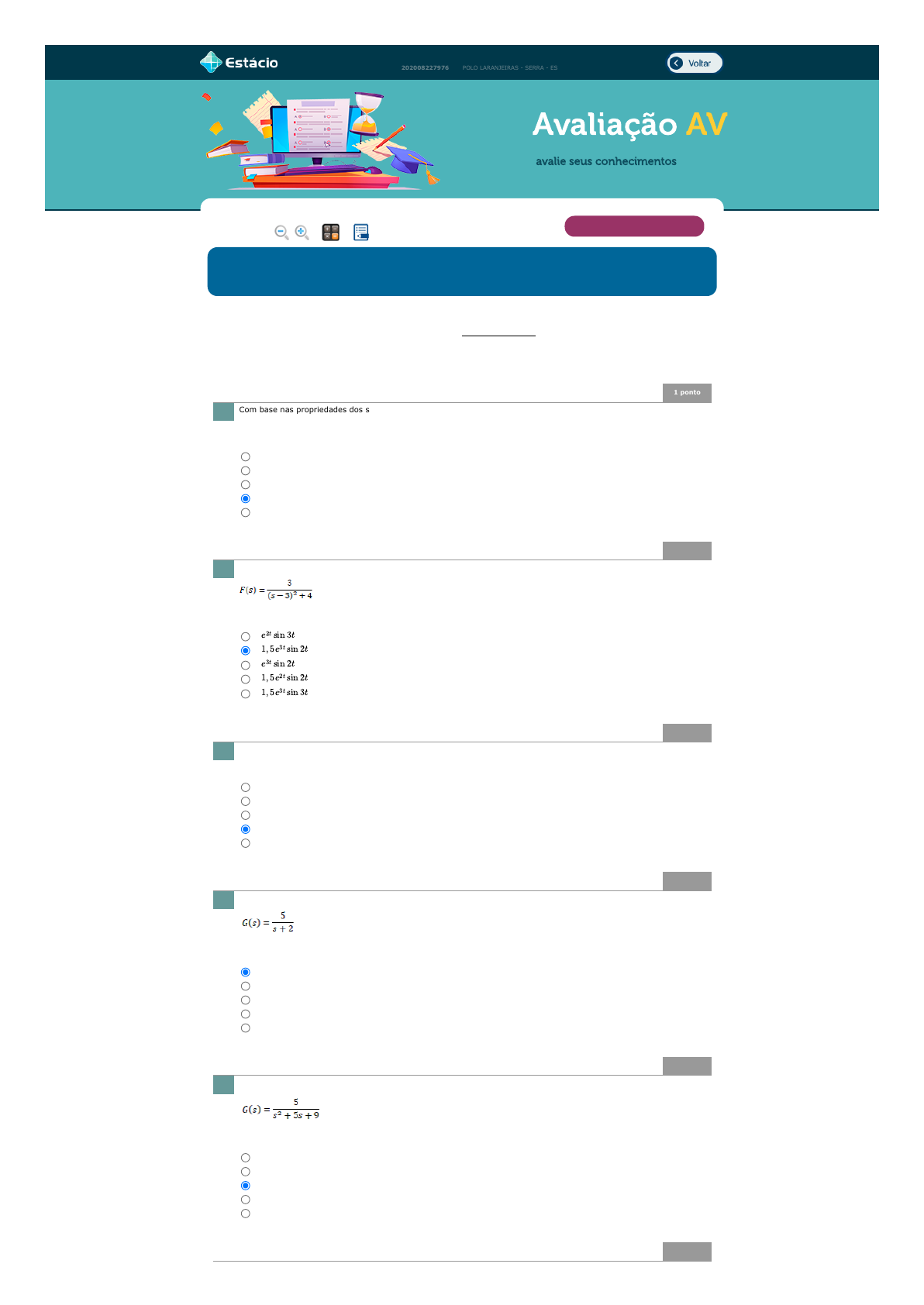23/09/2022 14:03 EPS https://simulado.estacio.br/alunos/ 1/3 MARCELO SANTOS DA SILVA Avaliação AV 202008227976 POLO LARANJEIRAS - SERRA - ES avalie seus conhecimentos 1 ponto Com base nas propriedades dos sistemas de controle, assinale a que NÃO corresponde a sistemas de controle em malha fechada quando comparados com sistemas de controle em malha aberta: (Ref.: 202011351117) 1 ponto Determine a transformada de Laplace inversa da função: (Ref.: 202011351120) 1 ponto Ache a função de transferência do sistema representado por: dy(t)/dt +2y(t) = x(t) (Ref.: 202011797381) 1 ponto Para a função de transferência abaixo, determine a constante de tempo, o tempo de subida e o tempo de acomodação. (Ref.: 202011351130) 1 ponto Assinale a alternativa que descreve corretamente o estado do sistema descrito pela função de transferência abaixo: (Ref.: 202011351137) 1 ponto Lupa Calc. Notas VERIFICAR E ENCAMINHAR Disciplina: EEX0034 - CONTROLE E SERVO Período: 2022.3 EAD (G) Aluno: MARCELO SANTOS DA SILVA Matr.: 202008227976 Turma: 9001 Prezado(a) Aluno(a), Responda a todas as questões com atenção. Somente clique no botão FINALIZAR PROVA ao ter certeza de que respondeu a todas as questões e que não precisará mais alterá-las. Para questões de múltipla escolha, marque a única opção correta. Valor da prova: 10 pontos. 1. Maior imunidade a ruídos. Maior largura de faixa. Maior precisão. Menor tendência a oscilar. Mais sensível a não linearidades. 2. 3. 2s s2 es 1/(s + 2) 1/s 4. 0,5s; 1,1s e 2,0s 1,1s; 0,5s e 2,0s 0,5s; 0,5s e 1,1s 0,5s; 2,0s e 1,1s 1s; 2,0s e 1,1s 5. O sistema é marginalmente estável. Não é possível determinar. O sistema é estável com polos complexos. O sistema é instável. O sistema é estável com polos reais. e2t sin 3t 1, 5e3t sin 2t e3t sin 2t 1, 5e2t sin 2t 1, 5e3t sin 3t javascript:voltar(); javascript:diminui(); javascript:aumenta(); javascript:calculadora_on(); javascript:anotar_on(); 23/09/2022 14:03 EPS https://simulado.estacio.br/alunos/ 2/3 Determine para qual faixa de valores de K o sistema cuja função de transferência em malha fechada dada abaixo é estável: (Ref.: 202011351144) 1 ponto Encontre o erro estacionário para a entrada em degrau unitário. (Ref.: 202011351151) 1 ponto Para o sistema com realimentação unitária dado pelo diagrama em blocos abaixo: Determine os ângulos das assíntotas com o eixo real do LGR do sistema. (Ref.: 202011351157) 1 ponto (Ref.: 202011351164) 1 ponto 6. K > 2 K > -1 Não existe valor de K que torna o sistema estável. K > 1 K > 0 7. 2 1 -1 0 -2 8. +45° e -45° 0° e 180° +90° e +180° +60° e -60° +90° e -90° 9. 10. 160√10 180√10 150√10 170√10 190√10 23/09/2022 14:03 EPS https://simulado.estacio.br/alunos/ 3/3 Considere o sistema de controle em malha fechada ilustrado na figura acima, onde K > 0 representa o ganho a ser ajustado no compensador. Determine a faixa de valores de K que torna o sistema é estável. (Ref.: 202011351169) Não existe valor de K que torna o sistema estável. VERIFICAR E ENCAMINHAR Legenda: Questão não respondida Questão não gravada Questão gravada K > 20 K > 50 K > 40 K > 30 javascript:abre_colabore();