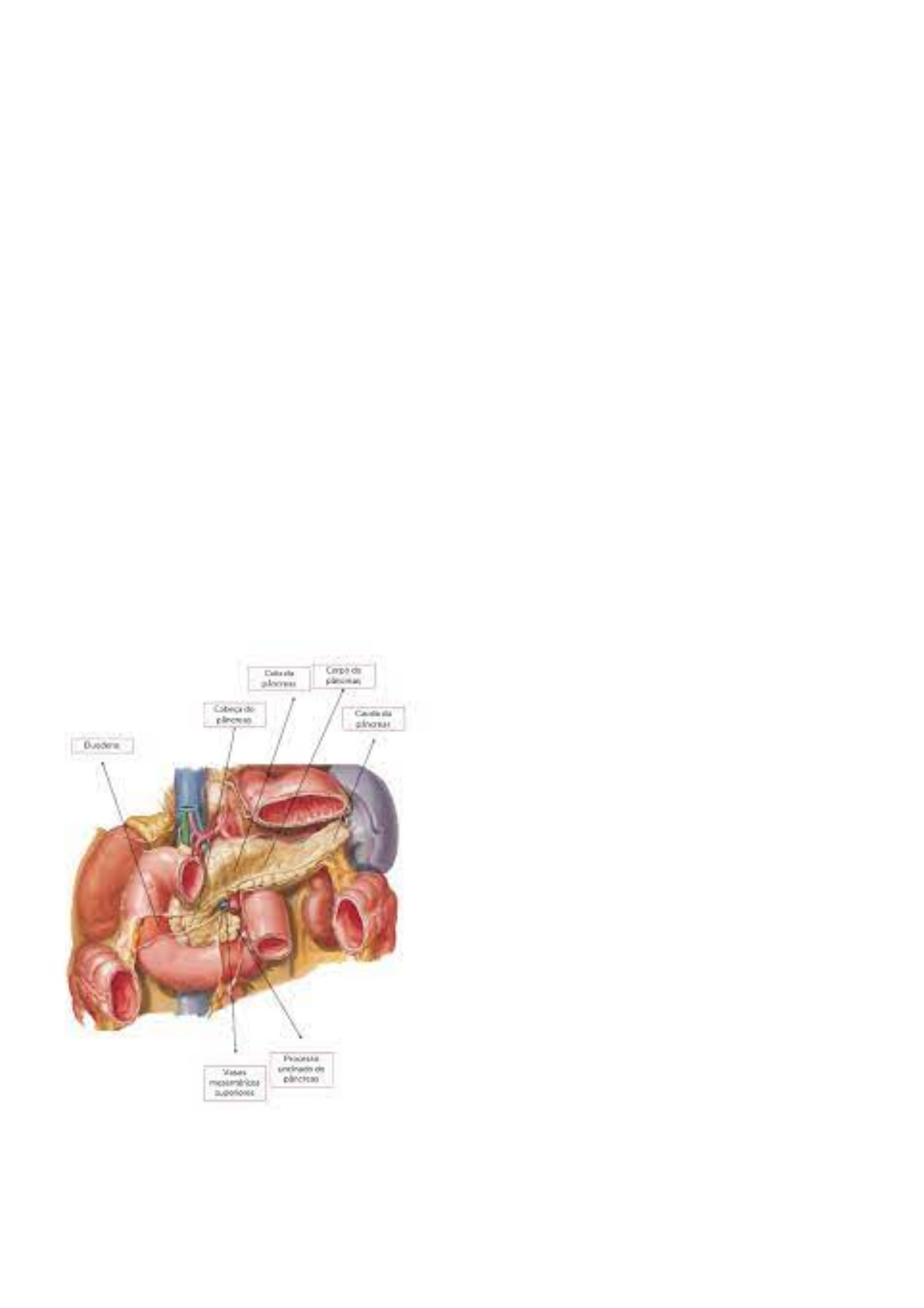 Páncreas Es una glándula mixta: presenta secreción endocrina y exocrina. Secreción endocrina = libera en el torrente sanguínea insulina, glucagón y polipéptido pancreático. Secreción exocrina = libera jugo pancreático al tubo digestivo (duodeno) para la digestión. Órgano profundo en la cavidad abdominal, prevertebral, por delante de los grandes vasos (la vena cava inferior y la aorta abdominal, a la altura de las vértebras L1 y L2 y por detrás del estómago. Es una glándula de color blanco lobulado, presenta una forma alargada, aplastada en sentido antero-posterior. Mide unos 18cm (largura) x 4cm (altura) x 2cm (gruesor). Es subdividido en 4 partes: cabeza, cuello, cuerpo y cola. Parenquima pancreático: está constituido por los islotes de Langerhans y los acinos . Los islotes de Langerhans: son encargados de la función endocrina (secreción hormonal). Los acinos: cumplen la función exocrina secretando el jugo pancreático por medio de un conjunto de conductillos hasta el conducto colector principal. Conducto pancreatico principal ( Wirsung): mide unos 15cm; inicia en la cola y sigue el eje mayor del cuerpo; en el cuello se angula hacia abajo; se abre en la papila duodenal mayor (la cara interna de segunda porción del duodeno). Conducto pancreatico accessorio (Santorini): es más pequeño , nace del codo que forma el principal por encima de ello; desemboca en la papila duodenal menor (2 o 3cm por encima de la mayor). Cabeza del páncreas: se encuentra abrazado por las porciones del duodeno. En su borde superior se apoya la primera parte del duodeno y en su borde inferior hay una proyección llamada de gancho que suele pasar por detrás y por debajo de los vasos mesentéricos superiores, pero el gancho puede ser cambiado a depender de cada persona. SIMBIOSIS DUODENO-PANCREAS: Los dos esbozos pancreáticos nacen del endodermo duodenal (embriologica). Las secreciones pancreáticas (jugo pancreático con sus enzimas) se vuelcan en el duodeno (fisiologica). El duodeno envolve la cabeza del páncreas y los conductos pancreáticos desembocan en ello; y la irrigación por parte de los vasos duodenales (anatomica).