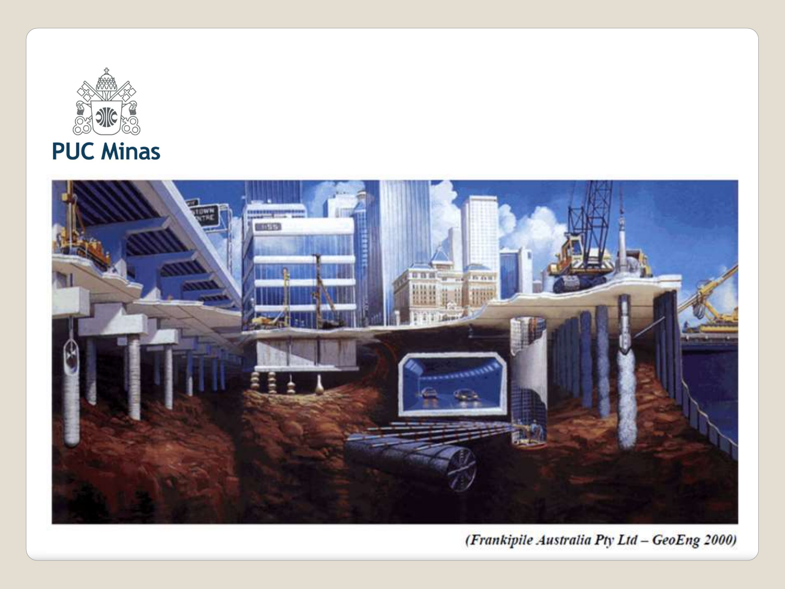 ESTRUTURAS DE FUNDAÇÕES E CONTENÇÕES AULAS 08 e 09 CURSO DE ENGENHARIA CIVIL Planejamento da Aula Projeto de fundações profundas • Tubulão a Céu Aberto • Tubulão a Ar Comprimido FUNDAÇÕES PROFUNDAS Tubulão a céu aberto: Os Tubulões são elementos estruturais de fundação com grande capacidade de carga devido a sua base poder ser alargada na cota de assentamento. Os tubulões serão armados no fuste e na base se caso for necessário (ver tabela 4 da norma 6122 a seguir – Tensão de compressão simples atuante abaixo da qual não é necessário armar). Além disso, também necessitarão de armaduras se caso estiverem expostos a alguma outra carga além da vertical tais como momento, flambagem e cargas horizontais. Geralmente, os tubulões a céu aberto são executados acima do lençol freático, em alguns casos especiais o tubulão a céu aberto pode ser executado em solos saturados, porém, o tipo de solo deve permitir o bombeamento da água sem que haja desmoronamento das laterais. Tubulão Obs: Não se deve confundir bloco de capeamento (ou coroamento) com bloco de fundação. Os blocos de coroamento são os construídos sobre estacas ou tubulões, sendo os mesmos armados de modo a poder transmitir a carga dos pilares para as estacas ou os tubulões. Fonte: Escola Engenharia Fonte: Total Construções (2020) Construção de Tubulão Fonte: Meia Colher (2015) Processo de execução de tubulão a céu aberto Tipos de modelo de base: • Circular: Utilizada quando não há restrições de espaços para abertura da base. Tipos de modelo de base: • Falsa Elipse: Utilizada quando há alguma limitação de espaço para a abertura da base. Dimensionamento do Tubulão a céu Aberto: Para calcular a área da base do tubulão pode-se utilizar a mesma formulação utilizada em sapatas, ou seja: σs = P/A Se a base estiver formato circular a área é calculada da seguinte maneira: Se a base estiver formato de uma elipse a área é calculado da seguinte maneira: O fuste, normalmente, é de seção circular, adotando-se 70 cm como diâmetro mínimo pela NBR 6122, e 90 cm pela NR18 para permitir a entrada e saída de operários, porém a projeção da base poderá ser circular ou em forma de falsa elipse, neste caso, a relação a/b deverá ser menor ou igual a 2,5. a = x + b 5 cm 65 cm b/2 = 65 cm portanto, b = 130 cm • Cálculo da altura da base. O valor da altura total deverá ser no máximo 2 m (H=1,8 m + rodapé= 0,2 m). A altura H poderá ser maior desde que sejam tomados cuidados especiais para garantir a estabilidade do solo. Por exemplo, escoramentos de madeira. Base circular Base elipse Nota da norma NBR-6122 sobre o ângulo de 60°e a base de 20 cm. Nota: O ângulo indicado nesta Figura deve ser tal que as tensões de tração que venham a ocorrer no concreto possam ser absorvidas por este material. Quando, por alguma razão, for preciso adotar um ângulo menor que o indicado, deve-se armar a base do tubulão. Desde que a base esteja embutida no material idêntico ao de apoio, no mínimo 20 cm, um ângulo igual a 60º pode ser adotado, independentemente da taxa, sem necessidade de armadura. Dimensionamento do Fuste: Em casos de tubulão a Norma NBR-6122 não considera o atrito lateral do fuste, porém, também não considera o peso próprio do tubulão. Para o cálculo do diâmetro do fuste a Norma NBR- 6122 solicita que a tensão de compressão deve ser minorada pelos seguintes coeficiente: Onde, a tensão do concreto é: Onde, o diâmetro do fuste é calculado através da fórmula: σc = P/A (eq.I) (eq.II) 𝒄 (eq.I e II) A norma NBR-6122 indica que o fck mínimo seja 14 MPa. EXERCÍCIOS DIMENSIONAMENTO GEOMÉTRICO DE TUBULÃO Deseja-se encontrar as dimensões do tubulão b = valor “estimado” σs + bx 𝒄𝒌 𝒇 𝒄 ALTERAÇÕES IMPORTANTES DA NORMA 6122 = 2,2 e Asmin=0,4% . Af ALTERAÇÃO DA NORMA NR 18 DIÂMETRO MÍNIMO O FUSTE: 90cm Exemplo de dimensionamento: Dimensionar um tubulão para suportar uma carga de 1150 kN de um pilar de 20 x 40 cm. Este pilar esta próximo da divisa e como já se sabe nenhum tipo de fundação pode invadir o terreno do vizinho. Dados: Tensão do solo: 0,5 MPa = 500 kN/m2 fck = 25 MPa 85 cm Resolução do Exercício: • Cálculo da área da base: σs = P/A A=P/σs; onde: Portanto, P/ σs = π.D²/4, isolando d, tem-se: D Substituindo os valores da tensão admissível do solo e carga do pilar, tem-se o diâmetro da base. D 𝟏𝟏𝟓𝟎∗𝟒 𝟓𝟎𝟎∗𝝅 Dividindo o diâmetro por dois temos o valor do raio e comparando o valor do raio com a distância do eixo do pilar é possível saber se a base do tubulão ultrapassará a divisa. Comparando os valores tem-se que 85,5 cm > 70 cm, portanto, o tubulão com base circular acabará invadindo o terreno do vizinho. Como visto a base circular do tubulão não será possível ser executada, neste caso, o tubulão é dimensionado com base de elipse. P/ σs = π.b²/4 + bx b pode ser tomado como: b = 2.(70 - 5) = 2. 65 = 130 cm Portanto: X = 0,75 m = 75 cm Como a = 75 + 130 = 205 cm = 2,05 m • Cálculo do diâmetro do fuste: 𝒄 𝟎,𝟖𝟓.𝒇𝒄𝒌 𝜸𝒇.𝜸𝒄 𝒄 𝟎,𝟖𝟓∗𝟐𝟓 𝟏,𝟒∗𝟐,𝟐 𝒄 Onde: 𝒇 𝒄 (tab. 4 NBR 6122:2019) 𝑷.𝟒 𝝈𝒄.𝝅 𝟏𝟏𝟓𝟎∗𝟒 𝟔𝟗𝟎𝟎∗𝝅 < 90cm Como o diâmetro calculado é menor que mínimo exigido pela 6122 (80 cm) e a NR 18 (90cm), adota-se 90cm. • Cálculo da altura da base do tubulão: Detalhamento do tubulão EXERCÍCIO 1 Dimensionar geometricamente e estruturalmente, o tubulão circular para a carga de 95 tf e um solo de taxa igual a 2,5 kgf/cm². Calcular a carga total na base do tubulão e verificar a condição de estabilidade. Concreto usado fck = 250 kgf/cm² (25 MPa) Peso específico do concreto armado: 2,5 t/m³ Bloco 90 x 90 / 90 Comprimento igual a 6m. A dimensão do bloco sempre acompanha o fuste do tubulão. Solo argiloso (estável) Considerar: 𝐬
