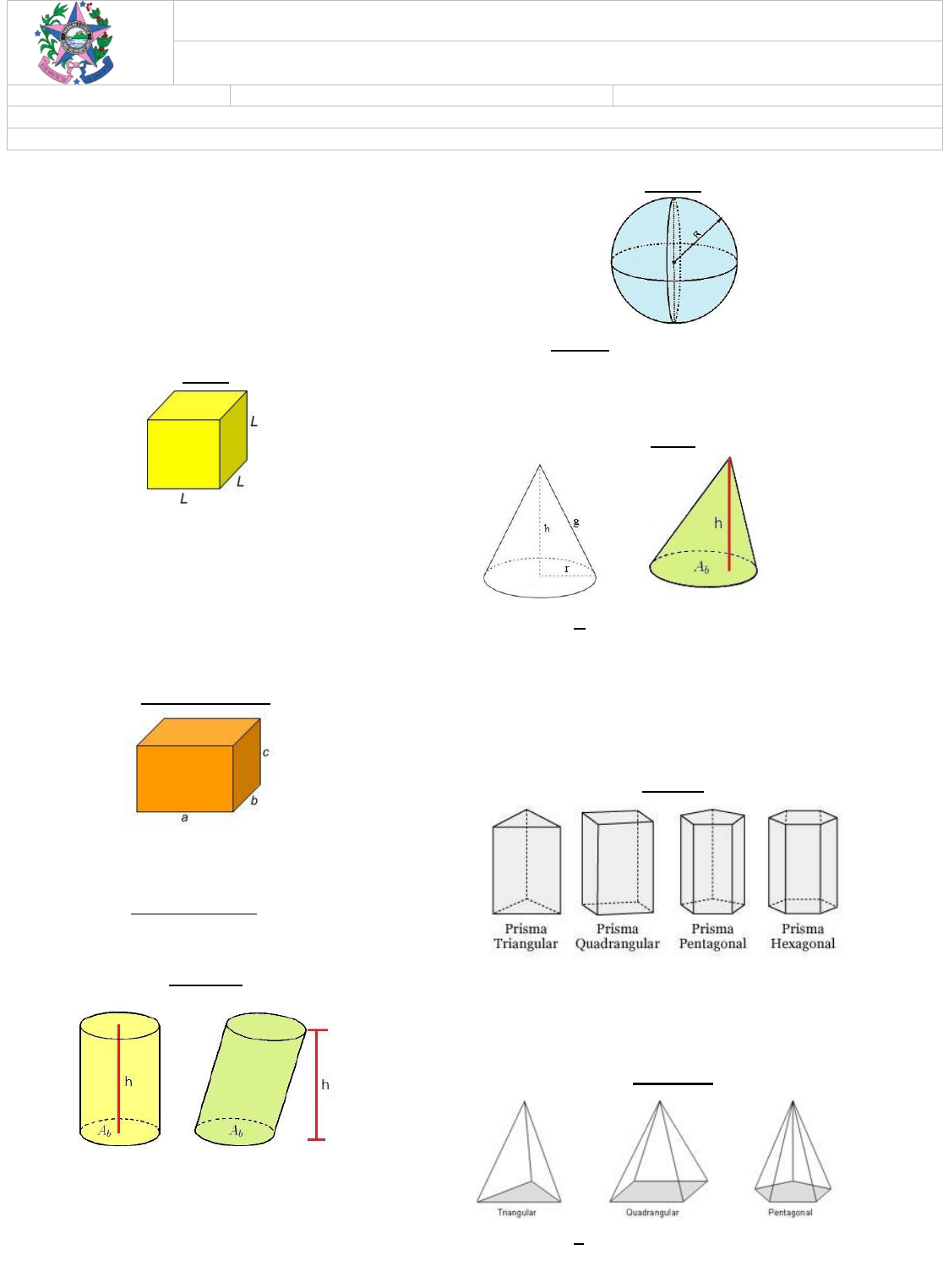 CENTRO ESTADUAL DE ENSINO MÉDIO EM TURNO INTEGRAL – PAULO FREIRE Disciplina: Matemática (3º Trimestre) Série: 2º E.M. Turno: Matutino/ Vespertino PFA: Renata Pereira PFA - Programa de Fortalecimento da Aprendizagem Conteúdo: DM 84 Volume de Sólidos Geométricos É a medida que representa o espaço que o sólido geométrico ocupa. Os principais sólidos geométricos são os cubos, paralelepípedos, prismas, as pirâmides, o cone, o cilindro e a esfera, e cada um deles possui fórmulas específicas para o cálculo do volume. Cubo Volume = L x L x L ➔ Volume = L3 Alateral = 4L2 Abase = L2 Atotal = 6 x L2 DLateral: d = L√2 DCubo: d = L√3 Paralelepípedo Volume = a x b x c Abase = a x b ATotal = 2ab+2bc+2ac Diagonais = √𝒂² + 𝒃² + 𝒄² Cilindro Volume = Abase x h Abase= π x r2 Alateral= 2 π x r x h Atotal= 2Abase + Alateral Esfera Vesfera = 𝟒 𝝅 𝒙 𝒓³ 𝟑 Aesfera = 4 x π x r2 Cone Volume = 𝟏 𝟑 π x r2 x h Abase = π x r2 Alateral = π x r x g Atotal = π x r (g + r) Prisma V = Abase x h Alateral = n x a Atotal = Alateral + 2Abase Pirâmide Volume = 1 3 Abase x h Atotal: Alateral + Abase https://www.infoescola.com/geometria-espacial/cubo-e-paralelepipedo/ https://www.infoescola.com/geometria-espacial/cilindro/ https://www.infoescola.com/geometria-espacial/prisma/ https://www.infoescola.com/geometria-espacial/piramide/ https://www.infoescola.com/wp-content/uploads/2007/02/volume-solidos-geometricos-cubo.jpg https://www.infoescola.com/wp-content/uploads/2007/02/volume-solidos-geometricos-paralelepipedo.jpg https://www.infoescola.com/wp-content/uploads/2007/02/volume-solidos-geometricos-cilindro.jpg https://www.infoescola.com/wp-content/uploads/2007/02/volume-solidos-geometricos-esfera.jpg https://www.infoescola.com/wp-content/uploads/2007/02/volume-solidos-geometricos-cone.jpg