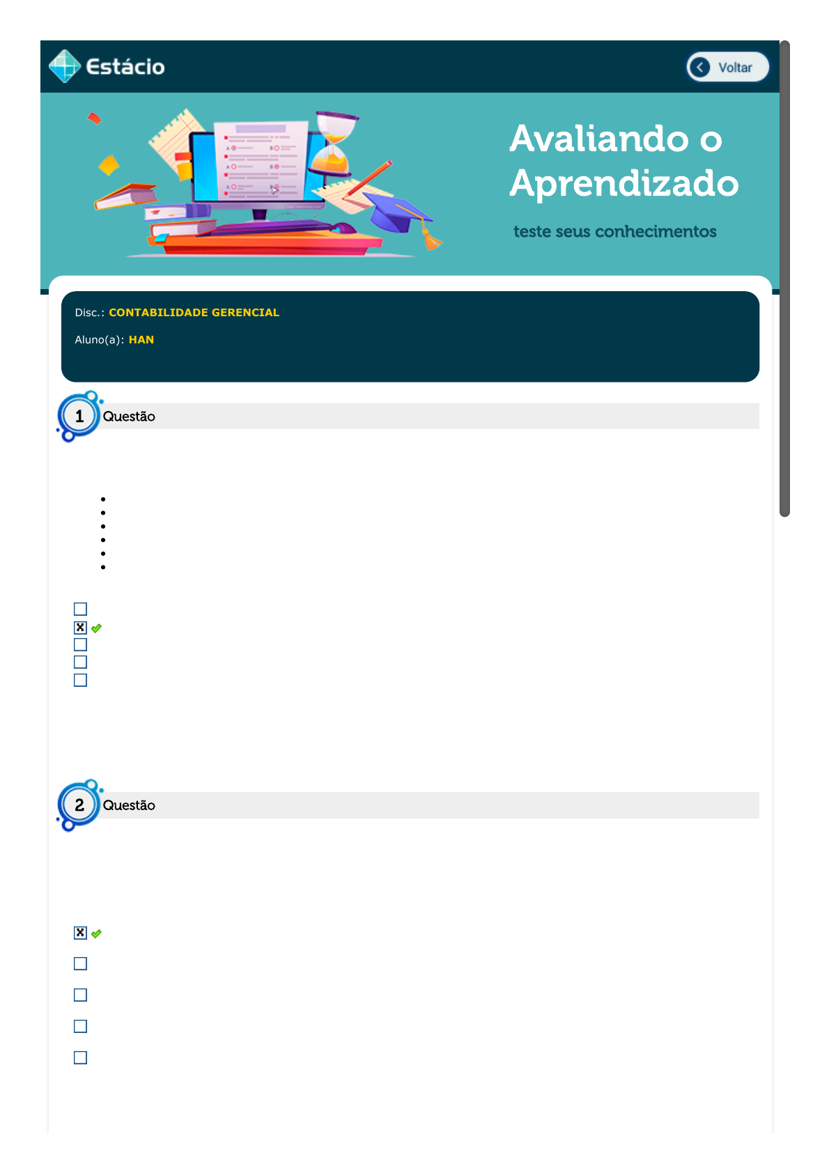 22/11/2022 16:04 Estácio: Alunos https://simulado.estacio.br/alunos/ 1/1 Avaliando o Aprendizado teste seus conhecimentos Disc.: CONTABILIDADE GERENCIAL Aluno(a): HANNY RODRIGUES DA COSTA Matríc.: 202009181589 Acertos: 0,4 de 0,5 sexta-feira, 11 de novembro de 2022 (Finaliz.) Acerto: 0,1 / 0,1 Analisando as informações do setor contábil, a empresa Alfa S/A deseja saber qual seu ponto de equilíbrio contábil, a margem de contribuição, e o resultado apurado respectivamente, tendo os seguintes dados: Custos fixos: $340.000 Custos variáveis: $50/unidade Preço de venda: $ 150/unidade Custo de oportunidade: $ 30.000 Parcela não desembolsada dos custos: $ 20.000 Receita atual: $ 600.000 2.000 - 200.000 - 40.000 3.400 - 400.000 - 60.000 3.000 - 2.500 - 50.000 2.500 - 500.000 - 40.000 5.000 - 350.000 - 45.000 Respondido em 15/11/2022 19:10:04 Compare com a sua resposta: Acerto: 0,1 / 0,1 A análise do custo x volume x lucro é um estudo financeiro que demonstra a taxa de lucratividade da empresa sobre o aspecto da produção, ou seja, é uma análise que demonstra a lucratividade do negócio baseado no volume produzido e o montante de custos totais necessários para a produção de determinado lucro. Baseada na análise das relações de Custo x Volume x Lucro, pode-se afirmar que: Essa análise é baseada no custeio variável e, através dela, pode-se estabelecer qual a quantidade mínima que a empresa deverá produzir. Essa análise é baseada nas perdas o e, através dela, pode-se estabelecer qual a quantidade mínima que a empresa deverá produzir. Essa análise é baseada nas compras e, através dela, pode-se estabelecer qual a quantidade mínima que a empresa deverá produzir. Essa análise é baseada nas despesas e, através dela, pode-se estabelecer qual a quantidade mínima que a empresa deverá produzir. Essa análise é baseada nos investimentos e, através dela, pode-se estabelecer qual a quantidade mínima que a empresa deverá produzir. Respondido em 15/11/2022 19:20:33 C Questão1 Questão2 https://simulado.estacio.br/alunos/inicio.asp javascript:voltar();