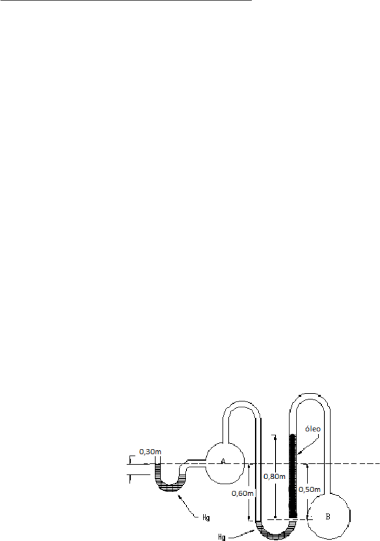 1-Prova de mecânica dos fluidos Aluno: data: / / 1- Uma pessoa faz duas afirmações: que a tensão de cisalhamento no centro de um tubo circular durante o escoamento laminar completamente desenvolvido é “zero” e que a tensão de cisalhamento é máxima na superfície do tubo. VOCÊ CONCORDA COM ISSO? JUSTIFIQUE SUA RESPOSTA. (1,0) 2- Explique conceitualmente o teorema de transporte de Reynolds e o que ele representa entre sistema e volume de controle. Quais propriedades ele correlaciona. (2,0) As equações básicas apresentadas envolvem a derivada temporal de propriedades extensivas do sistema: − Massa − Quantidade de movimento linear − Quantidade de movimento angular − Energia – Entropia °Relaciona derivadas de propriedades do sistema com a formulação de volume de controle 3- Um sistema de tubulação é usado para transportar água (A) e gás (B) conforme a figura abaixo. Sabendo que peso específico do óleo é 9613,4 N/m3e a gravidade especifica do Hg é SG=13,6, determine a pressão na tubulação A e B. (2,0) 4- Na figura uma placa de espessura desprezível e àrea=2m2, deloca-se com velocidade constante v=5m/s, na interface de dois fluidos, tracionada por uma força F=400N. Na parte superior o espaço entre a parede e a placa tem 1mm e o diagrama de velocidade é considerado linear. Na parte inferior, o perfil é dado pela equação v=ay2+by+c. Pede-se: (2,5) a) A tensão de cisalhamento na parte superior da placa em movimento b) A tensão de cisalhamento na parte inferior da mesma placa c) O perfil de velocidade acima da placa e abaixo d) A força R que mantem a placa da base em repouso 5- Um pequeno objeto redondo é testado num túnel de vento de 1 m de diâmetro. A pressão é uniforme nas seções 1(entrada) e 2(saída). A pressão a montante é de 20mm H2O (manométrica) , a pressão a jusante é 10 mm de H2O (manométrica) e a velocidade média do ar na entrada do tubo é de 10m/s. Após o ar passar pelo objeto redondo, um perfil de velocidade na seção 2 é formado e apresenta um comportamento linear com um eixo de simetria, onde a velocidade varia de zero no centro até uma velocidade máxima próximo a parede. Calcule a vazão em massa do túnel de vento, a velocidade máxima na seção 2 e o arrasto sobre o objeto e sua haste de sustentação. Despreze a resistência viscosa na parede do túnel. (2,5)
