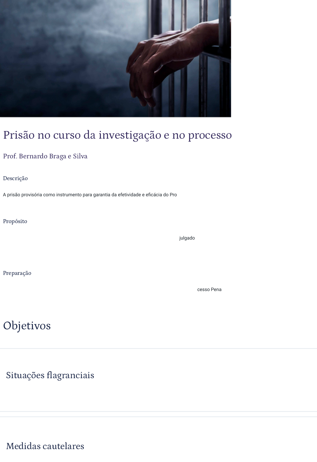 Prisão no curso da investigação e no processo Prof. Bernardo Braga e Silva Descrição A prisão provisória como instrumento para garantia da efetividade e eficácia do Processo Penal e as hipóteses de restituição da liberdade do acusado. Propósito A noção do conceito e das hipóteses de incidência das prisões antes do trânsito em julgado é fundamental para o futuro operador do Direito entender a diferença entre a prisão processual e a prisão como decorrência da sentença penal condenatória. Ademais, o estudo dos métodos de restituição da liberdade é essencial para seu manejo de forma adequada. Preparação É necessário ter em mãos para consulta a legislação processual penal, tanto o Código de Processo Penal, como a Constituição Federal e as leis processuais penais extravagantes, designadamente as seguintes Leis: nº 12.850/2013, nº 11.343, nº 8.072/1990 e nº 13.869/2019. Objetivos Módulo 1 Situações �agranciais Reconhecer as situações flagranciais e as etapas da prisão em flagrante. Módulo 2 Medidas cautelares Analisar as medidas cautelares pessoais previstas em nosso ordenamento jurídico. Módulo 3 Restituição de liberdade Aplicar os métodos de restituição de liberdade apresentados frente às hipóteses prisionais existentes. 1 - Situações �agranciais Ao �nal deste módulo, você será capaz de reconhecer as situações �agranciais e as etapas da prisão em �agrante. Primeiras palavras O estudo das prisões antes do trânsito em julgado consiste em um dos maiores desafios do Processo Penal moderno, que busca um equilíbrio entre a necessidade de garantir os direitos individuais e o objetivo de se atingir maior efetividade à persecução penal. Assim, buscaremos apresentar as principais características da prisão em flagrante, da prisão preventiva e da prisão temporária como institutos processuais penais legítimos e em consonância com o princípio da presunção da inocência, sempre pontuando o perigo de se tornarem, no caso concreto, uma indevida antecipação de pena, inadmissível em nosso ordenamento jurídico. Introdução Prisão em �agrante Antes de iniciarmos o conceito, e para maior compreensão ao longo do módulo, acompanhe o vídeo a seguir, em que o professor Bernardo Braga discorre sobre o conceito da prisão em flagrante. O instituto da prisão em flagrante foi objeto de diferentes entendimentos, de acordo com o contexto social e histórico no qual foi aplicado. Antigamente, vigia a regra de que o indivíduo preso em flagrante deveria permanecer encarcerado ao longo de todo o processo, com exceção às hipóteses em que coubesse fiança para o delito ou houvesse excludente de ilicitude. Nesse sentido, entendia-se que o flagrante, por si só, configurava fundamento para a manutenção ad aeternum (para sempre) da prisão, configurando verdadeira presunção da culpa do agente. No entanto, com o advento da Lei 6.416/77, que incluiu o parágrafo único ao art. 310, do Código de Processo Penal, alterou-se significativamente o entendimento da prisão em flagrante. Consolidou-se a tese de que, não havendo razão cautelar para a manutenção da prisão do indivíduo, a liberdade provisória deveria ser concedida ao custodiado. Nossa Constituição Federal de 1988, em seu art. 5º, inciso LXI, previu expressamente o instituto ao estabelecer, que “ninguém será preso senão em flagrante delito ou por ordem escrita e fundamentada de autoridade judiciária competente, salvo nos casos de transgressão militar ou crime propriamente militar, definidos em lei”. Curiosidade O conceito de flagrante deriva de flagrare, que em latim significa “arder, queimar”, e adquiriu, na linguagem jurídica, a ideia de “infração que está sendo cometida ou acabou de ser”. Inclusive, o fato de o crime estar ocorrendo é o que justifica, por exemplo, a possibilidade de ingresso no domicílio para a execução da prisão até mesmo à noite e sem o consentimento do morador, na forma do art. 5º, XI, CF. Uma visão contemporânea do instituto aponta como suas principais funções: Impedir que o crime produza todos os seus efeitos. Possibilitar a produção imediata de provas que comprovem a suposta prática delitiva. Por essa razão, a maioria da doutrina atribui atualmente à prisão em flagrante a natureza de medida pré-cautelar, uma vez que atingidos tais fins, a manutenção da detenção do agente em razão do flagrante perdurará até a manifestação do magistrado, na forma do art. 310, CPP, em audiência de custódia. O juiz, então, decidirá se mantém a prisão ao agente em virtude da existência de perigo em sua soltura, oportunidade em que convolará o flagrante em prisão preventiva, ou se solta o agente, relaxando-lhe a prisão, ou concedendo-lhe liberdade provisória com ou sem fiança. g p p , g , p , p ç As hipóteses que autorizam a prisão em flagrante estão previstas no Código de Processo Penal, no art. 302 e em seus incisos. Vejamos a seguir quais são essas hipóteses e suas nuances: É importante destacar a configuração do flagrante em algumas espécies de crime. Na medida em que se considera crime permanente aquele cuja ação se prolonga e a execução se protrai no tempo, qualquer flagrante de crime permanente é um flagrante próprio, aplicando-se o art. 303, do Código de Processo Penal, que estabelece que “nas infrações permanentes, entende-se o agente em flagrante delito enquanto não cessar a permanência”. Os crimes habituais englobam condutas cujas realizações do ilícito pressupõem a prática de um conjunto de atos sucessivos, de modo que cada uma delas, isoladamente, não constitui ilícito penal. Crimes habituais Como exemplo, pode-se citar o curandeirismo (art. 284, do Código Penal), o exercício ilegal da medicina, arte dentária ou farmacêutica (art. 282, do CP). Existe divergência quanto à possibilidade de configuração de prisão em flagrante nessa espécie del