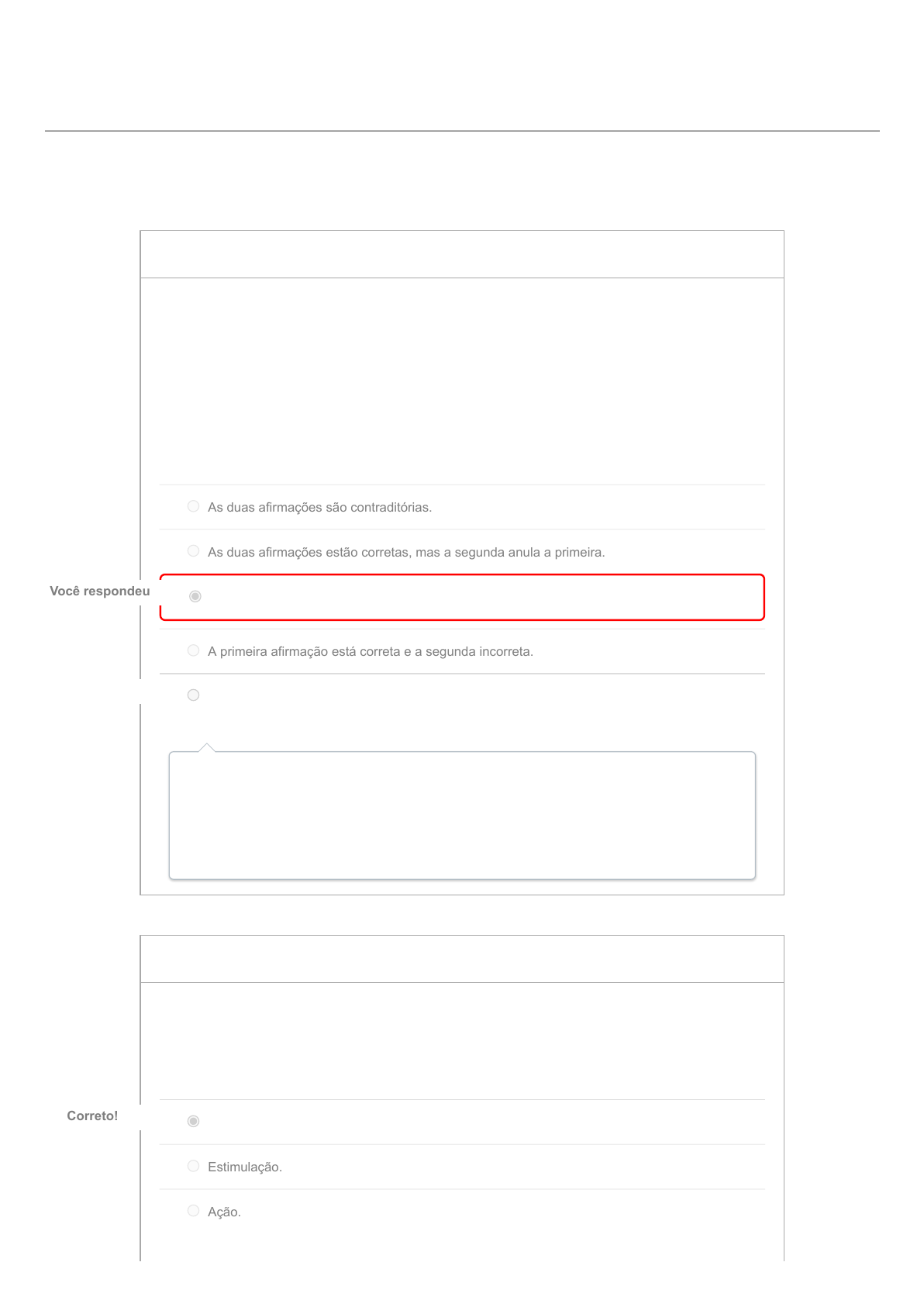 31/08/2022 22:47 ALEXSANDRO MOURA TONTINI, histórico de teste: Atividade: Unidade I https://cruzeirodosul.instructure.com/courses/30583/quizzes/65581/history?version=2 1/3 Atividade: Unidade I Resultados para ALEXSANDRO MOURA TONTINI Pontuação desta tentativa: 2 de 2,5 Enviado 30 ago em 14:04 Esta tentativa levou 20 minutos. 0 / 0,5 ptsPergunta 1 Leia as assertivas apresentadas a seguir: (1ª) A motivação é desenvolvida a partir da personalidade da pessoa. PORQUE (2ª) Algumas pessoas são mais motivadas do que as outras. Considerando as duas assertivas, assinale a alternativa correta: As duas afirmações são contraditórias. As duas afirmações estão corretas, mas a segunda anula a primeira. A primeira afirmação está incorreta e a segunda correta. Você respondeuVocê respondeu A primeira afirmação está correta e a segunda incorreta. As duas afirmações estão incorretas. Resposta corretaResposta correta É muito comum motivação ser interpretada como um traço de personalidade. Aqueles que entendem motivação como um traço de personalidade consideram que algumas pessoas podem ser mais motivadas do que outras. Todavia, essa é uma interpretação errada sobre o que é motivação. 0,5 / 0,5 ptsPergunta 2 A ideia de Ciclo Motivacional surge a partir de uma nova concepção de homem a partir do nascimento da Teoria das Relações Humanas. Uma determinada fase do ciclo interrompe o equilíbrio interno, tal fase é denominada: Tensão. Correto!Correto! Estimulação. Ação. 31/08/2022 22:47 ALEXSANDRO MOURA TONTINI, histórico de teste: Atividade: Unidade I https://cruzeirodosul.instructure.com/courses/30583/quizzes/65581/history?version=2 2/3 Finalização. Necessidade. Esse estímulo gera uma tensão, substituindo o estado anterior de equilíbrio por uma necessidade. 0,5 / 0,5 ptsPergunta 3 O Ciclo Motivacional pode desencadear três possíveis resultados da resposta do organismo à necessidade. Em um deles, ocorre uma diminuição da tensão, ainda que não sua completa eliminação. Tal resultado é denominado de: Frustração. Satisfação. Necessidade. Compensação. Correto!Correto! Acúmulo. Uma terceira possibilidade de solução é a compensação. Mesmo que não possa ter exatamente o que gostaria, consigo reduzir a tensão e, assim, evitar a frustração. 0,5 / 0,5 ptsPergunta 4 O Ciclo Motivacional pode desencadear três possíveis resultados da resposta do organismo à necessidade. Em um deles, a tensão é mantida e fica acumulada no organismo, mantendo-o em desequilíbrio. Tal resultado é denominado de: Acúmulo. Necessidade. Satisfação. Frustração. Correto!Correto! Compensação. 31/08/2022 22:47 ALEXSANDRO MOURA TONTINI, histórico de teste: Atividade: Unidade I https://cruzeirodosul.instructure.com/courses/30583/quizzes/65581/history?version=2 3/3 Quando não conseguimos satisfazer nossas necessidades, pode haver frustração. A frustração mantém a tensão, que fica acumulada no organismo, e ele permanece no estado de desequilíbrio interno. 0,5 / 0,5 ptsPergunta 5 A ideia de Ciclo Motivacional surge a partir de uma nova concepção de homem a partir do nascimento da Teoria das Relações Humanas. Uma determinada fase do ciclo é iniciada por uma ação quer interna, quer externa. Tal fase se refere: À necessidade. À tensão. Ao estímulo. Correto!Correto! Ao comportamento. Ao equilíbrio interno. O estímulo que dá origem à tensão pode ser interno ou externo. Pontuação do teste: 2 de 2,5