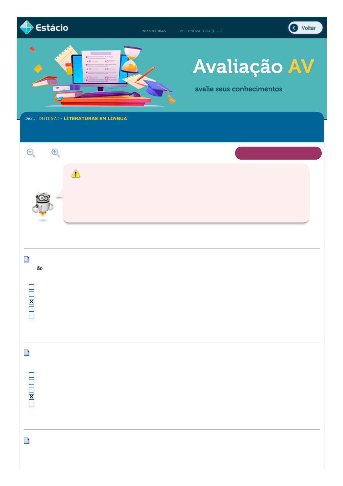 22/11/2022 23:35 EPS https://simulado.estacio.br/provas_emcasa_linear_preview.asp 1/3 DANIELLY PEREIRA ARÊAS COELHO Avaliação AV 201503384586 POLO NOVA IGUAÇU - RJ avalie seus conhecimentos Disc.: DGT0672 - LITERATURAS EM LÍNGUA PORTUGUESA Período: 2022.3 EAD (G) / AV Aluno: DANIELLY PEREIRA ARÊAS COELHO Matrícula: 201503384586 Data: 22/11/2022 23:35:52 Turma: 9001 Lupa RETORNAR À AVALIAÇÃO 1a Questão (Ref.: 201503559239) O não reconhecimento da Àfrica como um continente que possui seus valores, história, costumes e diferentes culturas, se deve ao: Renascimento Arcadismo Etnocentrismo Modernismo Cientificismo 2a Questão (Ref.: 201503563597) No contexto do proprium africano, qual a importância da figura do ¿velho¿? O ¿velho¿ é sempre o iniciado, sensitivo, que prevê os fatos que acontecerão no futuro. O ¿velho¿ representa a alegria da existência, considerando-se que ele perde a racionalidade sobre a existência. O ¿velho¿ é o guia espiritual de cada tribo, aquele que mantém contato com os espíritos ancestrais. O ¿velho¿ é o detentor da sabedoria que os anos de vida lhe proporcionaram. O ¿velho¿ representa a bondade e generosidade dos povos africanos. 3a Questão (Ref.: 201503559244) A África ainda é vista como um continente atrasado. Essa visão distorcida de África, que ainda permanece no imaginário do Ocidente, teve origem no: Atenção 1. Veja abaixo, todas as suas respostas gravadas no nosso banco de dados. 2. Caso você queira voltar à prova clique no botão "Retornar à Avaliação". 3. Não esqueça de finalizar a avaliação colocando o código verificador no campo no final da página. javascript:voltar_avaliacoes() javascript:diminui(); javascript:aumenta(); javascript:alert('C%C3%B3digo da quest%C3%A3o: 136195\n\nStatus da quest%C3%A3o: Liberada para Uso.'); javascript:alert('C%C3%B3digo da quest%C3%A3o: 140553\n\nStatus da quest%C3%A3o: Liberada para Uso.'); javascript:alert('C%C3%B3digo da quest%C3%A3o: 136200\n\nStatus da quest%C3%A3o: Liberada para Uso.'); 22/11/2022 23:35 EPS https://simulado.estacio.br/provas_emcasa_linear_preview.asp 2/3 Colonialismo Romantismo Realismo Arcadismo Modernismo 4a Questão (Ref.: 201503563621) Que característica fundamental possui a literatura angolana na fase anterior à libertação? A transposição de uma cultura portuguesa para Angola. A transposição de uma cultura angolana para Portugal. A invenção de um país livre, que em nada se assemelhe a Angola colonizada. A recuperação da força da oralidade, a fim de difundir ideais de liberdade. O uso da língua portuguesa, a fim de uma comunicação mais rápidas com os povos primitivos. 5a Questão (Ref.: 201503563625) Que fato histórico revela a obra "Quem me dera ser onda", do angolano Manuel Rui? A presença dos Estados Unidos na guerra colonial. A união de Angola e Moçambique contra os dominadores portugueses. A tentativa infrutífera de Cuba e da antiga União Soviética de estabelecer o comunismo nas nações africanas, motivo para que os dois países tivessem ajudado os africanos na guerra colonial. A diáspora africana. A invasão portuguesa no início do período colonial. 6a Questão (Ref.: 201503563894) Sobre a geração conhecida como ¿claridosa¿, podemos afirmar que: representou um divisor de águas entre a literatura colonial e um discurso identitário cabo-verdiano. imitou os modelos culturais europeus na literatura de Cabo Verde. não se estabeleceu como fundadora de uma literatura cabo-verdiana. não apresenta o africano negro como tema central de sua proposta. retomou o tema da escravidão. 7a Questão (Ref.: 201503563934) Considerando que cada colônia desenvolveu características específicas na formação de sua literatura, podemos afirmar que a literatura guineense tem como proposta: manter-se fiel à ideologia colonizadora. utilizar a paisagem como tema fundamental, a exemplo do romantismo brasileiro de José de Alencar. propor uma denúncia contra a colonização e celebrar a liberdade alcançada, a exemplo das outras literaturas africanas. manter a estética parnasiana adotada pela escritora Fernanda de Castro. renunciar aos valores culturais africanos para assumir a cultura europeia. 8a Questão (Ref.: 201503563992) javascript:alert('C%C3%B3digo da quest%C3%A3o: 140577\n\nStatus da quest%C3%A3o: Liberada para Uso.'); javascript:alert('C%C3%B3digo da quest%C3%A3o: 140581\n\nStatus da quest%C3%A3o: Liberada para Uso.'); javascript:alert('C%C3%B3digo da quest%C3%A3o: 140850\n\nStatus da quest%C3%A3o: Liberada para Uso.'); javascript:alert('C%C3%B3digo da quest%C3%A3o: 140890\n\nStatus da quest%C3%A3o: Liberada para Uso.'); javascript:alert('C%C3%B3digo da quest%C3%A3o: 140948\n\nStatus da quest%C3%A3o: Liberada para Uso.'); 22/11/2022 23:36 EPS https://simulado.estacio.br/provas_emcasa_linear_preview.asp 3/3 Após os anos 80, a literatura moçambicana se propõe à reflexão sobre a sociedade pós-colonial. A que conclusão chegam os autores, de forma consensual? Moçambique transformou-se em um país livre e próspero sem o domínio português. A guerra destruiu o país de forma a não ser possível uma reconstrução. Moçambique continua dividido pelas diferenças raciais. Moçambique enfrenta graves problemas sociais, que persistem apesar da independência. Moçambique alcançou um desenvolvimento econômico e social inigualável em toda a África. 9a Questão (Ref.: 201503564011) São objetivos principais do movimento de Negritude presente na literatura de São Tomé e Príncipe: Denunciar a exploração colonial e associar-se aos países não europeus. Identificar na constituição da raça negra outras origens, como a egípcia e a indiana. Denunciar os ideais do capitalismo e espalhar os ideais africanos pelo mundo. Denunciar a exploração colonial e capitalista e propor a irmandade entre os africanos espalhados pelo mundo. Isolar cada etnia em uma aldeia, a fim de que fossem preservados os valores autóctone