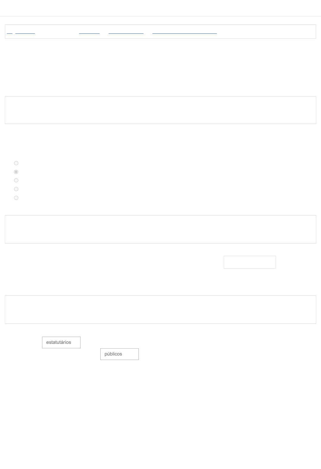 Página inicial / Meus cursos / DA2022B / 5 Trabalhadores / 5.5 Teste seus conhecimentos Iniciado em quarta, 23 nov 2022, 14:13 Estado Finalizada Concluída em quarta, 23 nov 2022, 14:35 Tempo empregado 22 minutos 4 segundos Avaliar 8,00 de um máximo de 10,00(80%) Questão 1 Correto Atingiu 1,00 de 1,00 Questão 2 Incorreto Atingiu 0,00 de 1,00 Questão 3 Correto Atingiu 1,00 de 1,00 Assinale a alternativa INCORRETA: Escolha uma opção: a. A contratação por tempo determinado não pode servir para atender necessidades que envolvam cargos típicos de carreira. b. A contratação por tempo determinado tem previsão constitucional. c. A contratação por tempo determinado deve prever os casos de contratação temporária de forma específica. d. A contratação por tempo determinado não admite hipóteses abrangentes ou genéricas. e. A contratação por tempo determinado, procedida de forma irregular, pode violar a exigência constitucional do concurso público. Todos os agentes públicos que se vinculam à Administração Pública direta e indireta do Estado são cargos públicos em sentido amplo. Os servidores ocupam cargos públicos, regidos pelos respectivos regulamentos, da União, do Distrito Federal, de Estados e de Municípios; os empregados ocupam empregos públicos, subordinados às normas da CLT, e são contratados por prazo indeterminado para exercício de funções na administração direta, autárquica e fundacional. estatutários públicos https://aprendamais.mec.gov.br/ https://aprendamais.mec.gov.br/course/view.php?id=506 https://aprendamais.mec.gov.br/course/view.php?id=506#section-5 https://aprendamais.mec.gov.br/mod/quiz/view.php?id=21894 Questão 4 Incorreto Atingiu 0,00 de 1,00 Questão 5 Correto Atingiu 1,00 de 1,00 Questão 6 Correto Atingiu 1,00 de 1,00 Os servidores públicos são os titulares de cargo público efetivo e integrantes da Administração direta, das autarquias e das fundações públicas com personalidade de Direito Público. Tratando-se de cargo efetivo, seus titulares podem adquirir estabilidade e estarão sujeitos a regime peculiar de previdência social. Assinale a alternativa CORRETA: Escolha uma opção: a. A contratação por tempo determinado tem a finalidade de atender a necessidade do Administrador local. b. A contratação por tempo determinado tem a finalidade de atender a necessidade temporária de excepcional interesse público. c. A contratação por tempo determinado pode se dar para atender necessidades essenciais da Administração Pública. d. Todas as alternativas estão corretas. e. Nenhuma das alternativas está correta. Assinale a alternativa CORRETA: Escolha uma opção: a. Desde a Constituição Federal de 1967 os artigos da Constituição Federal pertinente aos servidores públicos não sofrem qualquer tipo de alteração. b. A Constituição de 1988 igualou os servidores, ou seja, não diferenciando os servidores públicos e os militares. c. O conceito de agentes públicos administrativos abrange a grande massa de prestadores de serviços à Administração Pública e a ela vinculados por relações profissionais, em razão da investidura em cargos e funções, a título de emprego e com retribuição pecuniária. Resumo de retenção de dados Obter o aplicativo para dispositivos móveis Questão 7 Correto Atingiu 1,00 de 1,00 Questão 8 Correto Atingiu 1,00 de 1,00 Questão 9 Correto Atingiu 1,00 de 1,00 São espécies de servidores públicos em sentido amplo: I. Agentes políticos. II. Servidores públicos estatutários. III. Contratados por tempo determinado. IV. Empregados públicos. V. Estagiário público. Estão CORRETAS: Escolha uma opção: a. Somente estão corretas II, III e V. b. Somente I, II e IV. c. Somente III, IV e V. d. Somente I,II e III. e. Somente I, II, III e IV. De acordo com as afirmativas abaixo, marque a alternativa CORRETA: I. A Emenda Constitucional 19 estabeleceu que a Lei estabelecerá requisitos diferenciados de admissão, de acordo com a complexidade do cargo ou emprego. II. A Emenda Constitucional 20 trouxe modificações à previdência social, distinguindo entre o servidor titular de cargo efetivo e os demais servidores, titulares de outros cargos ou empregos públicos. III. A Emenda Constitucional 41 trouxe significativas alterações na parte relativa ao teto remuneratório e ao sistema de previdência social. Escolha uma opção: a. Somente III está correta. b. Somente I está correta. c. Somente II está correta. d. Somente I e II estão corretas. e. Todas estão corretas. Os servidores contratados por tempo determinado são aqueles submetidos ao regime jurídico administrativo especial da lei prevista no artigo 17, IX da C.F/88, bem como ao regime geral de previdência social. Escolha uma opção: Verdadeiro Falso https://aprendamais.mec.gov.br/admin/tool/dataprivacy/summary.php https://download.moodle.org/mobile?version=2020110904&lang=pt_br&iosappid=633359593&androidappid=com.moodle.moodlemobile Questão 10 Correto Atingiu 1,00 de 1,00 Assinale a alternativa CORRETA: Escolha uma opção: a. Os servidores contratados por tempo determinado têm seus contratos garantidos até o fim do mandato de Chefe do Poder Executivo. b. Os servidores contratados por tempo determinado estão submetidos a regras estatutárias. c. Os servidores contratados por tempo determinado tem suas regras previstas no artigo 37, IX da C.F/88. d. Os contratados por tempo determinado pela Administração não se constituem em espécie de servidor público, para nenhum fim. ◄ 5.4. Servidores temporários Seguir para... 6.1. Cargos e funções públicas - parte 1 ► https://aprendamais.mec.gov.br/mod/page/view.php?id=21893&forceview=1 https://aprendamais.mec.gov.br/mod/page/view.php?id=21896&forceview=1