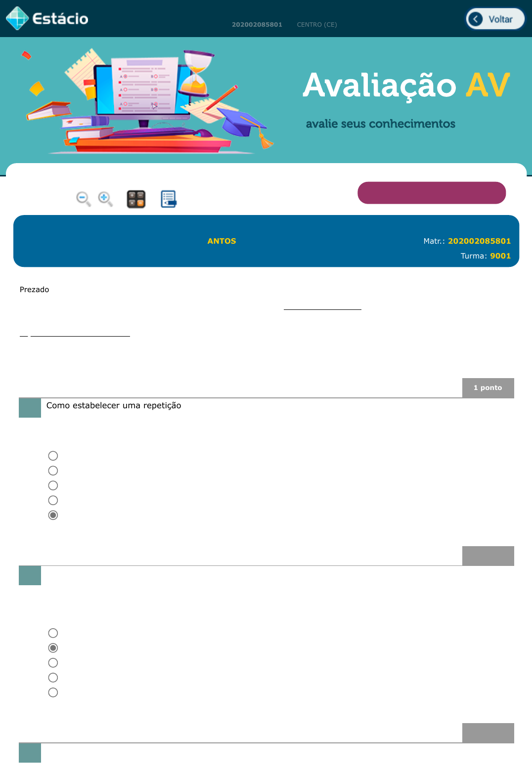 CARLOS NATHANAEL DE SOUSA DOS SANTOS Avaliação AV 202002085801 CENTRO (CE) avalie seus conhecimentos 1 ponto Como estabelecer uma repetição de um trecho de código em C de forma infinita nos simuladores para a plataforma Arduino (Tinkercad) e para PIC (PICSimLab), respectivamente? (Ref.: 202008136000) 1 ponto O simulador PICSimLab pode testar sensores, como medidores de temperatura. Porém, algumas placas do simulador não possuem essa possibilidade. Por que a placa McLab1 do PICSimLab não pode simular medidores de temperatura? (Ref.: 202008135999) 1 ponto Um sistema embarcado se comunica com um PC, enviando dados de 8 bits pela rede de forma serial. O valor 53 (em decimal), enviado pelo sistema embarcado, é apresentado pelo programa no PC como 172 (em decimal) em Lupa Calc. Notas VERIFICAR E ENCAMINHAR Disciplina: ARA0362 - PROG AP SIS ELÉT Período: 2022.2 (G) Aluno: CARLOS NATHANAEL DE SOUSA DOS SANTOS Matr.: 202002085801 Turma: 9001 Prezado(a) Aluno(a), Responda a todas as questões com atenção. Somente clique no botão FINALIZAR PROVA ao ter certeza de que respondeu a todas as questões e que não precisará mais alterá-las. A prova será SEM consulta. O aluno poderá fazer uso, durante a prova, de uma folha em branco, para rascunho. Nesta folha não será permitido qualquer tipo de anotação prévia, cabendo ao aplicador, nestes casos, recolher a folha de rascunho do aluno. Valor da prova: 10 pontos. 1. loop() e for(;). loop() e while(null). setup() e while(0). setup() e while(1). loop() e while(1). 2. Porque o microcontrolador da placa não trabalha com interrupção. Porque o microcontrolador da placa não possui ADC. Porque o microcontrolador da placa não possui temporizador. Porque o microcontrolador da placa não possui comparador. Porque o microcontrolador da placa não possui DAC. 3. javascript:voltar(); javascript:diminui(); javascript:aumenta(); javascript:calculadora_on(); javascript:anotar_on(); sucessivos envios, sem modificações de comportamento. O que está sendo alterado nos bits enviados para ocasionar esse erro? (Ref.: 202008134937) 1 ponto Considere as afirmações abaixo sobre exemplos de sistemas embarcados. I - Máquina de lavar roupas é um sistema embarcado. II - Impressora é um sistema embarcado. III - Notebook é um sistema embarcado. IV - Alarme de incêndio é um sistema embarcado. Quais opções estão corretas? (Ref.: 202008134931) 1 ponto Complete o programa abaixo colocando uma frase no lugar de ''__________%d_________:'', dentre as opções a seguir. (Ref.: 202008135125) 1 ponto Assinale abaixo a opção correta em relação às características e funcionamento de uma função: (Ref.: 202008166953) O PC está invertendo a ordem dos 8 bits recebidos. O PC está trocando o LSB de 0 para 1. O PC está trocando o MSB de 0 para 1. O PC está trocando o LSB de 1 para 0. O PC está trocando o MSB de 1 para 0. 4. I, II e III II e III II, III e IV Somente a I I, II e IV 5. A soma dos números pares menores que %d é igual a: Os números pares menores que %d são os seguintes: Os números ímpares menores que %d são os seguintes: A soma dos números menores que %d é igual a: A soma de %d mais 1 é igual a: 6. O nome de uma função pode ser uma palavra reservada do C. 1 ponto Verifique o código do programa abaixo, observando o escopo de visibilidade das variáveis: 1: #include 2: 3: int A = 200; // variavel global 4: int B = 444; // variavel global 5: 6: void escopo1() { 7: int A; 8: A = -200; 9: printf("Valor da variavel local A dentro da função escopo1: %d\n", A); 10: printf("Valor da variavel global B dentro da função escopo1: %d\n", B); 11: } 12: 13: main() { 14: 15: printf("Valor da variavel global A dentro do main(): %d\n", A); 16: printf("Valor da variavel global B dentro de main(): %d\n", B); 17: int A = 10; 18: printf("Valor da variavel local A dentro do main(): %d\n", A); 19: A = 20; 20: escopo1(); 21: printf("Valor da variavel local A dentro do main(): %d\n", A); 22: } Assinale a opção correta que será impressa ao longo da execução do programa. (Ref.: 202008166571) Uma variável local a uma função pode ter o mesmo nome que um parâmetro. Uma função deve fazer o maior número de tarefas possível sem ocupar muito código. Os parâmetros numa função são opcionais. O nome de uma função é opcional. 7. Valor da variavel global A dentro do main(): 200 Valor da variavel global B dentro de main(): 444 Valor da variavel local A dentro do main(): 10 Valor da variavel local A dentro da função escopo1: 20 Valor da variavel global B dentro da função escopo1: 444 Valor da variavel local A dentro do main(): 10 Valor da variavel global A dentro do main(): 200 Valor da variavel global B dentro de main(): 444 Valor da variavel local A dentro do main(): 10 Valor da variavel local A dentro do main(): 20 Valor da variavel local A dentro da função escopo1: -200 1 ponto Após a execução do programa abaixo, quais os valores finais armazenados nos identificadores (ou nomes) soma e x? 1. main() { 2. const float x = 10.13; 3. float a = 535, soma = 0; 4. soma = soma + a; 5. soma = soma + x; 6. } (Ref.: 202008171038) 1 ponto Considerando o bloco de instruções abaixo, quais os valores finais armazenados nas variáveis i, j e num após a execução de todas as instruções? Obs: o operador % calcula o resto de uma divisão. { int i , j , num = 14; i += 2; j -= 1; num %= 3; } Valor da variavel global B dentro da função escopo1: 444 Valor da variavel global A dentro do main(): 200 Valor da variavel global B dentro de main(): 444 Valor da variavel local A dentro do main(): 10 Valor da variavel local A dentro da função escopo1: -200 Valor da variavel global B dentro da função escopo1: 444 Valor da variavel local A dentro do main(): 20 Valor da variavel global B dentro de main(): 444 Valor da variavel global A dentro do main(): 200 Valor da variavel local A dentro do main(): 10 Valor da variavel local A dentro da função escopo1: -