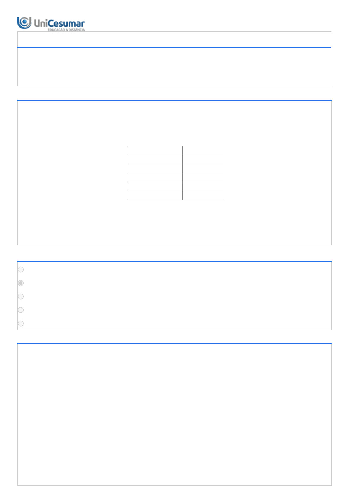 24/11/2022 23:21 Unicesumar - Ensino a Distância about:blank 1/6 ATIVIDADE 3 - CCONT - ADMINISTRAÇÃO FINANCEIRA E ORÇAMENTÁRIA - 51/2022 Período:04/04/2022 08:00 a 22/04/2022 23:59 (Horário de Brasília) Status:ENCERRADO Nota máxima:1,50 Gabarito:Gabarito será liberado no dia 04/05/2022 00:00 (Horário de Brasília) Nota obtida:1,35 1ª QUESTÃO A Capus Serviços Empresariais está analisando a possibilidade de implantação de um novo projeto que expandirá seu alcance físico. Diante dessa realidade, a empresa necessita calcular o Payback simples desse investimento, pois este será o indicador decisório para a execução do projeto. Para isso, a Capus Serviços Empresariais projetou o fluxo de caixa para um investimento inicial de R$ 170.000,00: FLUXO DE CAIXA VALOR (R$) Ano 1 50.000 Ano 2 50.000 Ano 3 50.000 Ano 4 50.000 Ano 5 50.000 Elaborado pelo professor, 2022. Com base na situação hipotética e sabendo que a empresa deseja recuperar o investimento realizado em no máximo 4 anos, avalie as alternativas e indique a correta: ALTERNATIVAS O projeto é viável, pois apresenta um Payback de 3 anos, 1 mês e 18 dias. O projeto é viável, pois apresenta um Payback de 3 anos, 4 meses e 24 dias. O projeto é viável, pois apresenta um Payback de 3 anos, 9 meses e 29 dias. O projeto não é viável, pois apresenta um Payback de 3 anos, 4 meses e 24 dias. O projeto não é viável, pois apresenta um Payback de 3 anos, 9 meses e 29 dias. 2ª QUESTÃO A empresa Contis Contabilidade Empresarial elaborou o seu planejamento estratégico e dará início à realização do orçamento empresarial. No entanto, antes de construir o orçamento, a Contis está estabelecendo as premissas orçamentárias em consonância com os objetivos estipulados no planejamento. Elaborado pelo professor, 2022. A partir da situação hipotética, sabendo que as premissas orçamentárias são divididas em três categorias e considerando apenas aquelas que compreendem elementos econômicos e financeiros, avalie as afirmativas abaixo como (V) para verdadeira e (F) para falsa: I. O orçamento seguirá um período anual e utilizará o Real (R$) como sua moeda. II. A taxa básica de juros da economia – Taxa Selic – apresenta uma tendência de alta para os próximos anos. III. A perspectiva é que a inflação fique na casa de dois dígitos para o próximo ano, mas volte a recuar com o passar dos anos. As afirmativas I, II e III são, respectivamente: 24/11/2022 23:21 Unicesumar - Ensino a Distância about:blank 2/6 ALTERNATIVAS V, F, F. F, V, F. F, F, V. F, V, V. V, V, V. 3ª QUESTÃO A empresa Matuto Agrícola LTDA está analisando as suas finanças, buscando verificar como foi a evolução da gestão do negócio. Para isso, o gestor financeiro solicitou algumas informações ao departamento de contabilidade, que lhe encaminhou um documento contendo algumas contas contábeis, bem como seus valores trimestrais, conforme tabela abaixo: Período 1º Trim 2º Trim 3º Trim 4º Trim Estoques 151.701140.072136.646155.318 Duplicatas a Receber 181.729142.615203.009211.323 Empréstimos e Financiamentos7.029 7.029 10.619 13.433 Fornecedores a Pagar 192.663177.892173.540197.256 Vendas Brutas – (dev + abat) 154.620118.153193.041227.964 Custo das Vendas 118.04188.585 146.533181.293 Compras Brutas – (dev + abat) 70.825 53.150 87.919 108.775 Despesa/Receita Operacional 21.118 17.439 22.856 3.080 Imposto de Renda e CSSL 447 3.575 3.161 15.737 Elaborado pelo professor, 2022. Com base na situação hipotética, indique a alternativa que apresenta os valores aproximados do Ciclo de Caixa (CC) e do Ciclo Operacional (CO) da empresa, respectivamente: ALTERNATIVAS CC = 14 dias; CO = 195 dias CC = -14 dias; CO = 195 dias. CC = -76 dias; CO = 205 dias. CC = 32 dias; CO = 195 dias. CC = -88 dias; CO = 188 dias. 4ª QUESTÃO O orçamento de produção tem por objetivo principal determinar as quantidades a serem produzidas durante o período orçado, visando, também, assegurar um nível de produção suficiente para atender a demanda do mercado, bem como a definição do nível desejado de estoques. COSTA, José Manoel et al. Administração Financeira e Orçamentária. Maringá-PR: UniCesumar, 2017. O Orçamento de Produção é indispensável para a organização, além de ser a base para as demais peças orçamentárias. A respeito deste tipo de orçamento, assinale a alternativa correta. ALTERNATIVAS 24/11/2022 23:21 Unicesumar - Ensino a Distância about:blank 3/6 O orçamento de produção deverá ser o primeiro a ser realizado. Com a realização desse orçamento, será possível determinar o quanto poderá vender e os demais custos da empresa. O orçamento de produção poderá ser subdivido em outros orçamentos: orçamento de matéria-prima, orçamento financeiro e orçamento de estoque de produtos acabados. Para a elaboração do orçamento de produção é fundamental a realização do orçamento de custo de produção, onde serão estimados os materiais necessários para atender a produção. O orçamento dos gastos gerais de produção integra o orçamento de produção e é composto pelos valores dispendidos com impostos. O principal objetivo do orçamento de produção é informar ao departamento de vendas o quanto poderá ser vendido. Com essa informação, será possível iniciar a formulação do orçamento de materiais e vendas. 5ª QUESTÃO O GET indica o número de vezes em que os estoques foram renovados, durante certo intervalo de tempo. Se houver estoques com diversas características, o índice refletirá a média global ponderada de todos os valores mantidos na conta estoque. O cálculo do GET se dá pela razão entre o custo dos produtos vendidos e o estoque. COSTA, J. M. et al. Administração Financeira e Orçamentária. Maringá: Unicesumar, 2019. Observe os dados da empresa Omega Pi abaixo: Em milhões 1T18 2T18 3T18 4T18 ATIVO CIRCULANTE 2.315,62.292,82.420,22.954,2 Caixa e Equivalentes de Caixa23