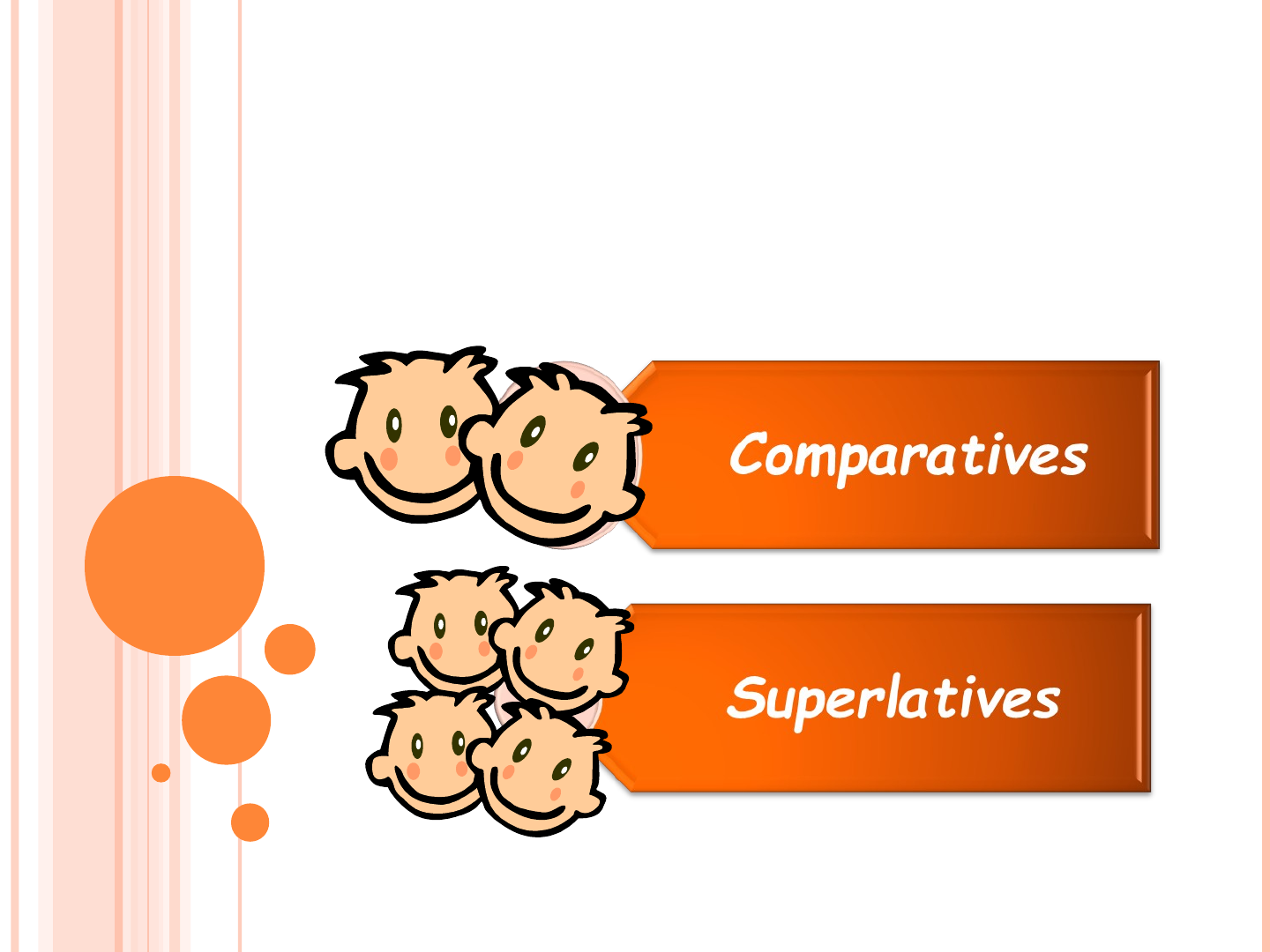 EDITED BY: KARLA ROMERO AS…AS (THE ADJECTIVE DOES NOT CHANGE) She's twice as old as her sister. I'm almost as good in math as in science. This book is not as exciting as the last one. The cafeteria is not as crowded as usual. Russian is not quite as difficult as Chinese. THAN (SOME CHANGES ARE NECESSARY, DEPENDING ON THE NUMBER OF SYLLABLES THE ADJECTIVE HAS) This computer is better than that one. It's much colder today than it was yesterday. Our car is bigger than your car. This grammar topic is easier than most others. I find science more difficult than mathematics. COMPARATIVE CONCLUSIONS Comparative is the name for the grammar used when comparing TWO THINGS The two basic ways to compare are using - as .. as - than What happen to COMPARATIVE adjectives? How do they change? 1-SYLLABLE ADJECTIVES My sister is much taller than me. It's colder today than it was yesterday. Rule 1: Add -er to the adjective. 1-SYLLABLE ADJECTIVES big-bigger fat-fatter hot-hotter Rule 2: If the word ends in the pattern: consonant-vowel-consonant …double the last consonant and add –er. 2- SYLLABLE ADJECTIVES My sister is funnier than my mom. Mark is happier than John. Cats are grumpier than mice. Rule 3: If the adjective ends in y, drop the -y and add –ier. 2-SYLLABLE ADJECTIVES The shops are always more crowded just before Christmas. Is there anything more boring than watching a bad movie? My sister is more careful with her writing than I am with mine. Rule 4: Use “more” with the unchanged adjective . 2 – SYLLABLE ADJECTIVES simple-simpler clever-cleverer narrow-narrower Rule 5: The comparative of some shorter 2-syllable adjectives can be formed with -er. Note:To be sure which comparative method to use, you will need to look up in a good dictionary. ADJECTIVES WITH 3 OR MORE SYLLABLES… Russian grammar is more difficult than English grammar. My sister is much more intelligent than me. I find math lessons more interesting than science lessons. Rule 6: use more with the unchanged adjective. What happen to SUPERLATIVE adjectives? How do they change? SUPERLATIVES Superlatives talk about one thing only and how it is the best, worst, in a group. You do not compare two things, You compare more than two. 1- SYLLABLE ADJECTIVES My sister is the tallest in our family. Yesterday was the coldest day of the year so far. Rule 1: add -est to the adjective (plus the). 1- SYLLABLE ADJECTIVES big-biggest fat-fattest hot-hottest Rule 2: If the word ends in the pattern: consonant-vowel-consonant …double the last consonant and add –est. 2- SYLLABLE ADJECTIVES The richest people are not always the happiest. Which do you think is the easiest language to learn? Rule 3: If the adjective ends in y, drop the -y and add -iest (plus the). 2-SYLLABLE ADJECTIVES Andy is the most careful person I know. This homework was the most simple assignment of the list. Tom is the most clever student in the classroom. Rule 4: Use the most with the unchanged adjective. Note: The superlative of some 2-syllable adjectives can be formed with -est. ADJECTIVES WITH 3 OR MORE SYLLABLES… Some people think that Russian is the most difficult language. Albert Einstein was the most intelligent person in history. You are the most irritating person I have ever met! Rule 5: Use the most with the unchanged adjective. IRREGULAR ADJECTIVES Common irregular comparative/superlative forms: Now you can be a better English student and why not ….you can be the best. THANK YOU