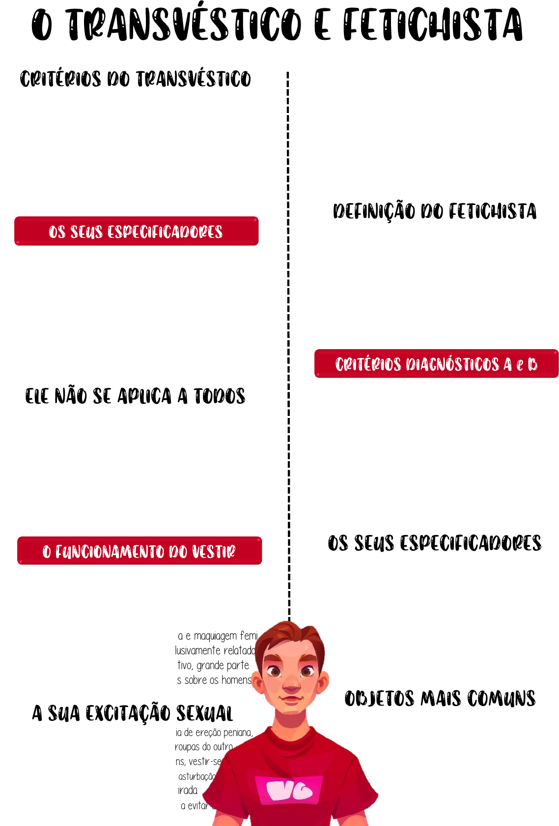 O transtorno transvéstico é marcado pela excitação sexual recorrente e intensa que o indivíduo obtém em vestir-se como o sexo oposto. O transtorno fetichista se caracteriza pela obtenção de prazer e excitação pelo uso particular de adornos, peças de vestuário ou objetos. A. Por um período de pelo menos seis meses, excitação sexual recorre nte e intensa resultante de vestir-se como o sexo oposto (cross-dre ssing), conforme manifestado por fantasias, impulsos ou comportam entos. B. As fantasias, os impulsos sexuais ou os comportamentos cau sam sofrimento clinicamente significativo ou prejuízo no funcioname nto social, profissional ou em outras áreas importantes da vida do indivíduo. Perceba que o caráter patológico está no sofrimento e nos prejuízos ocasionados por tal parafilia, e não em sua existência em si Deve-se especificar: se é com fetichismo, ou seja, se é excitado sexu almente por tecidos, materiais ou peças de vestuário; ou com auto ginefilia: Se excitado sexualmente por pensamentos ou imagens de si mesmo como mulher. Além disso, se em ambiente protegido, sendo aplicável principalmente a indivíduos institucionalizados ou moradores de outros locais onde as oportunidades são limitadas ou em remissão com pleta: Não houve sofrimento ou prejuízo no funcionamento social, pro fissional ou em outras áreas da vida do indivíduo durante cinco anos. O cross-dressing, não é necessariamente patológico. Assim, o diagnó stico de transtorno transvéstico não se aplica a todos os indivíduos que se vestem como o sexo oposto, mesmo àqueles que o fazem de forma habitual. Ele se aplica a indivíduos cuja troca no modo de vestir-se ou cujos pensamentos sobre o uso de roupas do outro sexo estão sem pre ou frequentemente acompanhados de excitação sexual e que es tão emocionalmente perturbados por esse padrão ou sentem que ele prejudica o funcionamento social ou interpessoal com relacionamentos O vestir-se como o sexo oposto (cross-dressing) pode envolver ape nas um ou dois artigos do vestuário (p. ex., para homens, pode incluir somente o uso de roupas íntimas femininas, como calcinhas e sutiã) ou se vestir completamente com roupa que culturalmente é do outro sexo; em homens, pode incluir o uso de peruca e maquiagem femi nina. O transtorno transvéstico é quase exclusivamente relatado em em indivíduos do sexo masculino; por esse motivo, grande parte dos materiais, incluindo o DSM relatam apenas sobre os homens Excitação sexual, em sua apresentação mais óbvia de ereção peniana, pode ocorrer simultaneamente com o uso de roupas do outro sexo de várias formas. Em homens mais jovens, vestir-se como o sexo oposto frequentemente leva à masturbação, após o que toda peça de roupa feminina é retirada. Homens mais velhos com frequência aprendem a evitar a masturba a masturbação ou fazer qualquer coisa que estimule o pênis, de modo que evitar a ejaculação possibilita-lhes prolongar a sessão de uso de roupas do outro sexo. Homens com parceiras do sexo feminino, por vezes, completam a sessão de uso de roupas do outro sexo tendo relação sexual com as parceiras, sendo que alguns apresen tam dificuldade de manter uma ereção suficiente para a relação sexual sem o uso das roupas do sexo oposto (ou sem fantasias par ticulares de uso dessas roupas, o que configura esse transtorno) Se caracteriza pela obtenção de prazer e excitação pelo uso parti cular de adornos, peças de vestuário ou objetos. Geralmente, o indivíduo com transtorno fetichista utiliza, na masturbação ou no ato sexual, objetos relacionados ao corpo, como sapatos, meias, lingerie, luvas, etc., masturbando-se ao contato de tais objetos. Para o diagnóstico desse transtorno, as fantasias, impulsos e/ou comportamentos devem causar sofrimento, uma vez que o uso de objetos é comum em indivíduos com algumas parafilias específicas A. Por um período de pelo menos seis meses, excitação sexual re corrente e intensa resultante do uso de objetos inanimados ou de um foco altamente específico em uma ou mais de uma parte não genital do corpo, conforme manifestado por fantasias, impulsos ou comportamentos; B. As fantasias, os impulsos sexuais ou os com portamentos causam sofrimento clinicamente significativo C. Os objetos de fetiche não se limitam a artigos do vestuário usados em travestismo/cross-dressing (transvéstico) ou a dispositivos criados para estimulação genital tátil (como. ex., os tipos de vibrador) .Deve-se especificar: se é Parte(s) do corpo Objeto(s) inanimado (s) ou Outro; Além disso, se em ambiente protegido, sendo aplica vel principalmente a indivíduos institucionalizados ou moradores de outros locais onde as oportunidades de envolvimento em compo rtamentos fetichistas são limitadas, ou em remissão completa: Não houve sofrimento ou prejuízo no funcionamento social, pro fi ssional ou em outras áreas da vida do indivíduo por cinco anos. Tais especificadores devem estar presentes no diagnóstico Objetos de fetiche comuns incluem roupa íntima feminina, calça dos masculinos ou femininos, artigos de borracha, roupas de couro ou outras peças de vestuário. Partes do corpo altamente erotizadas associadas incluem os pés, os dedos dos pés e os cabelos. O parcialismo (feitiche em uma parte do corpo), era um transtorno separado que foi incorporado nesse no DSM-V.