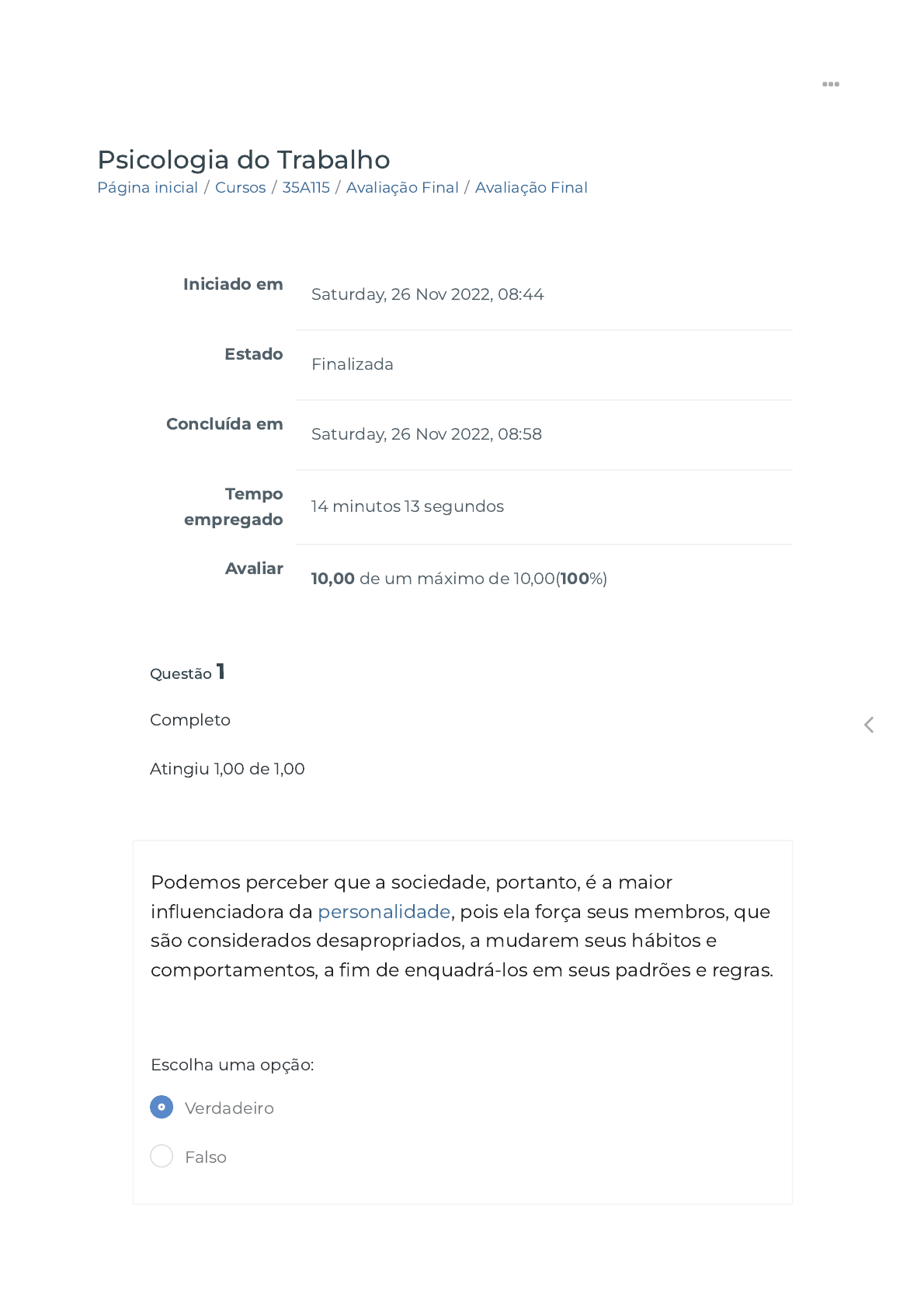 Avaliação Final https://ava.politecnicabr.com.br/mod/quiz/review.php?attempt=3963181 1/8 Página inicial / Cursos / 35A115 / Avaliação Final / Avaliação Final Psicologia do Trabalho Iniciado em Saturday, 26 Nov 2022, 08:44 Estado Finalizada Concluída em Saturday, 26 Nov 2022, 08:58 Tempo empregado 14 minutos 13 segundos Avaliar 10,00 de um máximo de 10,00(100%) Questão 1 Completo Atingiu 1,00 de 1,00 Podemos perceber que a sociedade, portanto, é a maior in�uenciadora da personalidade, pois ela força seus membros, que são considerados desapropriados, a mudarem seus hábitos e comportamentos, a �m de enquadrá-los em seus padrões e regras. Escolha uma opção: Verdadeiro Falso https://ava.politecnicabr.com.br/ https://ava.politecnicabr.com.br/course/index.php https://ava.politecnicabr.com.br/course/view.php?id=1037 https://ava.politecnicabr.com.br/course/view.php?id=1037#section-13 https://ava.politecnicabr.com.br/mod/quiz/view.php?id=25570 https://ava.politecnicabr.com.br/mod/resource/view.php?id=25558 https://ava.politecnicabr.com.br/ Avaliação Final 2/8 Questão 2 Completo Atingiu 1,00 de 1,00 O termo “trabalho análogo ao de escravo” deriva do fato de que o trabalho escravo formal foi abolido pela Lei Áurea em 13 de maio de que ano? Escolha uma opção: a. 1889 b. 1885 c. 1888 d. 1887 https://ava.politecnicabr.com.br/ Avaliação Final 3/8 Questão 3 Completo Atingiu 1,00 de 1,00 A conduta ética pro�ssional possibilita ao colaborador a oportunidade de, escolha abaixo a(s) alternativa(s) correta(s): Escolha uma opção: Questão 4 Completo Atingiu 1,00 de 1,00 A qualidade de vida no trabalho (QVT) pode ser confundida com políticas de benefícios, nem com atividades festivas de congraçamento, embora essas sejam importantes como estratégias. Escolha uma opção: a. crescer dentro da organização. b. não trabalhar nos �ns de semana c. ser o funcionário do mês d. Nenhuma das alternativas Verdadeiro Falso https://ava.politecnicabr.com.br/mod/resource/view.php?id=25566 https://ava.politecnicabr.com.br/ Avaliação Final 4/8 Questão 5 Completo Atingiu 1,00 de 1,00 O avanço da agricultura, de seus instrumentos e ferramentas trouxe progressos ao trabalho. O advento do arado representou uma das primeiras revoluções no mundo do trabalho Escolha uma opção: Questão 6 Completo Atingiu 1,00 de 1,00 O advento da microeletrônica oferece uma nova dimensão às mudanças tecnológicas e à automação. Existem, no mínimo, cinco fatores que fazem da microeletrônica a tecnologia-chave da nossa época. Escolha uma opção: Verdadeiro Falso Verdadeiro Falso https://ava.politecnicabr.com.br/ Avaliação Final 5/8 Questão 7 Completo Atingiu 1,00 de 1,00 É o inicio de um período de transição de onde passaremos da idade contemporânea para uma Idade Pós- Contemporânea, isto refere-se a que �m de século: ? Escolha uma opção: a. Século XVIII b. Século XX c. Século XV d. Século XIX e. Século XVII https://ava.politecnicabr.com.br/ Avaliação Final 6/8 Questão 8 Completo Atingiu 1,00 de 1,00 Ficou conhecido pelo nome de bolchevique o grupo político russo formado por ex-integrantes do Partido Operário Social Democrata Russo (POSDR), fundado em 1889. Escolha uma opção: Questão 9 Completo Atingiu 1,00 de 1,00 (Do latim) Conceito do ser humano como ser capaz de fabricar ou criar ferramentas com inteligência. E tem a Capacidade de fabricar utensílios que transformam a natureza. Escolha uma opção: Verdadeiro Falso a. Homo Faber b. Homo Saber c. Ariel Faber d. Homo Castel https://ava.politecnicabr.com.br/ Avaliação Final 7/8 Questão 10 Completo Atingiu 1,00 de 1,00 Podemos a�rmar que Brainstorming é uma dinâmica de grupo que é usada em várias empresas como uma técnica para resolver problemas especí�cos, para desenvolver novas ideias ou projetos, para juntar informação e para estimular o pensamento criativo. Escolha uma opção: Verdadeiro Falso Entre em Contato https://www.politecnicabr.com.br 0800 084 2627 0800 084 2627 Links Úteis Dicas da nossa Diretora Acadêmica Planner de Estudos Declaração de Matrícula Orientações do AVA Abertura de Ticket Fale com o Tutor Cronograma de Estudos Manual de Estágio Manual de Competência Siga-nos nas redes sociais https://www.politecnicabr.com.br/ https://soundcloud.com/user-501638417/sets/escola-politecnica-brasileira https://storage.googleapis.com/sirius-pubstore/semestre_plannerdeestudo%20poli.pdf https://storage.googleapis.com/sirius-pubstore/declaracao_matricula.pdf https://storage.googleapis.com/sirius-pubstore/orientacoes_ava.pdf https://storage.googleapis.com/sirius-pubstore/abertura_ticket.pdf https://storage.googleapis.com/sirius-pubstore/fale_com_tutor.pdf https://storage.googleapis.com/sirius-pubstore/cronograma_estudos.pdf https://storage.googleapis.com/sirius-pubstore/manual_estagio.pdf https://storage.googleapis.com/sirius-pubstore/manual_competencia.pdf https://www.facebook.com/politecnicabr https://www.instagram.com/politecnicabr_oficial https://ava.politecnicabr.com.br/ Avaliação Final 8/8 © 2022 - Escola Politécnica Brasileira https://ava.politecnicabr.com.br/mod/quiz/0 https://www.facebook.com/politecnicabr https://www.instagram.com/politecnicabr_oficial https://ava.politecnicabr.com.br/
