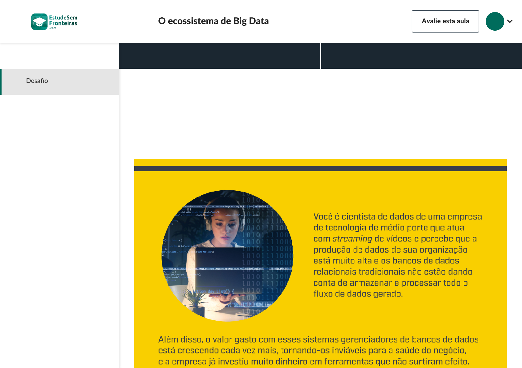 Desafio Para que a manutenção de grandes conjuntos de dados seja efe�va, é importante exis�r alto poder de processamento, além de so�wares que atendam à alta demanda. Em regra, sistemas gerenciadores de bancos de dados comuns podem não ser tão sa�sfatórios, sendo necessário o uso de ferramentas mais robustas. Observe a seguinte situação: Anterior Apresentação Próximo Infográfico Apresentação Desafio Infográfico Conteúdo do Livro Dica do Professor Exercícios Na prá�ca Saiba mais O ecossistema de Big Data Avalie esta aula VN De acordo com o cenário apresentado, você deve especificar: a) Qual ou quais tecnologias poderiam ser adotadas pela empresa? Jus�fique sua resposta com o maior número de detalhes possível. b) Com base em sua resposta, anexe o desenho da arquitetura ideal imaginada por você para atender à empresa. Sua resposta a) Qual ou quais tecnologias poderiam ser adotadas pela empresa? Jus�fique sua resposta com o maior número de Anterior Apresentação Próximo Infográfico Apresentação Desafio Infográfico Conteúdo do Livro Dica do Professor Exercícios Na prá�ca Saiba mais O ecossistema de Big Data Avalie esta aula VN detalhes possível. Data Lake: Armazena a grande massa de dados em geral (não estruturados); Ambiente Hapdoop trabalhar com a estruturação, processamento, analise e armazenamento dos dados. b) Com base em sua resposta, anexe o desenho da arquitetura ideal imaginada por você para atender à empresa. Ingestão (Apache Ka�a) Armazenamento (Apache Cassandra) Processamento (Apache Spark) Apresentação (Microso� P. BI) Segurança (Apache Ranger) Enviado em: 23/08/2022 10:18 Padrão de resposta esperado a) Muitas podem ser as possibilidades de arquitetura. Como sugestão, uma delas seria o uso do Apache Hadoop, visto que ele conta com ferramentas de armazenamento massivo de dados, como o HDFS, além de ferramentas des�nadas ao processamento, como é o caso do Spark e do Hive. Os dados seriam captados das diversas fontes, como websites, sistemas gerenciadores de conteúdo, planilhas eletrônicas, etc., e, em seguida, processados pelo Apache Spark, no qual seria possível extrair os insights necessários. Por fim, seriam apresentados visualmente pelo Tableau ou Power BI, por exemplo. Além disso, como vantagens, a empresa teria baixo custo de inves�mento, pois a maioria das ferramentas é open source, com exceção do Power BI e do Tableau. Na camada de segurança, por sua vez, pode-se u�lizar o Apache Ranger e o Apache Ambari para garan�r a integridade dos dados. b) O desenho anexo representa a arquitetura mencionada na questão A, porém você pode representar outra arquitetura diferente desta, desde que atenda às camadas de ingestão, armazenamento, processamento, apresentação e segurança. Anterior Apresentação Próximo Infográfico Apresentação Desafio Infográfico Conteúdo do Livro Dica do Professor Exercícios Na prá�ca Saiba mais O ecossistema de Big Data Avalie esta aula VN Anterior Apresentação Próximo Infográfico Apresentação Desafio Infográfico Conteúdo do Livro Dica do Professor Exercícios Na prá�ca Saiba mais O ecossistema de Big Data Avalie esta aula VN