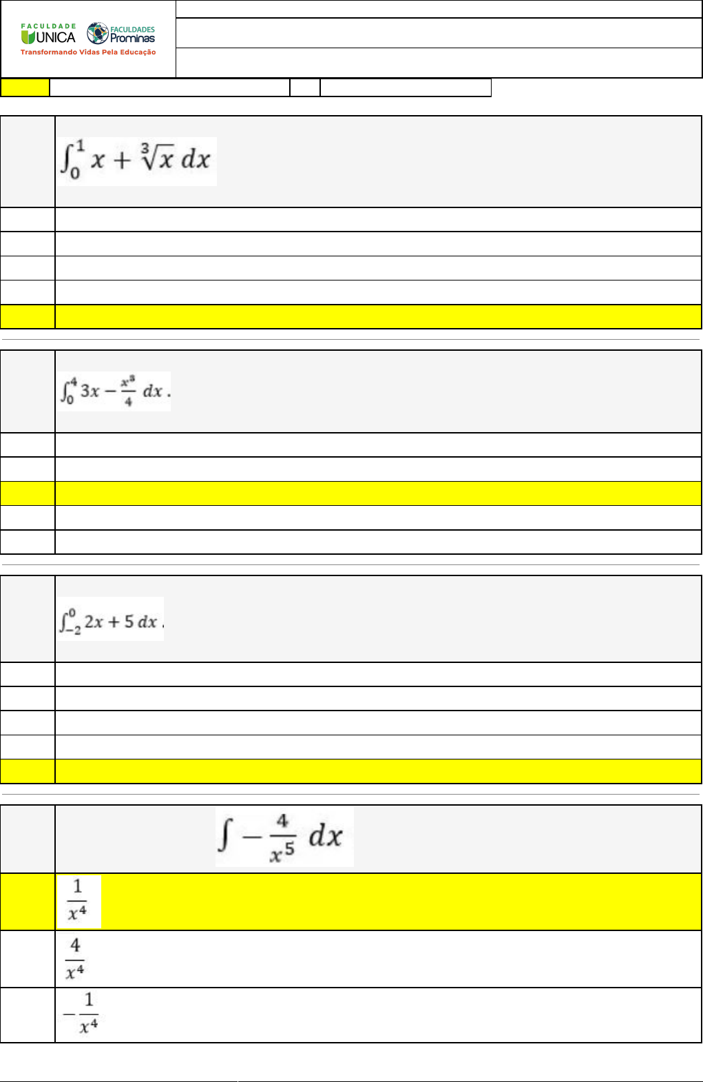 25/10/2022 08:49:34 1/2 REVISÃO DE SIMULADO Nome: RENATO APARECIDO RIBEIRO LOPES Disciplina: Cálculo II Respostas corretas são marcadas em amarelo X Respostas marcardas por você. Questão 001 Por meio o teorema Fundamental do Cálculo (parte 2) pode-se calcular o valor de Dessa forma, o valor encontrado é : A) 1/2 B) 4/3 C) 3/4 D) 4/5 X E) 5/4 Questão 002 Por meio o teorema Fundamental do Cálculo (parte 2) pode-se calcular o valor de Dessa forma, o valor encontrado é : A) 7 B) 10 X C) 8 D) 9 E) 11 Questão 003 Por meio o teorema Fundamental do Cálculo (parte 2) pode-se calcular o valor de Dessa forma, o valor encontrado é : A) 7 B) 4 C) 5 D) 3 X E) 6 Questão 004 Calculando a integral a antiderivada encontrada é : X A) B) C) 25/10/2022 08:49:34 2/2 D) E) Questão 005 Por meio o Teorema Fundamental do Cálculo (parte 2) pode-se calcular o valor de . Dessa forma, o valor encontrado é A) 2 B) 1 X C) 5/2 D) 1/2 E) 3/2 Questão 006 Calculando a antiderivada de ∫sen x – cos x dx encontraremos A) cos x - senâ�¡ x + c B) tgx + c C) cos x + senâ�¡ x + c D) - cos x - sen x + c X E) - cos x + senx + c Questão 007 Calculando a antiderivada de ∫ x8 dx encontraremos A) x9 + c B) x8+c C) D) X E) Questão 008 Por meio o teorema fundamental do cálculo (parte 2) pode-se calcular o valor de Dessa forma, o valor encontrado é : A) - 10 B) - 5 C) 5 D) 0 X E) 10