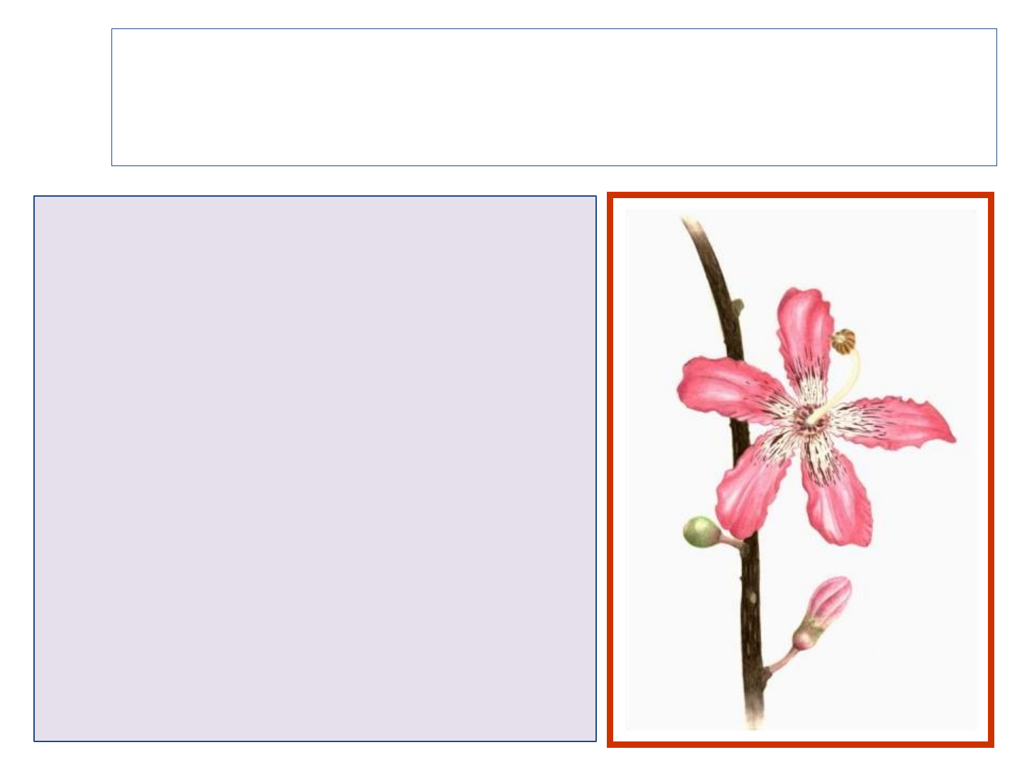 FLOR Órgão reprodutivo das plantas superiores Eixo com folhas metamorfoseadas que, em conjunto, constituem o aparelho reprodutor sexual das plantas superiores (Fanerógamas). TODA planta superior possui flores, mesmo que pequenas e inexpressivas. IMPORTÂNCIA Reprodução sexual; Classificação das plantas (taxonomia); Industrial; Medicinal; Ornamental, etc... PARTES CONSTITUINTES Brácteas Pedúnculo Receptáculo Verticilos florais: Flor completa Vegetativos: Pétalas Sépala Reprodutivos: Androceu (estames: antera e filete) Gineceu (carpelo: ovário, estilete e estigma) sépala estame pétala estilete ovário antera estigma ovário pétala sépala tubo polínico filete estame estilete óvulo pistilo NOMENCLATURA FLORAL Presença/ausência de pedúnculo (ou pedicelo) Séssil Pedunculada Disposição cíclica: peças florais dispostas em círculos concêntricos no receptáculo, formando verticilos. Quanto à disposição dos verticilos carpelos pétala estame Disposição espiralada: peças florais dispostas em espiral em torno do receptáculo. Quanto à disposição dos verticilos Quanto ao número de peças do perianto Aperiantada ou aclamídea: ausência dos dois verticilos protetores. Monoclamídea: ausência de um deles. Diclamídea: presença dos dois verticilos protetores (cálice e corola). Podem faltar verticilos? Sim, mas o mais comum é a flor completa (com os 4 verticilos). Mas existem flores com 0, 1, 2 ou 3 verticilos Cada verticilo é independente? Não, pode haver soldadura entre eles. Exemplo: é comum o androceu se fundir com a corola. Existem 4 verticilos, porém só 3 anéis de cicatrizes no receptáculo Quanto à homogeneidade do perianto Homoclamídea: sépalas e pétalas iguais em número cor e forma, sendo chamada de TÉPALAS. Heteroclamídea: sépalas e pétalas diferentes entre si. Estéril ou neutra Hermafrodita UnissexualMasculina UnissexualFeminina Quanto ao sexo Estéril ou neutra Quanto ao sexo Espata Espádice: Femininas Masculinas neutras Espécies que apresentam flores unisexuais podem ser: Monóicas ou Dióicas dióica monóica MONÓICA Flor masculina Flor feminina DIÓICA Planta com flores unissexuais masculinas Planta com flores unissexuais femininas Quanto ao número de estames em relação ao de pétalas Possíveis relações numéricas (FLOR PENTÂMERA) FLOR ISOSTÊMONE 5 estames = 5 pétalas FLOR OLIGOSTÊMONE 1, 2, 3 ou 4 estames = 5 pétalas FLOR DIPLOSTÊMONE 10 estames = 5 pétalas FLOR POLISTÊMONE 6, 7, 8 ou 9, 11, 12... estames = 5 pétalas Podem faltar 1 ou ambos os verticilos estéreis: Monoclamídea/Monoperiantada ou perigoniada Aclamídea/Aperiantada ou nua Pode faltar um dos verticilos reprodutivos: Flor unisexual Flores Incompletas aclamídea férteis estéreis glumas periclínio Tipos de Brácteas calículo espata Tipos de Brácteas PERIANTO Cálice: 1º verticilo protetor externo Corola: 2º verticilo protetor interno PERIANTO: Quanto à soldadura das sepálas/pétalas Gamossépala (sinsépala)/ gamopétala (sinpétala): fundidos entre si. Dialissépala/dialipétala: livres. PERIANTO: Quanto ao número de sépalas e pétalas Flor trímera 3 sépalas/3 pétalas Flor tetrâmera: 4 sépalas/4 pétalas Flor hexâmera 6 sépalas/6 sépalas Flor pentâmera 5 sépalas/5 pétalas PERIANTO: Quanto ao número de sépalas e pétalas PERIANTO: Quanto à simetria actinomorfa Zigomorfa ou bilateral assimétrica FORMAS: corola dialipétala actinomorfa crucífera rosácea rosácea FORMAS: corola dialipétala zigomorfa papilionada: 5 pétalas desiguais: 1 maior (estandarte ou vexilo); 2 menores laterais (asas); 2 inferiores mais internas (carena ou quilha) orquidácea: com 3 pétalas: duas laterais (asas) e uma mediana (labelo). FORMAS: Corola gamopétala actinomorfa urceolada infundibuliforme tubulosa, hipocrateriforme campanulada rotada cupuliforme FORMAS: corola gamopétala actinomorfa hipocrateriforme urceolada infundibuliforme FORMA: corola gamopétala zigomorfa digitaliforme ligulada labiada personada androceu e gineceu androceu gineceu ANDROCEU filete antera ANDROCEU: quanto ao tamanho relativo dos estames didínamo tetradínamo heterodínamo ANDROCEU: quanto à soldadura dos estames dialistêmone: estames livres entre si sinfisandro ou sinandro: Estames totalmente soldados entre si em um só corpo Gamostêmone: estames soldados entre si formando adelfia. ANDROCEU: quanto à soldadura dos filetes (adelfia); filetes soldados entre si formando feixes. diadelfo monoadelfo triadelfo poliadelfo ESTAMES: quanto à ramificação do filete. ANDROCEU ramificado simples ESTAMINÓIDES: São estames estéreis geralmente de tamanho reduzido, sem anteras ou com anteras sem pólen; por vezes se assemelham a pétalas. estame estaminóide Flor sem estaminóide ANTERA: inserção do filete ANDROCEU dorsifixa (versátil) basifixa apicefixa dorsifixa (não versátil) Dorsifixa (versátil) Dorsifixa (não versátil) ANDROCEU: deiscência das anteras poricida valvar rimosa ou longitudinal fendas transversais irregular pequenas fendas Quanto ao número de tecas monoteca diteca tetrateca O GRÃO DE PÓLEN ANTERAS PORICIDAS ANTERA VALVAR PERÍGINA: Receptáculo escavado livre ou às vezes concrescente até a metade do ovário; demais verticilos em torno do gineceu; ovário súpero ou semi-ínfero Quanto à posição relativa do gineceu Perígina Hipógina Epígina OVÁRIO: Quanto à posição GINECEU súpero semi-ínfero ínfero GINECEU: Quanto à soldadura dos carpelos dialicarpelar gamocarpelar GINECEU: Quanto número de carpelos e lóculos tricarpelar trilocular bicarpelar bilocular tricarpelar unilocular unicarpelar unilocular bicarpelar unilocular Pluricarpelar tetralocular ESTILETE (apresenta formas variáveis): Quanto à inserção, podem ser: terminal GINECEU Basal (ginobásico) lateral ESTIGMA: quanto à divisão ramificado indiviso GINECEU Estigma indiviso (formas) filiforme globoso truncado cônico discóide leque petalóide pontiagudo não diferenciado