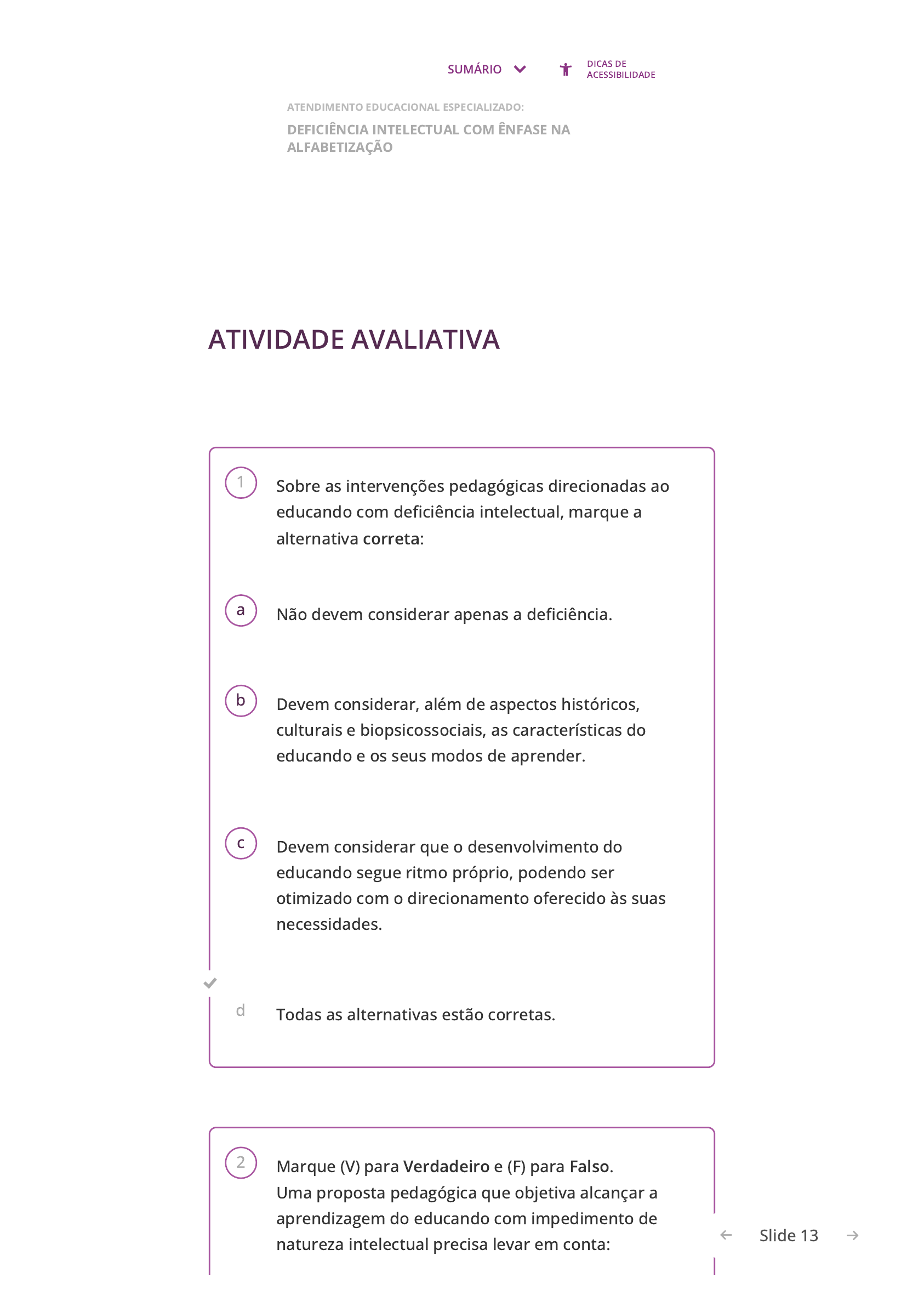 26/11/22, 11:26 A aprendizagem do educando com deficiência intelectual: aspectos neurológicos do desenvolvimento e da aprendizagem https://avamec.mec.gov.br/#/instituicao/semesp/curso/15187/unidade/8685/acessar 1/5 SUMÁRIO ATENDIMENTO EDUCACIONAL ESPECIALIZADO: DEFICIÊNCIA INTELECTUAL COM ÊNFASE NA ALFABETIZAÇÃO DICAS DE ACESSIBILIDADE ATIVIDADE AVALIATIVA Sobre as intervenções pedagógicas direcionadas ao educando com de�ciência intelectual, marque a alternativa correta: 1 Não devem considerar apenas a de�ciência.a Devem considerar, além de aspectos históricos, culturais e biopsicossociais, as características do educando e os seus modos de aprender. b Devem considerar que o desenvolvimento do educando segue ritmo próprio, podendo ser otimizado com o direcionamento oferecido às suas necessidades. c Todas as alternativas estão corretas. d Marque (V) para Verdadeiro e (F) para Falso. Uma proposta pedagógica que objetiva alcançar a aprendizagem do educando com impedimento de natureza intelectual precisa levar em conta: 2 Slide 13 javascript:void(0) https://avamec.mec.gov.br/ava-mec-ws/instituicao/semesp/conteudo/modulo/4617/mod2/slide12.html 26/11/22, 11:26 A aprendizagem do educando com deficiência intelectual: aspectos neurológicos do desenvolvimento e da aprendizagem https://avamec.mec.gov.br/#/instituicao/semesp/curso/15187/unidade/8685/acessar 2/5 Que o processo de aprender é múltiplo, havendo variedade de formas de ensinar/aprender. a F V O ano letivo como referência para aprender novos conhecimentos. b F V As interações que se dão no ambiente sem a mediação. c F V A construção de caminhos e conexões com o conhecimento acadêmico e com o meio social. d F V Com relação aos estudos sobre o funcionamento do cérebro, assinale a alternativa incorreta. 3 O cérebro funciona de forma integrada.a O cérebro tem a capacidade de se remodelar, ou se recon�gurar, em função de suas experiências. b Estudos mostram que para ler são mobilizadas cerca de cinco áreas no cérebro. c O cérebro possui dois hemisférios cerebrais que estão unidos por estruturas de conexão. d Slide 13 javascript:void(0) https://avamec.mec.gov.br/ava-mec-ws/instituicao/semesp/conteudo/modulo/4617/mod2/slide12.html 26/11/22, 11:26 A aprendizagem do educando com deficiência intelectual: aspectos neurológicos do desenvolvimento e da aprendizagem https://avamec.mec.gov.br/#/instituicao/semesp/curso/15187/unidade/8685/acessar 3/5 Relacione os quatro grandes lóbulos cerebrais (na primeira coluna) com as suas funções correspondentes na segunda coluna. 4 Frontal1 Parietal2 Temporal3 Occipital4 Responsável pelo processament das informações visuais que decodi�cam e as classi�cam em cores, tamanhos, formas etc. 4 Área altamente desenvolvida em que ocorrem, dentre outras, as funções de controle de humor, impulsos e o gerenciamento de situações que envolvem a relação com o ambiente. 1 Realiza a integração das sensações sensoriais. 2 Faz o processamento das informações auditivas. Contêm as áreas de Wernicke e de Broca que são responsáveis pela comunicação – verbal e simbólica. 3 Sobre a Plasticidade Cerebral, assinale a alternativa correta: 5 Na aprendizagem do educando com de�ciência intelectual a plasticidade cerebral não existe, então não ocorrem modi�cações no seu cérebro. a A plasticidade cerebral possibilita novas conexões das células neurais que ativam e reorganizam caminhos para o aprender. b O educador deve pensar em práticas pedagógicas que estimulem a plasticidade cerebral do educando c Slide 13 javascript:void(0) https://avamec.mec.gov.br/ava-mec-ws/instituicao/semesp/conteudo/modulo/4617/mod2/slide12.html 26/11/22, 11:26 A aprendizagem do educando com deficiência intelectual: aspectos neurológicos do desenvolvimento e da aprendizagem https://avamec.mec.gov.br/#/instituicao/semesp/curso/15187/unidade/8685/acessar 4/5 com de�ciência intelectual somente nos primeiros anos de escolarização. Todas as alternativas estão corretas.d Segundo Fonseca (2009), a cognição envolve uma série de subcomponentes. Assinale aquelas que se relacionam diretamente com a cognição: 6 Atenção e memóriaa Pensamento e imaginaçãob Expressão e comunicaçãoc Todas as alternativas estão corretas. d Relacione as habilidades cognitivas (na primeira coluna) com as suas respectivas características (na segunda coluna). 7 Ritmo1 Lateralidade2 Coordenação motora ampla3 Coordenação motora �na4 É a predominância neurológica que uma pessoa apresenta no uso de um lado do corpo para a realização das atividades. 2 É a capacidade de usar o corpo de acordo com os comandos que o cérebro envia. 3 Está relacionada com as noções temporais, pressupondo 1 Slide 13 javascript:void(0) https://avamec.mec.gov.br/ava-mec-ws/instituicao/semesp/conteudo/modulo/4617/mod2/slide12.html 26/11/22, 11:26 A aprendizagem do educando com deficiência intelectual: aspectos neurológicos do desenvolvimento e da aprendizagem https://avamec.mec.gov.br/#/instituicao/semesp/curso/15187/unidade/8685/acessar 5/5 Refazer Atividade Respondidas 7 de 7 questões Progresso do Módulo ANTERIOR 13 de 13 AVANÇAR 1 2 3 4 5 6 7 8 9 10 11 12 13 Realização sucessão sonora de tempo e duração. Envolve os movimentos realizados pelas mãos e dedos, sendo gradativamente desenvolvidos. 4 Parabéns! Você chegou ao �nal do segundo módulo do Curso do Atendimento Educacional Especializado: De�ciência Intelectual com Ênfase na Alfabetização! Segue em frente até o próximo módulo para continuarmos estudando! Slide 13 https://avamec.mec.gov.br/ava-mec-ws/instituicao/semesp/conteudo/modulo/4617/mod2/slide12.html javascript:void(0) https://avamec.mec.gov.br/ava-mec-ws/instituicao/semesp/conteudo/modulo/4617/mod2/slide01.html https://avamec.mec.gov.br/ava-mec-ws/instituicao/semesp/conteudo/modulo/4617/mod2/slide02.html https://avamec.mec.gov.br/ava-mec-ws/instituicao/semesp/co