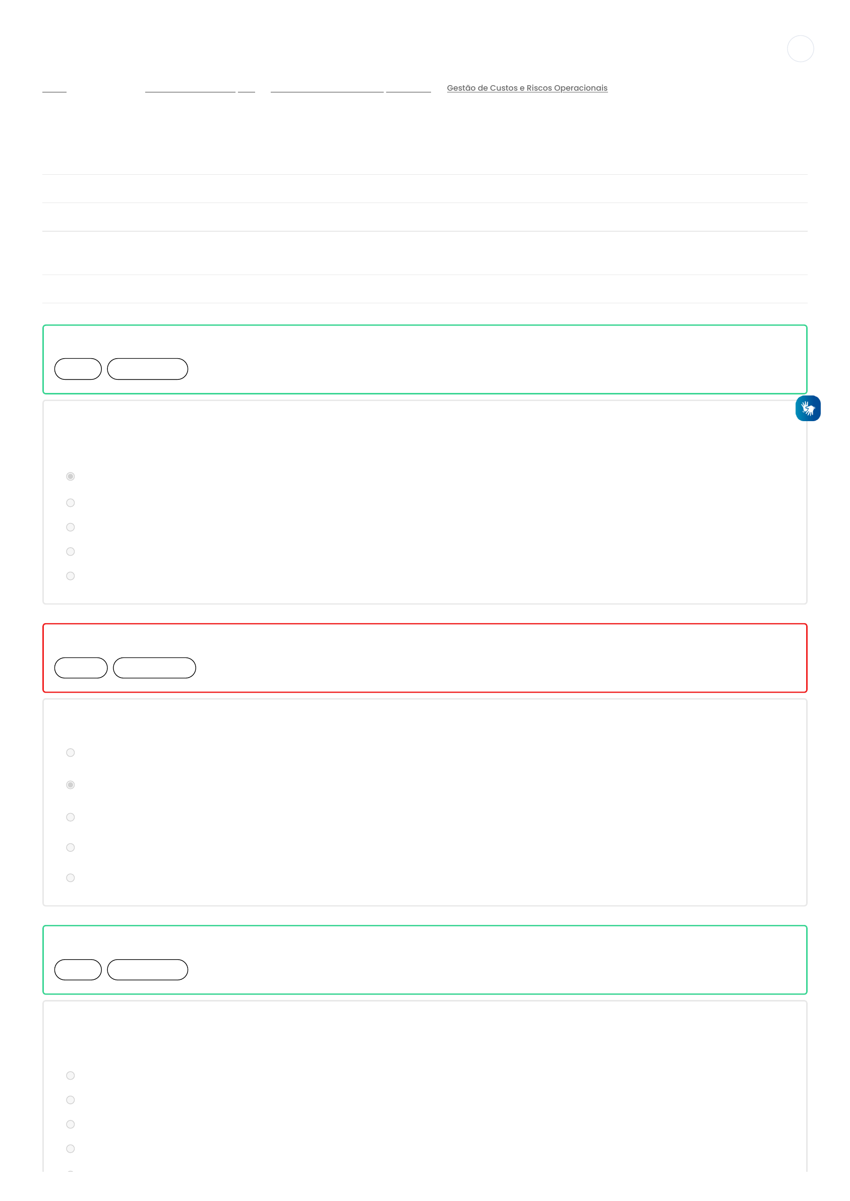 26/11/2022 17:21 Gestão de Custos e Riscos Operacionais: Revisão da tentativa https://ava.faculdadefocus.edu.br/mod/quiz/review.php?attempt=129816&cmid=3023 1/4 - Meus cursos - - - Painel MBA em Gestão de Projetos Gestão de Custos e Riscos Operacionais Gestão de Custos e Riscos Operacionais Iniciado em sábado, 26 nov 2022, 15:51 Estado Finalizada Concluída em sábado, 26 nov 2022, 17:22 Tempo empregado 1 hora 30 minutos Avaliar 7,0 de um máximo de 10,0(70%) Questão 1 Correto Atingiu 1,0 de 1,0 Qual dos fundamentos para estruturar uma estratégia de precificação presume que os consumidores têm preferências as quais querem satisfazer na busca de maximizar sua satisfação pessoal? a. Comportamento do consumidor. b. Mercado de atuação. c. Ação. d. Mercado econômico. e. Marketing. Questão 2 Incorreto Atingiu 0,0 de 1,0 Como o gestor pode identificar o risco operacional da empresa? Assinale a alternativa correta. a. Verificando o risco que flutuações na taxa de câmbio possam afetar o fluxo de caixa. b. Definindo as técnicas estatísticas e as variáveis qualitativas e quantitativas que permitam estimar perdas potenciais em função de falhas no controle dos riscos operacionais. c. Verificando o risco de inadimplência dos clientes e como pode afetar o fluxo de caixa. d. Mapeando as diversas atividades de cada uma das áreas de negócios e de suporte à empresa e dos riscos inerentes a cada uma dessas atividades. e. Ao definir medidas e controles que minimizem falhas no desempenho das atividades. Questão 3 Correto Atingiu 1,0 de 1,0 Em relação ao ciclo de vida do produto, assinale a alternativa que representa o conceito de quando os consumidores começam a experimentar o produto, iniciando um processo de estabilidade no mercado. a. Estágio da introdução do produto no mercado. b. Estágio da maturidade do produto no mercado. c. Estágio neutro do produto no mercado. d. Estágio do declínio do produto no mercado. E tá i d i t d d t d https://ava.faculdadefocus.edu.br/my/ https://ava.faculdadefocus.edu.br/course/view.php?id=75 https://ava.faculdadefocus.edu.br/course/view.php?id=75§ion=12 https://ava.faculdadefocus.edu.br/mod/quiz/view.php?id=3023 26/11/2022 17:21 Gestão de Custos e Riscos Operacionais: Revisão da tentativa https://ava.faculdadefocus.edu.br/mod/quiz/review.php?attempt=129816&cmid=3023 2/4 e. Estágio de crescimento do produto no mercado. Questão 4 Correto Atingiu 1,0 de 1,0 "A contabilidade de custos é algo recente, que só foi identificado na empresa moderna pós-Revolução Industrial". Essa afirmação é verdadeira? Assinale a alternativa correta. a. Não. Até a Revolução Industrial não existiam registros de receitas e gastos pelos artesões. b. Não. Existem registros de inventários desde a Era da Pedra Polida, contudo, após a Revolução Industrial, houve necessidade de ajustes e de novas técnicas, bem como de mudanças na forma de apurar os custos devido às mudanças do processo produtivo de artesanal para fabril. c. Não. A contabilidade de custos sempre existiu da mesma forma que é feita atualmente. d. Não. A contabilidade de custos já existia na Era Mercantilista e só foi transferida para a Era Industrial, sem modificações. e. Sim. A competição crescente do mercado exigia menores preços e inovação constante. Questão 5 Correto Atingiu 1,0 de 1,0 Quais das alternativas a seguir caracteriza uma força endógena da empresa, a qual ela pode controlar? Assinale a alternativa correta. a. Desemprego. b. Restrição política ou legal. c. Inflação. d. Taxas de juros. e. Custos do produto ou serviço. Questão 6 Correto Atingiu 1,0 de 1,0 O método RKW tem vantagens e desvantagens no seu uso, assim como os demais critérios de rateio. Assinale a alternativa que representa uma desvantagem do método. a. É um sistema de custeamento não muito utilizado no Brasil. b. Não faz distinção entre custos e despesas fixas ou variáveis. c. Não leva em consideração a elasticidade da demanda. d. É utilizado para decisões gerenciais e não contábeis. e. Considera todos os custos e despesas da empresa. Questão 7 Correto Atingiu 1,0 de 1,0 Considere as informações a seguir para os Produtos A e B e calcule a margem de contribuição unitária e total. 26/11/2022 17:21 Gestão de Custos e Riscos Operacionais: Revisão da tentativa https://ava.faculdadefocus.edu.br/mod/quiz/review.php?attempt=129816&cmid=3023 3/4 Em seguida, assinale a alternativa equivalente ao resultado. a. b. c. d. e. Questão 8 Incorreto Atingiu 0,0 de 1,0 Uma das funções da contabilidade de custos é gerar informações internas que serão utilizadas na tomada de decisões. Assinale a alternativa que representa o processo subsequente à contabilidade de custos para fornecer informações externas. a. Elaborar relatórios para o planejamento, controle e tomada de decisão gerencial. b. Reportar o desempenho passado para acionistas, credores e autoridades fiscais. c. Apurar o custo unitário da mercadoria ou serviço vendido para formação do preço de venda. d. Apurar o custo unitário da mercadoria ou serviço vendido para avaliação de desempenho. e. Apurar o custo unitário da mercadoria ou serviço vendido para estabelecer parâmetros de produção. Questão 9 Correto Atingiu 1,0 de 1,0 Considerando os dados da tabela a seguir, identifique o mark-up e assinale a alternativa correta. a. Mk = 2,20 b. Mk = 1,80 c. Mk = 2,85 d. Mk = 2,50 e. Mk = 2,00 Questão 10 Incorreto Atingiu 0,0 de 1,0 26/11/2022 17:21 Gestão de Custos e Riscos Operacionais: Revisão da tentativa https://ava.faculdadefocus.edu.br/mod/quiz/review.php?attempt=129816&cmid=3023 4/4 g Considere as seguintes informações de uma empresa que produz um único produto num determinado período. Após, calcule os custos unitários pelo custeio por absorção e pelo custeio variável e assinale a alternativa correspondente. a. Custo unitário pelo custeio por absorção de 95,65 e pelo custeio