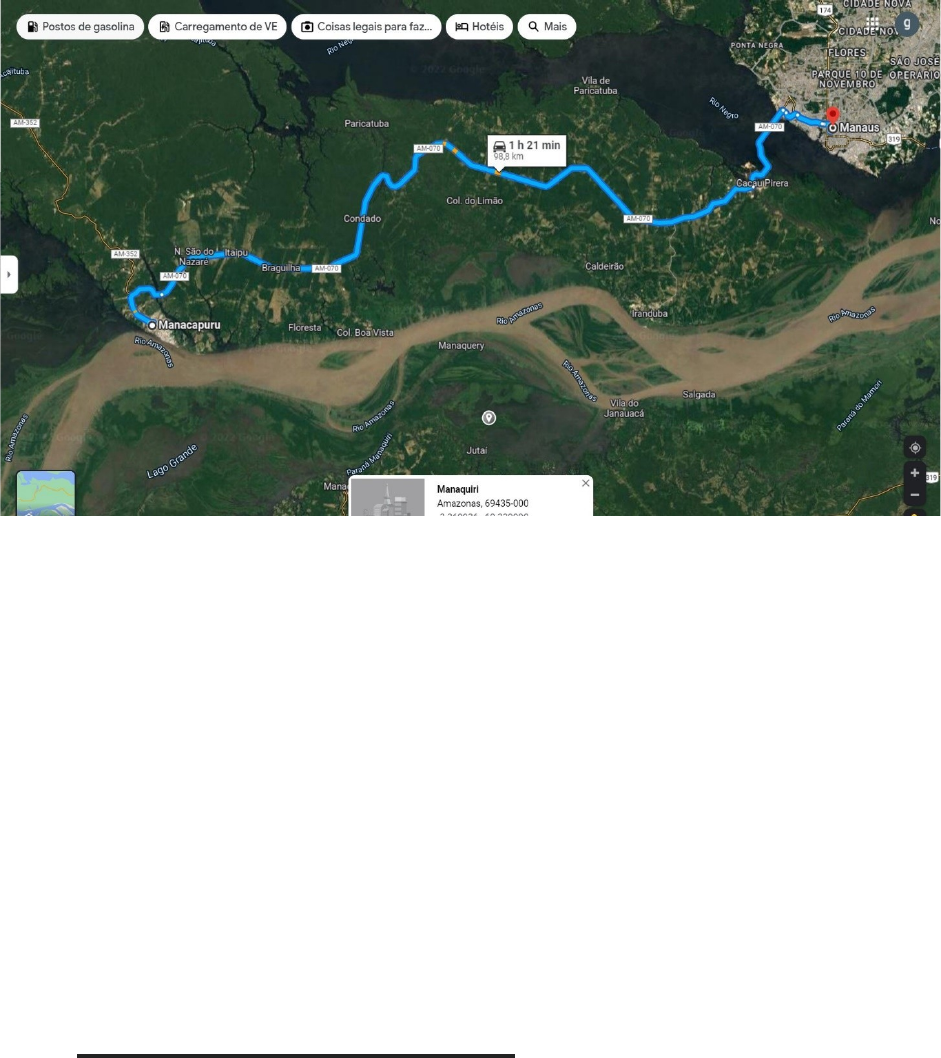 Com base no plano de rota, a primeira rota será a rota entre o centro de Distribuição de Manaus (CD) e a cidade de Parintins, a rota é a mais longa em termos de distância e pode levar até 21 horas. mas com o menor tempo de entrega das mercadorias. Em relação ao meio de transporte a ser utilizado, percebe-se que o transporte fluvial/hidroviário pode ser utilizado para o transporte de mercadorias, a via fluvial/hidroviário, que é um meio de menor custo e também o mais adequado e acessível, a entrega poder ser completada por um veículo rodoviário, como a van/furgão onde a carga seria movida para chegar ao seu destino final. Em relação da cidade de Manacapuru, conta com trajeto curto a ser percorrido e um período maior em relação ao tempo de entrega no prazo solicitado, em relação ao mapa abaixo pode ser observado, podendo saber que gastaria pelo menos 1 dia para a entrega da carga. Com relação ao transporte, seria usado o modo rodoviário, contando com uma ligação entre as estradas que ligam os destinos, o tempo gasto seria em média de 1 h 21 min como pode ser observado acima. Aluno: Joel Silva Dos Santos