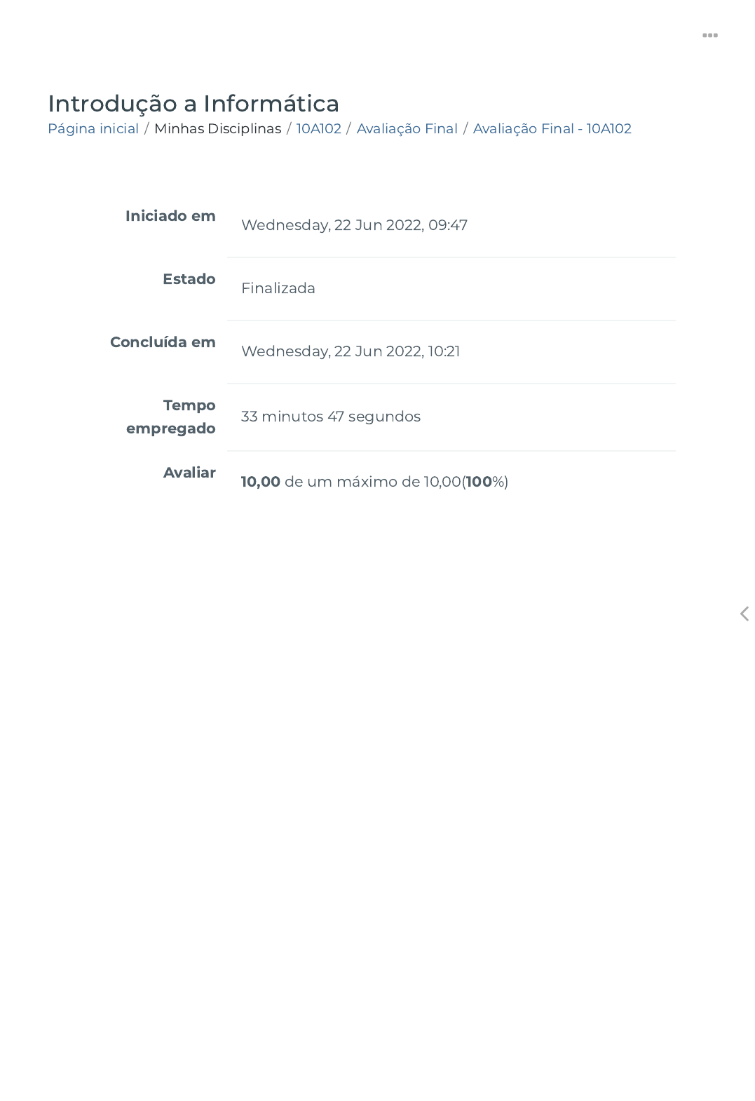 Página inicial / Minhas Disciplinas / 10A102 / Avaliação Final / Avaliação Final - 10A102 Introdução a Informática Iniciado em Wednesday, 22 Jun 2022, 09:47 Estado Finalizada Concluída em Wednesday, 22 Jun 2022, 10:21 Tempo empregado 33 minutos 47 segundos Avaliar 10,00 de um máximo de 10,00(100%) https://ava.politecnicabr.com.br/ https://ava.politecnicabr.com.br/course/view.php?id=829 https://ava.politecnicabr.com.br/course/view.php?id=829#section-27 https://ava.politecnicabr.com.br/mod/quiz/view.php?id=38320 https://ava.politecnicabr.com.br/ Questão 1 Completo Atingiu 1,00 de 1,00 Marque a opção correta: Permite que sejam criados nela atalhos para as funções que o usuário utiliza mais comumente no seu dia a dia. Escolha uma opção: a. Barra de tarefas e acessos b. Barra de atalhos c. Barra de ferramentas de acesso rápido d. Barra de acesso simultâneo https://ava.politecnicabr.com.br/ Questão 2 Completo Atingiu 1,00 de 1,00 Para selecionar todo o texto de um documento, é possível usar qual atalho de teclado? Escolha uma opção: a. Ctrl+X b. Ctrl+T c. Ctrl+V d. Ctrl+F e. Ctrl+A https://ava.politecnicabr.com.br/ Questão 3 Completo Atingiu 1,00 de 1,00 Podemos a�rmar que embora o Microsoft Excel seja um aplicativo bastante focado em fórmulas e cálculos, também é bastante completo em termos de recursos de formatação, o que permite criar planilhas bem apresentadas, com o destaque correto da informação principal, sendo transmitida de forma simples, bonita e organizada. Escolha uma opção: Questão 4 Completo Atingiu 1,00 de 1,00 Podemos a�rmar que o Microsoft Excel recomenda um tipo de tabela estática de acordo com a análise dos dados digitados. Escolha uma opção: Verdadeiro Falso Verdadeiro Falso https://ava.politecnicabr.com.br/ Questão 5 Completo Atingiu 1,00 de 1,00 Podemos a�rmar que embora seja possível alterar o tipo do grá�co para qualquer um dos tipos existentes, sempre é interessante utilizar um tipo de grá�co compatível com a informação. Escolha uma opção: Questão 6 Completo Atingiu 1,00 de 1,00 É determinada qual a fonte de dados que servirá de base para os valores, que �carão como opção de preenchimento das células. Escolha uma opção: Verdadeiro Falso a. Alerta de erro b. Lista c. Fonte d. Permissão https://ava.politecnicabr.com.br/ Questão 7 Completo Atingiu 1,00 de 1,00 É a informação contida na célula, seja em formato de texto ou como resultado de algum cálculo efetuado sobre ela. Escolha uma opção: Questão 8 Completo Atingiu 1,00 de 1,00 Podemos a�rmar que A �m de veri�car todas as fórmulas lógicas existentes no Microsoft Excel, é possível acessar a faixa de opções Fórmulas, e na seção Biblioteca de funções clicar no item Lógicas. Escolha uma opção: a. O formato b. A fórmula c. O valor d. A estrutura Verdadeiro Falso https://ava.politecnicabr.com.br/ Questão 9 Completo Atingiu 1,00 de 1,00 Podemos a�rmar que a opção de “fonte” na formatação de células é a mais conhecida pelos usuários, especialmente aqueles que já fazem uso cotidiano do Microsoft Word. Escolha uma opção: Questão 10 Completo Atingiu 1,00 de 1,00 Podemos a�rmar que o Microsoft Excel possui uma interação de dados e �ltros bem complexos de utilização, porém bem poderosa em termos de performance. Escolha uma opção: Verdadeiro Falso Verdadeiro Falso https://ava.politecnicabr.com.br/ © 2022 - Escola Politécnica Brasileira Entre em Contato https://www.politecnicabr.com.br 0800 084 2627 indisponível devido a pandemia de COVID-19, use outro canal! 0800 084 2627 comercial@politecnicabr.com.br Links Úteis Dicas da nossa Diretora Acadêmica Planner de Estudos Declaração de Matrícula Orientações do AVA Abertura de Ticket Fale com o Tutor Cronograma de Estudos Manual de Estágio Manual de Competência Siga-nos nas redes sociais https://ava.politecnicabr.com.br/mod/quiz/0 https://www.politecnicabr.com.br/ mailto:comercial@politecnicabr.com.br https://soundcloud.com/user-501638417/sets/escola-politecnica-brasileira https://storage.googleapis.com/sirius-pubstore/semestre_plannerdeestudo%20poli.pdf https://storage.googleapis.com/sirius-pubstore/declaracao_matricula.pdf https://storage.googleapis.com/sirius-pubstore/orientacoes_ava.pdf https://storage.googleapis.com/sirius-pubstore/abertura_ticket.pdf https://storage.googleapis.com/sirius-pubstore/fale_com_tutor.pdf https://storage.googleapis.com/sirius-pubstore/cronograma_estudos.pdf https://storage.googleapis.com/sirius-pubstore/manual_estagio.pdf https://storage.googleapis.com/sirius-pubstore/manual_competencia.pdf https://www.facebook.com/politecnicabr https://www.instagram.com/politecnicabr_oficial https://ava.politecnicabr.com.br/