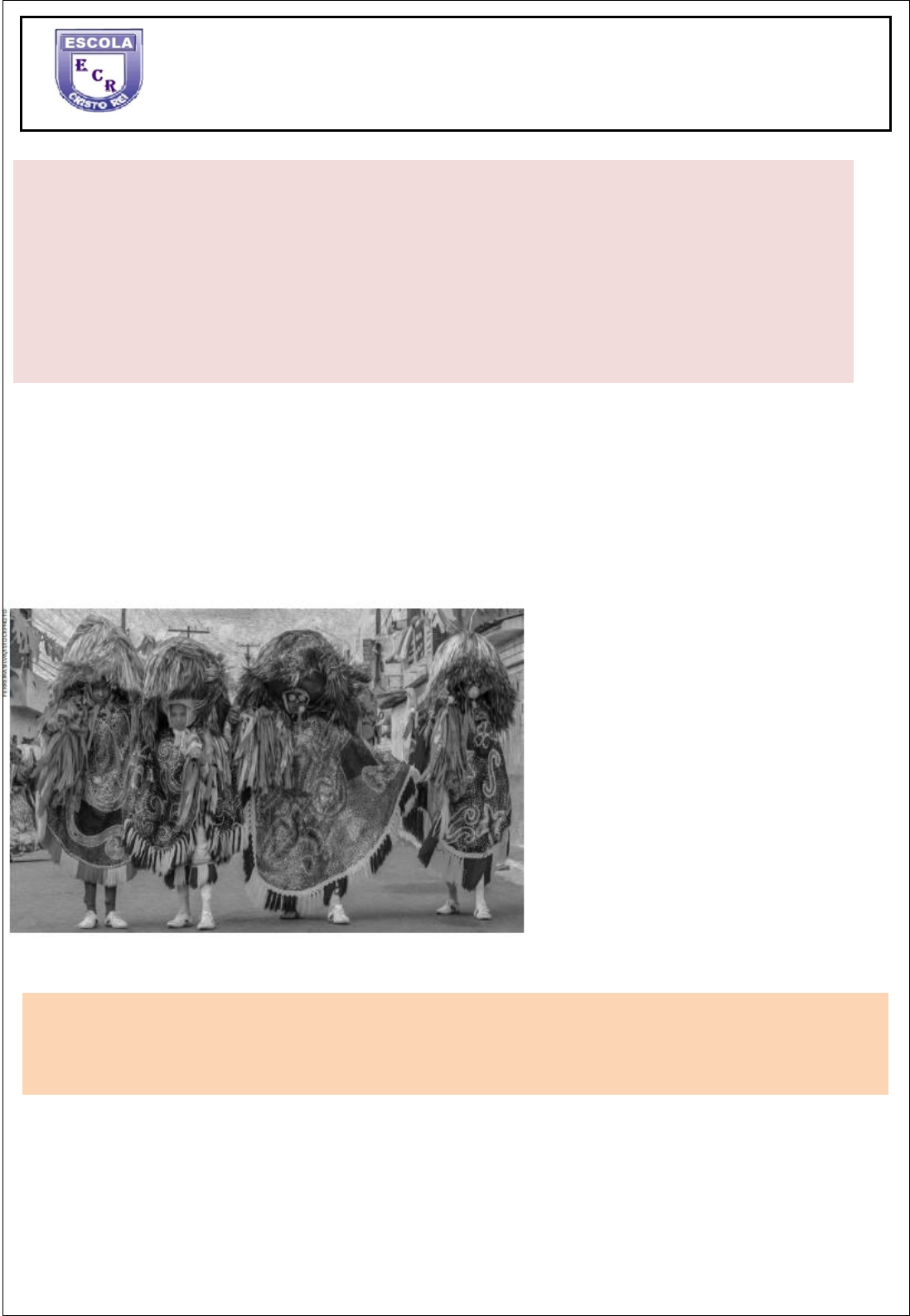 Escola Cristo Rei 3º Bimestre Aluno(a): _________________________________________________________ Série: 4º ano Disciplina: Geografia Valor: 6.0 Nota: ______________ Avaliação Bimestral de Geografia 1. Durante o período de escravidão ocorrido no Brasil, muitas comunidades foram formadas por pessoas que fugiam da sua condição de escravizados e lutavam para que esse modo de exploração tivesse fim. Esses grupos se instalaram em meio às florestas brasileiras e constituíram uma forma de resistência à escravidão, que existiu no Brasil até o ano de 1888. . Essas terras, atualmente, são habitadas por descendentes dos escravos e são territórios essenciais para a manutenção da história e do estilo de vida dessas populações. Essas áreas são denominadas de: a) ( ) territórios quilombolas. b) ( ) terras indígenas. c) ( ) espaço urbano. d) ( ) espaço rural. e) ( ) município. 2. Observe a imagem e responda à questão. A imagem retrata o caboclo de lança, que é o principal símbolo do maracatu rural, dança e música muito comuns na região Nordeste do Brasil. O maracatu pode ser entendido como a) ( ) uma atividade econômica. b) ( ) uma manifestação cultural. c) ( ) um tipo de esporte. d) ( ) uma roupa cotidiana. e) ( ) uma dança europeia. 3. O desenvolvimento sustentável é a ideia de desenvolver a economia do país mantendo o equilíbrio ambiental do planeta por meio de ações que visem preservar os recursos naturais para as gerações futuras. É uma ideia que toda a população pode praticar. Uma atitude que pode ser classificada como sustentável é a) ( ) misturar o lixo orgânico com objetos plásticos. b) ( ) escovar os dentes com a torneira aberta. c) ( ) promover as queimadas. d) ( ) jogar lixo na calçada. e) ( ) separar os materiais que podem ser reciclados. 4. Observe a imagem e responda à questão. 5. A imagem registra um dos principais povos responsáveis pela formação da população brasileira. Trata-se dos a) ( ) indígenas. b) ( ) africanos. c) ( ) europeus. d) ( ) cimigrantes. e) ( ) asiáticos. 5.. Observe a imagem e responda à questão. O total da população do planeta Terra, atualmente, é de aproximadamente 7,8 bilhões de pesso distribuidas entre os continentes, formando grupos com caracteristicas semelhantes como lingua, religião, hábitos alimentares etc. Estas caracteristicas semelhantes destes grupos são conhecidas como a) ( ) valores morais. b) ( ) semelhança física. c) ( ) convivência em grupo. d) ( ) identidade cultural. e) ( ) organizações sociais. 6. Assinale a alternativa correta que apresenta as principais consequências da enorme extensão territorial de nosso país. a) ( ) Uma única cultura e diversos povos. b) ( ) Variadas paisagens naturais e riqueza cultural. c) ( ) Pouca vegetação e muitas indústrias. d) ( ) Diversas línguas oficiais e culturas. e) ( ) Diversos povos e pouca variedade na paisagem natural. “Sábio é o ser humano que tem coragem de ir diante do espelho da sua alma para reconhecer seus erros e fracassos e utilizá-los para plantar as mais belas sementes no terreno de sua inteligência”. (Augusto Cury ) BOA PROVA!!! Escola Cristo Rei 3º Bimestre Aluno(a): _________________________________________________________ Série: 4º ano Disciplina: História Valor: 6.0 Nota: ______________ Avaliação Bimestral de História 1. Observe a imagem e responda à questão. A fotografia mostra um bonde virado na rua durante a Revolta da Vacina, ocorrida em 1904, na cidade do Rio de Janeiro. Esse movimento a) ( ) foi organizado pelas classes mais ricas da sociedade do Rio de Janeiro que eram contra a campanha de vacinação. b) ( ) foi um protesto que exigia a vacinação de todas as pessoas na cidade do Rio de Janeiro. c) ( ) foi provocado pela decisão de vacinar os moradores da cidade do Rio de Janeiro contra a peste bubonica, doença transmitida pela tosse. d) ( ) foi provocado por diversos fatores, entre os quais a falta de informação da população do Rio de Janeiro sobre a variola. e) ( ) tomou controle da cidade do Rio de Janeiro, obrigando o governo a negociar e a não punir as pessoas envolvidas. 2. Em 1808, a família real portuguesa mudou-se para o Brasil. Para transformar a colônia e deixá-la nos moldes das cidades europeias, o rei D. João VI investiu muito dinheiro em melhorias na cidade do Rio de Janeiro, que, em 1763, havia se tornado a sede da colônia. Entre as medidas tomadas pela família real para melhorar o Rio de Janeiro, podemos citar a) ( ) a distribuição de casas para as pessoas que não tinham muitos recursos. b) ( ) a construção de sanitários, quiosques e ruas em várias praias da região. c) ( ) a instalação de postes de energia elétrica em grandes avenidas do centro. d) ( ) a criação da Academia de Artes, do Jardim Botânico e do Museu Nacional. e) ( ) a elaboração de uma ampla rede de esgoto nos maiores bairros residenciais. 3. Leia o texto e responda à questão. Mesmo muitos portugueses tendo vindo para o Brasil durante a colonização, foi a partir da metade do século XIX que o Brasil passou a receber uma maior quantidade de imigrantes. Entre os anos de 1850 e 1930, imigrantes de diferentes nacionalidades chegaram ao país em busca de melhores condições de vida. Texto elaborado com finalidade didática. Com o objetivo de atrair os imigrantes, no final do século XIX e começo do século XX, o governo brasileiro a) ( ) deixou de realizar o controle das fronteiras marítimas do país. b) ( ) providenciou-lhes transporte até os novos locais de trabalho. c) ( ) estabeleceucolônias em regiões povoadas, como a Amazônia. d) ( ) ofereceu-lhes emprego nas fazendas de algodão de São Paulo. e) ( ) concedeu-lhes o direito de morar em qualquer lugar da América. 4. Observe a imagem e responda à questão. A imagem mostra a cidade de Salvador no periodo colonial. Essa cidade a) ( ) foi fundada como uma feitoria para trocar e armazenar o pau-brasil. b) ( ) foi