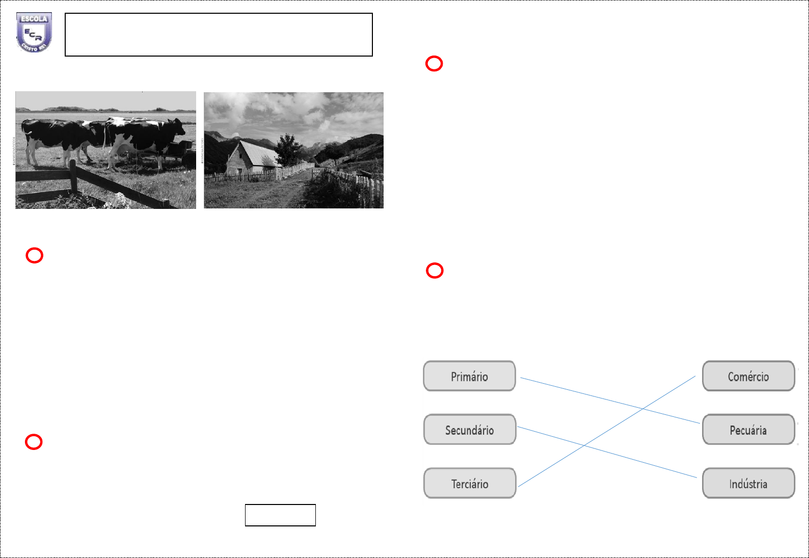 Temporária 1. Ao compararmos as imagens das paisagens, é possível saber que a) as duas retratam paisagens urbanas. b) ambas as imagens registram paisagens rurais. c) a primeira imagem é urbana, e a segunda é rural. d) a primeira imagem é uma paisagem rural, enquanto a segunda é urbana. e) Não é possível concluir sobre os tipos de paisagem apenas pela análise da imagem. 2. Um casal de moradores de uma pequena cidade viaja todo dia, de segunda a sexta, para trabalhar na cidade vizinha, que por ser maior, oferece mais opções de emprego. A viagem realizada pelo casal é chamada de a) migração forçada b) migração definitiva c) migração temporária d) migração externa e) imigração 3. Leia a frase e complete-a corretamente. O turismo é um tipo de migração ______________________________________. 4. Madeira, algodão, alimentos naturais e matérias-primas são exemplos de produtos originados a) nas grandes cidades. b) nos espaços rurais. c) nos espaços urbanos. d) em regiões montanhosas. e) em fábricas e grandes indústrias. 5. Ao abrirmos um pote de manteiga para consumirmos, temos todas as etapas do processo de produção. A relação entre a produção da manteiga e o setor da economia envolvido ao longo de todo o processo está correto em: a) tirar o leite da vaca é parte do setor secundário da economia. b) transformar o leite da vaca em manteiga é parte do setor terciário da economia. c) transportar da fábrica para o supermercado é parte do setor secundário da economia. d) comercializar o pote de manteiga no supermercado é parte do setor terciário da economia. e) criar vacas para leite é parte do setor terciário da economia. 6. Ligue o setor econômico ao tipo de atividade desenvolvida nele. REVISÃO DE GEOGRAFIA 15/06/2021 1. Quantos vértices tem a figura? a) 6 b) 8 c) 7 d) 9 e) 12 2. André tem uma criação de galinhas para produção de ovos. Ontem, ele pegou toda a produção de ovos e distribuiu igualmente em 29 cartelas contendo 12 ovos cada, sem sobrar e nem faltar. Então, a quantidade de ovos da produção de ontem foi a) 348 b) 238 c) 248 d) 338 e) 346 3. Numa divisão exata, o divisor é 8 e o quociente é 499. Para isso, o dividendo deverá ser a) 5421 b) 1256 c) 2481 d) 3380 e) 3992 4. Gabriela participou de um jogo de tabuleiro muito animado, em que ganhou e perdeu pontos em algumas rodadas. A expressão a seguir mostra suas anotações na forma de uma expressão. 45 – 5 + 1 – (10 – 1 + 3) O resultado dessa expressão indica sua pontuação final, que é a) 27 b) 29 c) 31 d) 33 e) 35 5. Em uma fábrica de parafusos, um lote foi produzido com exatamente 8775 unidades, que deverão ser distribuídas em caixas contendo um total de 29 unidades cada. Nessas condições, o número total de caixas que poderão ser preenchidas com essa quantidade de parafusos é a) 17 b) 23 c) 32 d) 302 e) 303 6. Adriana adora um desafio matemático. Sempre que encontra com seu avô, que também é apaixonado por números, ela pede para ele propor um pequeno desafio de cálculo. Na semana passada eles se encontraram, e ele propôs o seguinte cálculo: 5 + 5 x 3 + 2 x (32 – 9 x 2) Bianca deve encontrar o resultado final dessa expressão, que é a) 58 b) 48 c) 72 d) 112 e) 1472 7. Uma cozinheira está fazendo carne assada, e precisa observar o tempo ideal que deve ficar no forno. Ela colocou a carne no forno quando o relógio de parede da cozinha marcava exatamente 19h35. Passando um tempo, do mesmo dia, observou o seguinte horário no mesmo relógio de parede: Nesse mesmo instante, ela tirou a carne do forno. Então, o tempo total que a carne ficou assando no forno foi de a) 45 minutos b) 55 minutos c) 50 minutos d) 1 hora e 45 minutos e) 1 hora e 50 minutos REVISÃO DE MATEMÁTICA – 2º BIMESTRE 1. Antes de existirem as manufaturas, os objetos eram produzidos manualmente por uma pessoa, que era encarregada por todos os estágios de sua produção. Ele era o a) produtor. b) artesão. c) trabalhador d) construtor e) carpinteiro 2. Leia As primeiras fábricas surgiram na Inglaterra. Isso foi possível por vários motivos, entre eles, a) a migração de muitos indivíduos da cidade para a zona rural. b) a grande quantidade de operários em condição de escravidão. c) a disponibilidade de matérias-primas, como o carvão mineral. d) a criação de fábricas que pertenciam aos proletários urbanos. e) a riqueza que vinha das colônias inglesas, como a Argentina. 3. O comércio ganhou força na Europa no Período Medieval. As duas regiões de destaque para o comércio no período foram a. o Mar Mediterrâneo e o norte da África. b. o Mar Mediterrâneo e o norte da Europa. c. a costa da África e o norte da Europa. d. o Oriente e o Oceano Atlântico. e. o Mar Mediterrâneo e o Oceano Atlântico. 4. Leia o texto e responda à questão. O encontro citado foi muito marcante para europeus e indígenas, pois gerou várias consequências. Uma delas foi a) a utilização obrigatória em Portugal das línguas ameríndias. b) a extração do pau-brasil, árvore presente no litoral brasileiro. c) a instalação de fábricas em alguns territórios da América do Sul. d) a troca de mercadorias indígenas por moedas de ouro da Europa. e) a preservação integral das tradições culturais das tribos ameríndias. 5. As cidades europeias criadas durante o Renascimento urbano-comercial eram a) espaços de venda e compra de produtos sem o uso de moedas, uma vez que esses objetos eram proibidos. b) fortalezas protegidas por muralhas que, aos poucos, transformaram-se em grandes centros urbanos. c) áreas dominadas por enormes indústrias, as quais empregavam trabalhadores para diversas funções. d) regiões em que as pessoas não precisavam obedecer a leis ou normas, ao contrário da zona rural. e) centros de convivência marcados por um grande controle em relação à disseminação de doenças. No século XVIII, a Inglaterra presenciou o aparecimento das primeiras fábri