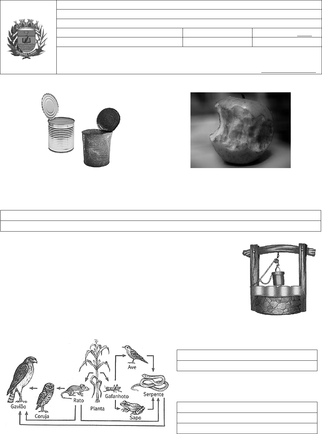 ©PROFESSOR WILLIAM DE ASSIS 1 REDE MUNICIPAL DE ENSINO DE CESÁRIO LANGE EMEF “NATAN PIRES DA SILVA” EXAME FINAL PROFESSOR(ª): William de Assis DISCIPLINA: Ciências DATA: __/__/2022 ALUNO: Nº: ANO/TURMA: 7º B/C “Estudar abre portas que ultrapassam o conhecimento e trazem resultados que podemos ver e segurar com as nossas mãos!” Marianna Moreno 1-Observe as imagens abaixo e responda às questões: a) Nos exemplos acima podemos observar um fenômeno _______________ (químico ou físico). b) Nas imagens podemos ver a mesma mudança no aspecto dos materiais. Que mudança é essa? 2-Para retirarmos água de poços, um balde fica preso no centro e é levado até a água para encher. Sua subida é facilitada graças: a) às alavancas. b) às roldanas. c) às cunhas. d) aos planos inclinados. 3-Observe a teia alimentar abaixo e responda às questões a seguir: a) Qual organismo é o produtor? b) Cite 2 organismos que são consumidores primários. ©PROFESSOR WILLIAM DE ASSIS 2 4-Na figura ao lado o conjunto de peixes que formam uma seta para indicar o caminho são: a) um ecossistema. b) uma comunidade. c) uma população. d) um ecossistema. 5-Leia o trecho da música “O xote das meninas”, de Luiz Gonzaga e Zé Dantas: Mandacaru, quando fulora lá na seca É o sinal que a chuva chega no sertão Toda menina que enjoa da boneca É sinal de que o amor já chegou no coração Meia comprida, não quer mais sapato baixo Vestido bem cintado, não quer mais vestir gibão [...] Fonte: Musixmatch. Compositores: Luiz Gonzaga / Zé Dantas. Letra de O xote das meninas © Irmãos Vitale Sá indústria e Comércio O trecho da música menciona elementos típicos da região Nordeste do Brasil, como o Mandacaru, a seca e o sertão. Que bioma é predominante nessa região? a) Mata Atlântica. b) Cerrado. c) Caatinga. d) Pampas. 6-As savanas africanas são um bioma conhecido mundialmente pela sua biodiversidade de mamíferos. São áreas de milhões de quilômetros com pradarias com pastos de gramíneas e árvores esparsas, de galhos retorcidos, com estações de seca e chuva. No Brasil temos áreas semelhantes que aqui são denominadas: a) Cerrado. b) Caatinga. c) Floresta amazônica. d)Mata atlântica. 7-Observe esta figura, em que estão representados alguns seres vivos presentes no solo de uma mata, com a medida dos respectivos tamanhos: Destes seres, os únicos unicelulares e procariontes são: ©PROFESSOR WILLIAM DE ASSIS 3 a) As bactérias. b) Os fungos. c) Os protozoários. d) Os animais. 8-Escreva quais gases, em sua maioria, compõem o ar atmosférico (não é necessário colocar as porcentagens): 9-Ao processo da troca de gases respiratórios dá- se o nome hematose. Observe o diagrama a seguir. Assumindo que os números I e II representam os gases respiratórios que participam desse processo, podemos dizer que representam, respectivamente: a) Gás carbônico e Oxigênio. b) Oxigênio e Gás carbônico. c) Oxigênio e Nitrogênio. d) Hidrogênio e Gás carbônico. 10-A destruição da camada de ozônio é um problema muito preocupante, pois essa região da estratosfera possui um papel importante na absorção de grande parte da radiação ultravioleta (UV) do Sol, que poderia causar grandes danos aos humanos. Entre esses danos, podemos apontar, exceto: a) Câncer de pele. b) Osteoporose. c) Envelhecimento precoce da pele. d) Redução da eficiência do sistema imunológico. Capilar Sanguíneo Alvéolo Pulmonar I II