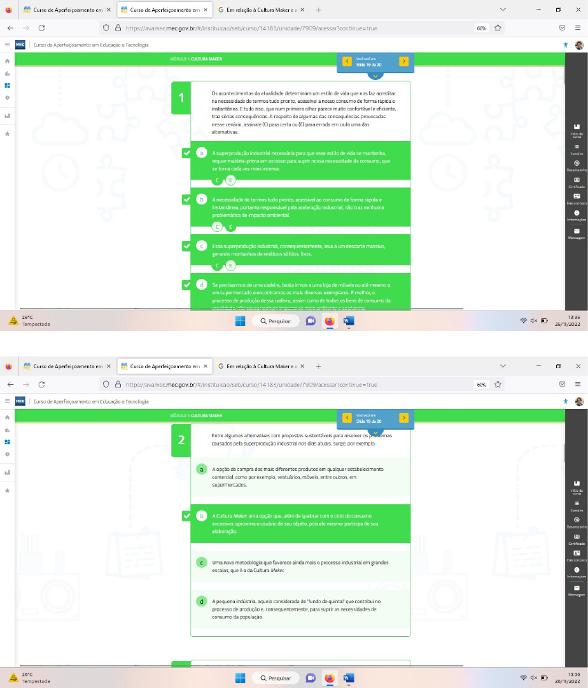 Boa sorte! 1 Os acontecimentos da atualidade determinam um estilo de vida que nos faz acreditar na necessidade de termos tudo pronto, acessível a nosso consumo de forma rápida e instantânea. E tudo isso, que num primeiro olhar parece muito confortável e eficiente, traz sérias consequências. A respeito de algumas das consequências provocadas nesse cenário, assinale (C) para certa ou (E) para errada em cada uma das alternativas. · a A superprodução industrial necessária para que esse estilo de vida se mantenha, requer matéria-prima em excesso para suprir nossa necessidade de consumo, que se torna cada vez mais intensa. · b A necessidade de termos tudo pronto, acessível ao consumo de forma rápida e instantânea, portanto responsável pela aceleração industrial, não traz nenhuma problemática de impacto ambiental. · c Essa superprodução industrial, consequentemente, leva a um descarte massivo, gerando montanhas de resíduos sólidos, lixos. · d Se precisarmos de uma cadeira, basta irmos a uma loja de móveis ou até mesmo a um supermercado e encontramos os mais diversos exemplares. E melhor, o processo de produção dessa cadeira, assim como de todos os bens de consumo da atualidade, não causa nenhum impacto ao meio ambiente e ao planeta. COMENTÁRIO As respostas para cada alternativa estão na seguinte ordem: C E C E 2 Entre algumas alternativas com propostas sustentáveis para resolver os problemas causados pela superprodução industrial nos dias atuais, surge, por exemplo: · a A opção de compra dos mais diferentes produtos em qualquer estabelecimento comercial, como por exemplo, vestuários, móveis, entre outros, em supermercados. · b A Cultura Maker: uma opção que, além de quebrar com o ciclo do consumo excessivo, aproxima o usuário de seu objeto, pois ele mesmo participa de sua elaboração. · c Uma nova metodologia que favorece ainda mais o processo industrial em grandes escalas, que é a da Cultura Maker. · d A pequena indústria, aquela considerada de 'fundo de quintal' que contribui no processo de produção e, consequentemente, para suprir as necessidades de consumo da população. COMENTÁRIO A resposta é a alternativa B 3 Em relação à origem e ao significado da palavra Maker, considerada o núcleo da Cultura Maker, assinale a única opção correta a seguir. · a Etimológica, a palavra maker é proveniente do inglês e corresponde em português ao termo fazer. Entre as definições do dicionário Michaelis, o fazer está relacionado à capacidade de dar existência ou forma a algo, a conceber, criar e produzir a partir de matérias-primas diversas. · b A palavra maker é de origem inglesa e significa fabricar objetos em larga escala e que tenham vida útil de curta duração. · c De origem inglesa, a palavra maker significa implementar no processo de fabricação novas tecnologias que impulsionam ainda mais a produção. · d A palavra maker é proveniente do inglês e corresponde em português ao termo produzir em grandes escalas por meio de parcerias entre diferentes indústrias. COMENTÁRIO A resposta é a alternativa A 4 Até pouco tempo era comum, por exemplo, procurar artesãos, alfaiates para ter peças sob medida. Com o processo de industrialização, a “cultura do fazer” foi perdendo forças contra o crescente monopólio das fábricas e suas produções em larga escala. Para que o estilo de vida pautado no consumo seja cada vez maior e constante, proporcionando um lucro mais expressivo, convencionou-se que não se pode ter produtos duráveis. Em relação a essa temática, marque (C) para certa ou (E) para errada em cada uma das alternativas. · a Todo esse processo de industrialização que vem sendo alimentado desde a Primeira Revolução Industrial (século XVIII), causou e continua causando grandes impactos ambientais. · b O desperdício de matéria-prima e energia para a fabricação dos objetos de consumo “descartáveis” e a nossa dependência a esse consumo excessivo são responsáveis por esses impactos. · c Nesse cenário de produção industrial acelerada, entre algumas alternativas com propostas sustentáveis para minimizar o ciclo de desperdício e de impactos ambientais, surge o movimento Maker. · d Para reduzir o processo de produção industrial em larga escala, é necessário que os objetos fabricados tenham vida curta, ou seja, logo parem de funcionar para que outros possam ser adquiridos. COMENTÁRIO As respostas para cada alternativa estão na seguinte ordem: C C C E 5 Em relação aos quatro pilares básicos, que segundo alguns escritores estruturam o movimento maker, numere a 2ª coluna de acordo com a 1ª. 1 Criatividade 2 Colaboratividade 3 Sustentabilidade 4 Escalabilidade evitar o desperdício de materiais e ressignificar usos e funções quando possível. criar soluções passíveis de serem produzidas em escala e com um custo acessível. fabricar com as próprias mãos e buscar soluções simples para problemas complexos. cooperar com seus pares em um trabalho em rede para que os saberes se somem. COMENTÁRIO As respostas para cada alternativa estão na seguinte ordem: 3 4 1 2 6 Para entender melhor as motivações que impulsionam a Cultura Maker na contemporaneidade, é importante conhecer mais a fundo sobre o seu surgimento e suas especificidades. A esse respeito, assinale a única alternativa correta a seguir. · a O movimento Arts & Crafts - ou Artes & Ofícios em português - surgido na Inglaterra na segunda metade do século XIX, é apontado como um marco diretamente ligado ao movimento Maker atual. O movimento Arts & Crafts era pautado pela valorização do artesanal e pela produção de artefatos por meio de métodos alavancados pela criatividade, opondo-se à produção em massa e à industrialização do artesanato e das artes em geral. · b Com o passar do tempo e com a popularização dos computadores pessoais, o processo de produção em massa de bens descartáveis incorporou di