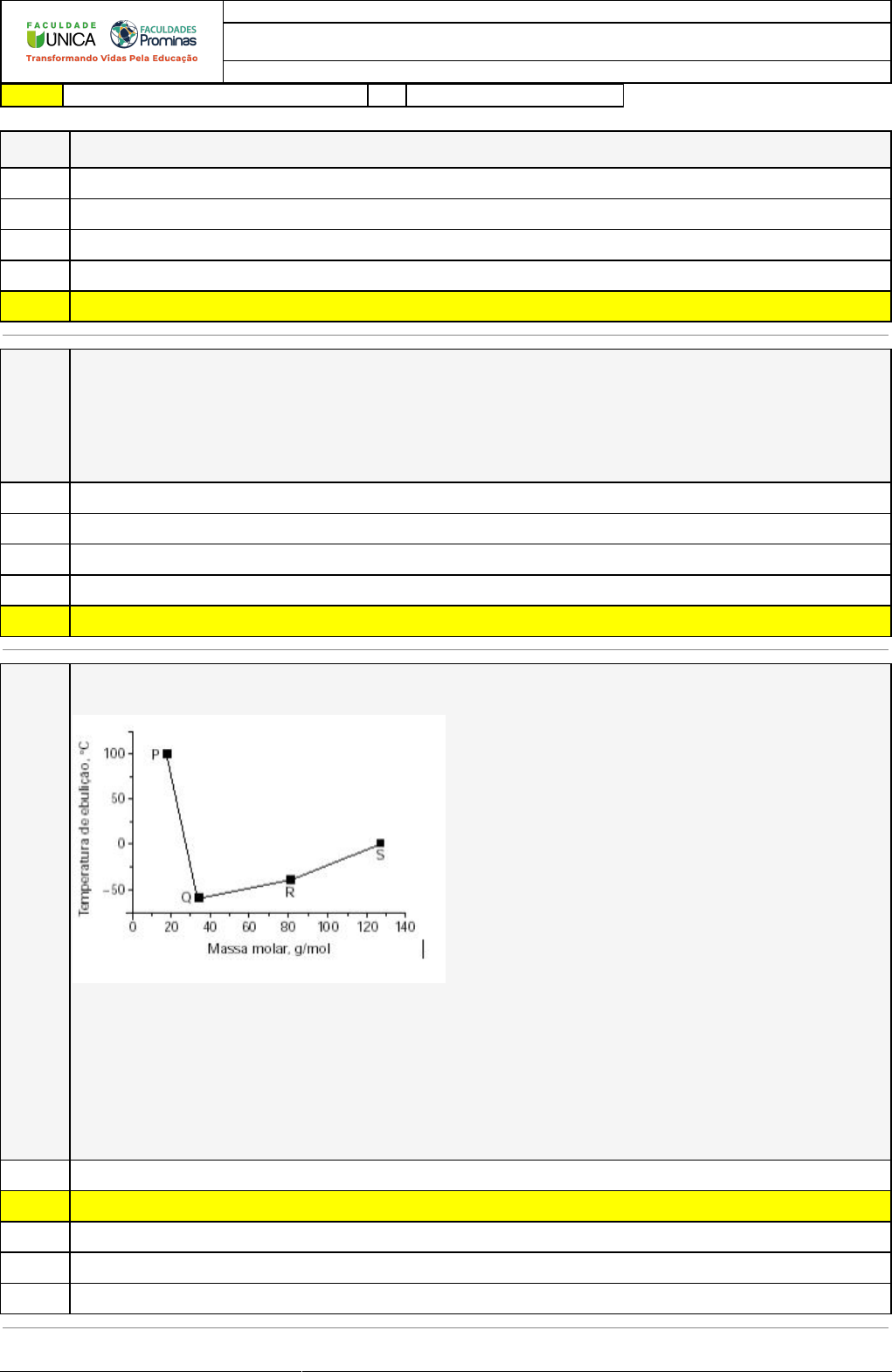 14/06/2021 16:03:43 1/3 REVISÃO DE SIMULADO Nome: TARCÍSIA DA SILVA ALMEIDA Disciplina: Respostas corretas são marcadas em amarelo X Respostas marcardas por você. Questão 001 No gelo seco, as moléculas do dióxido de carbono estão unidas por: A) pontes de hidrogênio. X B) ligações metálicas. C) ligações covalentes. D) ligações iônicas. E) forças de van der Waals. Questão 002 O CO2 é de importância crucial em vários processos que se desenvolvem na Terra, participando, por exemplo, da fotossíntese, fonte de carbono para formação da matéria que compõe as plantas terrestres e marinhas. Sabendo que a molécula de CO2 é apolar, podemos afirmar que as forças intermoleculares que unem as moléculas de CO2 são do tipo A) iônico. X B) forças dipolo-permanente. C) ponte de hidrogênio. D) forças dipolo-dipolo. E) forças de London. Questão 003 O gráfico a seguir foi construído com dados dos hidretos dos elementos do grupo 16. Com base neste gráfico, são feitas as afirmações seguintes. I — Os pontos P, Q, R e S no gráfico correspondem aos compostos H2Te, H2S, H2Se e H2O, respectivamente. II — Todos estes hidretos são gases a temperatura ambiente, exceto a água, que é líquida. III — Quando a água ferve, as ligações covalentes se rompem antes das intermoleculares. Das três afirmações apresentadas A) apenas I e II são verdadeiras. X B) apenas II é verdadeira. C) apenas III é verdadeira. D) apenas I e III são verdadeiras. E) apenas I é verdadeira. 14/06/2021 16:03:43 2/3 Questão 004 O conhecimento das estruturas das moléculas é um assunto bastante relevante, já que as formas das moléculas determinam propriedades das substâncias como odor, sabor, coloração e solubilidade. As figuras apresentam as estruturas das moléculas CO2, H2O, NH3, CH4, H2S e PH3. Quanto às forças intermoleculares, a molécula que forma ligações de hidrogênio (pontes de hidrogênio) com a água é A) CO2. B) PH3. X C) NH3. D) CH4 E) H2S Questão 005 Considere as substâncias: benzeno (C6H6), NH3, I2, CCl4 e H2O, levando em conta suas ligações químicas, polaridade de suas moléculas e os tipos de forças intermoleculares envolvidas. Dentre essas substâncias, é correto afirmar que o solvente mais apropriado para dissolver a amônia, o solvente mais apropriado para dissolver o iodo e uma substância cujas moléculas não formam ligações de hidrogênio são, respectivamente: A) H2O, CCl4 e C6H6. X B) C6H6, CCl4 e I2. C) CCl4, C6H6 e NH3. D) CCl4, H2O e C6H6. E) H2O, CCl4 e NH3. Questão 006 A fralda descartável absorve a urina e evita o contato desta com a pele do bebê. Algumas fraldas descartáveis, entretanto, continuam sequinhas, mesmo após absorverem uma grande quantidade de urina. O segredo destas fraldas reside em um produto químico: o poliacrilato de sódio, um polieletrólito. O poliacrilato de sódio seco, estrutura representada a seguir, quando misturado com água, forma um gel que pode aprisionar cerca de 800 vezes o seu peso em água. A camada interna da fralda também é feita com um polímero, o polipropileno, que não fica molhado, evitando as assaduras no bebê. Quanto aos polímeros poliacrilato de sódio e polipropileno, é correto afirmar que A) o polipropileno não é molhado pela urina porque esta é ácida. 14/06/2021 16:03:43 3/3 B) o poliacrilato de sódio forma ligações de hidrogênio com a água, responsável pela formação do gel. X C) as ligações de hidrogênio intermoleculares no polipropileno são mais intensas do que as deste com a água, fazendo com que não se molhe com água. D) a forte interação do poliacrilato de sódio com a água é devida às forças de dispersão de London. E) o polipropileno não é molhado pela água porque é hidrofílico. Questão 007 Pode-se verificar que uma massa de água ocupa maior volume no estado sólido (gelo) do que no estado líquido. Isto pode ser explicado pela natureza dipolar das ligações entre os átomos de hidrogênio e oxigênio, pela geometria da molécula de água e pela rigidez dos cristais. As interações entre as moléculas de água são denominadas: A) forças de dipolo permanente. B) pontes de hidrogênio. X C) forças de dipolo induzido. D) ligações covalentes. E) forças de Van der Waals. Questão 008 Relativamente às substâncias HF e NaF, fazem-se as seguintes afirmações. [Dados: H (Z = 1); Na (1A) e F (7A)] I - Pertencem à mesma função inorgânica. II - Somente o HF forma pontes de hidrogênio. III - O HF é molecular enquanto o NaF é uma substância iônica. IV - Apresentam o mesmo tipo de ligação em sua estrutura. São corretas apenas: A) I e III. X B) I e II. C) II e III. D) II e IV. E) I e IV.