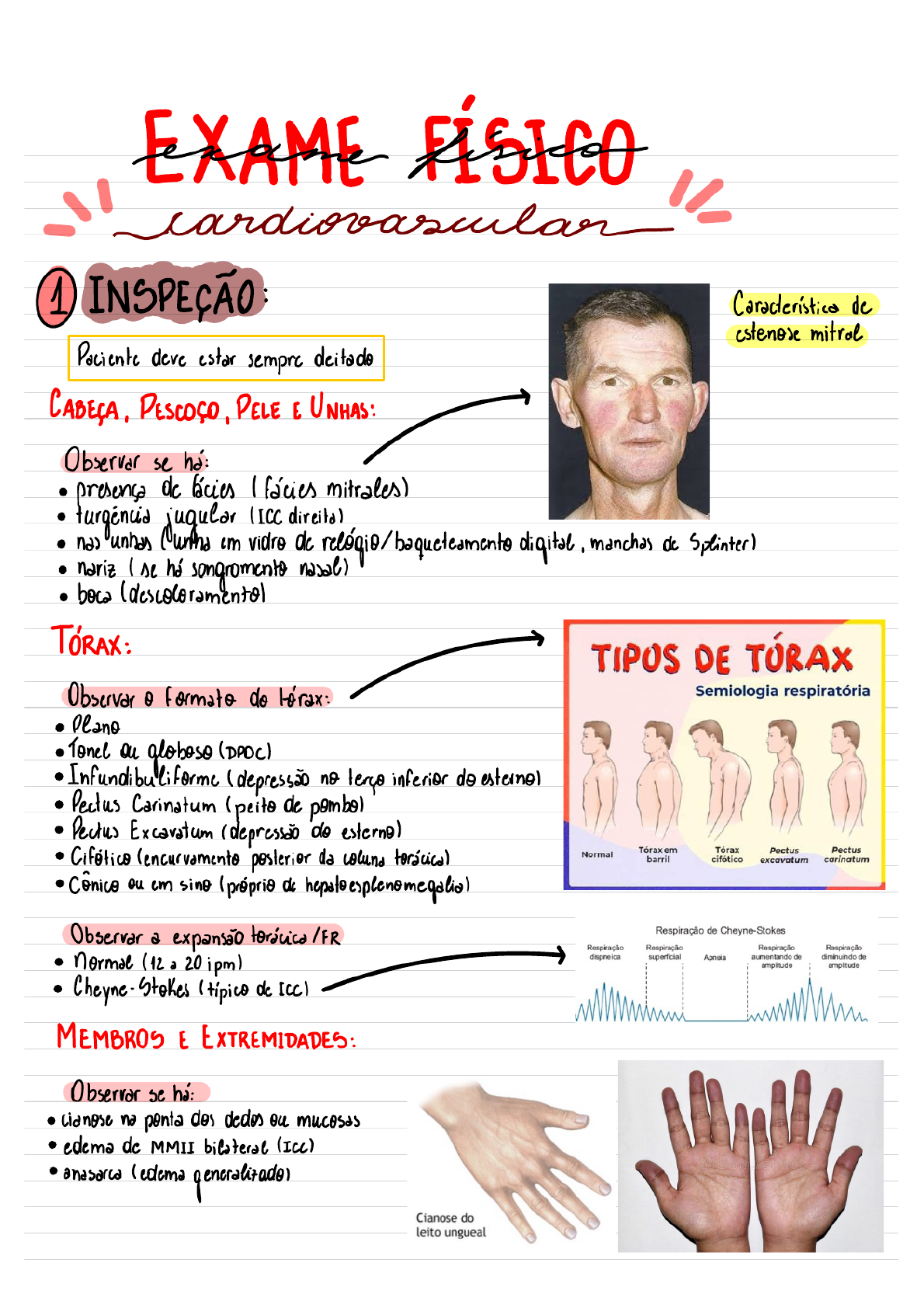 . RESUMÃO PARA O DIA DO OSCE: PALPAÇÃO: P : Linhas Horizontais: I P : PERCUSSÃO: A : Casos Clínicos: DPOC: Pneumonia: Derrame Pleural: Atelectasia: Resumão para dia do OSCE: I : O OSCE TESTE HAM III Monitoras: Bárbara, Maria, Jaqueline e Joslaine 1ª ESTAÇÃO • Paciente 45 anos, sexo masculino, branco, mediolíneo, trabalhava em uma construção civil quando caiu de um andaime de uma altura de 2 metros. Uma viga de ferro que estava fixa no chão, perfurou seu tórax quando o paciente se chocou com a viga. • O resultado da radiografia de tórax solicitada está ao lado: • Qual a possível patologia? • Realize o exame físico do tórax completo, comentando sobre os achados na patologia apresentada. GABARITO • Diagnóstico: PNEUMOTÓRAX • Inspeção: trauma, expansibilidade diminuída, FR aumentada, uso de musculatura acessória • Palpação: dor ao toque se fratura, enfisema, frêmito diminuído • Percussão: som mais timpânico • Ausculta: MV diminuídos, sem RA no lado acometido 2ª ESTAÇÃO • Paciente masculino, 31 anos, previamente hígido, foi admitido em pronto socorro com dor precordial que piora à inspiração e tosse há cerca de 3 horas, relata que a dor irradia para o trapézio, e alivia quando inclina-se para frente. • Ao exame, apresentava-se ansioso, com saturação de oxigênio 95%, frequência cardíaca regular de 106 , pressão arterial de 130 90bpm × mmHg, sem pulso paradoxal e com temperatura axilar de 37,7ºC. À ausculta cardíaca, não se observaram sopros. Em relação aos marcadores de injúria miocárdica, não houve elevação dos seus valores. • Qual a possível patologia? • Realize a ausculta cardíaca e verbalize os focos e suas localizações; • Descreva e realize o exame clínico cardiovascular completo do paciente; GABARITO • Diagnóstico: pericardite; Focos: • Mitral: linha hemiclavicular e 5° EI esquerdo • Tricúspide: linha paraesternal e 5° EI esquerdo • Aórtico acessório: linha paraesternal e 3° EI esquerdo • Pulmonar: linha paraesternal 2° EI esquerdo • Aórtico: linha paraesternal 2° EI direito Exame físico: • Inspeção: dor alivia com a posição de prece maometana ou genopeitoral, pode ter febre • Palpação: pode ter taquicardia • Percussão: sem alterações • Ausculta: atrito pericárdico Impresso por Matheus Costa, E-mail matheusfonseca_costa@hotmail.com para uso pessoal e privado. Este material pode ser protegido por direitos autorais e não pode ser reproduzido ou repassado para terceiros. 16/11/2022 10:32:04 3ª ESTAÇÃO • Paciente homem, 45 anos, comparece ao ambulatório com queixa de nódulo no pescoço. Refere ter notado, há cerca de 3 meses, a presença deste nódulo indolor, acompanhado de sinais flogísticos. • Ele relata que já apresentava aumento de linfonodo na região cervical esquerda há muitos anos, sem regressão ou evolução do tamanho. No mesmo período, iniciou um quadro de febre não aferida, sudorese noturna e emagrecimento (cerca de 12 kg), não associado a mudanças alimentares. • Realize o exame físico dos linfonodos do paciente; • Verbalize em qual cadeia se localiza o linfonodo em questão,linfonodal bem como suas características. Impresso por Matheus Costa, E-mail matheusfonseca_costa@hotmail.com para uso pessoal e privado. Este material pode ser protegido por direitos autorais e não pode ser reproduzido ou repassado para terceiros. 16/11/2022 10:32:04 GABARITO • Cadeias a serem palpadas: pré- auriculares, auriculares posteriores, occipitais, toncilares, submandibulares, submentonianos, cervicais superficiais (encima do esternocleido), cervicais posteriores (posteriores ao esternocleido), cervicais profundos (por baixo do esternocleido), supraclaviculares (esquerdo – Virchow), infraclaviculares, axilares, epitocleares inguinais e, poplíteos Nódulos benignos: • Amolecido • Regular • Alongado (formato de feijão) • Móvel • Doloridos • Calor (rubor) • Isolados • Em geral menores que 1cm • Até 30 dias “aumentado” ESTUDO OSCE - PARTE DA CLÍNICA ESPECÍFICA SISTEMA CARDIOVASCULAR HIPERTENSÃO ARTERIAL Manifestações Clínicas - Cefaleias – principalmente na região occiptal (por trás da cabeça); - zumbido na orelha; - Enjôo; - Tontura; - Palpitação; - Poliúria; - Dispneia de esforço. Classificação da Hipertensão Arterial Nível PAS PAD Ótimo <120 <80 Normal 120-192 80-84 Pré Hipertenso 130-139 85-89 1 140-159 90-99 2 160-179 100-109 3 ≥180 ≥110 Obs.: O diagnóstico é confirmado quando a PA é acima de 140 em 3 momentos diferentes. E em cada momento medir mais de uma vez. Verificar a PA nos dois membros. Estratificação de risco - IMPORTANTE Conscientização do paciente – tratamento não farmacológico e o tratamento farmacológico (quando tem fator de risco e lesão de órgão alvo). Fatores de risco: tabagismo, dislipidemia, diabetes, sedentarismo, obesidade, histórico familiar de problemas cardiovasculares. Lesões de órgão alvo: hipertrofia do ventrículo esquerdo, angina, AVC, nefropatia, Doença Vascular Periférica. Como Extratificar ? Fator de risco Pré -Hipertenso HAS 1 HAS 2 HAS 3 S/fator Sem risco Baixo Moderado Alto Até 2 Baixo Moderado Alto Alto De 3 ... Moderado Alto Alto Alto LOA, DRC, DCV, DM Alto Alto Alto Alto Anamnese Clássica – Para qualquer caso!!! ✓ Identificação ✓ Queixa Principal ✓ HDA ✓ Antecedentes Fisiológicos ✓ Antecedentes Patológicos ✓ Antecedentes Familiares ✓ Condições sócio econômicas e Hábito de vida Atenção! O que não posso esquecer no caso de HAS ? - Hábitos de vida e histórico familiar - Idade - Sexo, etnia - Obesidade (Calcular o IMC = P (kg)/ altura2 (m)) - Tabagismo e elitismo - Fatores socioeconômicos e genéticos - Alimentação - Medicações Exame Físico (antes de iniciar lavar as mãos) Achados específicos: Inspeção - sudorese, cansaço, batimento de fúrcula, turgência jugular a 45 graus, cicatriz, ab