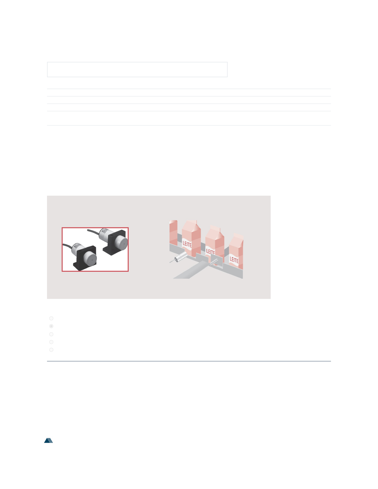 21/02/2021 Unidade 2 - Exercícios de fixação: avaliação da tentativa https://portalacademico.eniac.edu.br/mod/quiz/review.php?attempt=801925&cmid=218625 1/7 Página inicial / Meus Cursos / ENIAC_20211F_1174 / Materiais de Estudo / Unidade 2 - Exercícios de �xação Iniciado em domingo, 21 fev 2021, 13:11 Estado Finalizada Concluída em domingo, 21 fev 2021, 13:27 Tempo empregado 15 minutos 59 segundos Avaliar 10,00 de um máximo de 10,00(100%) Questão 1 Correto Atingiu 1,00 de 1,00 Para a aplicação da �gura anexada, para monitorar caixas cheias de leite e rejeitar caixas sem leite, o sensor mais recomendado, devidamente calibrado, é do tipo: Escolha uma: a. Ótico por barreira. b. Capacitivo. c. Indutivo. d. Ótico re�exivo. e. Magnético. https://portalacademico.eniac.edu.br/ https://portalacademico.eniac.edu.br/course/view.php?id=8794 https://portalacademico.eniac.edu.br/course/view.php?id=8794#section-1 https://portalacademico.eniac.edu.br/mod/quiz/view.php?id=218625 https://atendimento.eniac.edu.br/ 21/02/2021 Unidade 2 - Exercícios de fixação: avaliação da tentativa https://portalacademico.eniac.edu.br/mod/quiz/review.php?attempt=801925&cmid=218625 2/7 Questão 2 Correto Atingiu 1,00 de 1,00 Para a �gura anexada, a medição de altura de líquido (nível) é feita por: Escolha uma: a. Pressão da coluna de líquidos. b. Régua potenciométrica. c. Efeito magnético. d. Ultrassom, com a medição da velocidade do som entre emissor e receptor. e. Laser. http://lrq.sagah.com.br/uasdinamicas/uploads/layouts/1636724137_1566397109538ee14497eb3e344f9d29d613792101eb45451d.png 21/02/2021 Unidade 2 - Exercícios de fixação: avaliação da tentativa https://portalacademico.eniac.edu.br/mod/quiz/review.php?attempt=801925&cmid=218625 3/7 Questão 3 Correto Atingiu 1,00 de 1,00 Questão 4 Correto Atingiu 1,00 de 1,00 Sensores eletrônicos de posição do tipo digital têm como vantagens: Escolha uma: a. Não apresentam desgaste perceptível. b. Têm maior con�abilidade e velocidade em comparação com sensores mecânicos. c. Monitoram sem contato físico. d. Nenhuma resposta está correta. e. As três primeiras respostas estão corretas. Os sensores representados na �gura anexada: Escolha uma: a. São do tipo efeito hall. b. São do tipo indutivo. c. São do tipo ótico re�exivo e de barreira d. São do tipo interruptor mecânico. e. São do tipo magnético.. 21/02/2021 Unidade 2 - Exercícios de fixação: avaliação da tentativa https://portalacademico.eniac.edu.br/mod/quiz/review.php?attempt=801925&cmid=218625 4/7 Questão 5 Correto Atingiu 1,00 de 1,00 Questão 6 Correto Atingiu 1,00 de 1,00 O sensor da �gura anexada funciona pelo princípio: Escolha uma: a. Capacitivo. b. Ótico. c. Piezoelétrico. d. Transformador diferencial. e. Resistivo. A régua potenciométrica tem como principal característica: Escolha uma: a. É um potenciômetro linear de precisão, com tensão proporcional ao curso. b. Utiliza-se de campos magnéticos para medição. c. Trabalha com sinais em corrente alternada. d. Utilizam-se do tempo de propagação da velocidade do som. e. É um transformador diferencial de baixa tensão. 21/02/2021 Unidade 2 - Exercícios de fixação: avaliação da tentativa https://portalacademico.eniac.edu.br/mod/quiz/review.php?attempt=801925&cmid=218625 5/7 Questão 7 Correto Atingiu 1,00 de 1,00 Questão 8 Correto Atingiu 1,00 de 1,00 Sensores de estacionamento de veículos e trenas de medição têm como princípio de funcionamento: Escolha uma: a. Velocidade de propagação da luz. b. Mudanças de densidade do meio. c. Velocidade de propagação do som. d. Nenhuma das alternativas acima. e. Campo magnético. Sensores de posição proporcionais têm aplicação: Escolha uma: a. Para medições imprecisas, mas proporcionais de posição. b. Para medições precisas e proporcionais de posição. c. Não são conectados à peça ou objeto a ser medido. d. Para indicar a presença ou não de um objeto. e. Para medições pouco precisas de posição. 21/02/2021 Unidade 2 - Exercícios de fixação: avaliação da tentativa https://portalacademico.eniac.edu.br/mod/quiz/review.php?attempt=801925&cmid=218625 6/7 Questão 9 Correto Atingiu 1,00 de 1,00 Para a aplicação em anexo, em uma esteira, para monitorar a passagem de latas de refrigerante com alta con�abilidade e velocidade, quais sensores poderiam ser utilizados? Escolha uma: a. Sensor de efeito hall. b. Sensores indutivos, capacitivos e óticos. c. Sensor mecânico de �m de curso. d. Sensores magnéticos. e. Pressostatos. 21/02/2021 Unidade 2 - Exercícios de fixação: avaliação da tentativa https://portalacademico.eniac.edu.br/mod/quiz/review.php?attempt=801925&cmid=218625 7/7 Questão 10 Correto Atingiu 1,00 de 1,00 Na imagem da �gura anexada, um emissor e receptor em um lado da esteira e um espelho do outro caracterizam que tipo de sensor digital? Escolha uma: a. Magnético. b. Capacitivo. c. Indutivo. d. Ótico re�exivo. e. Ótico por barreira. ◄ Assunto 4 - Sensores de posição II Seguir para... Assunto 5 - Sensores I ► https://portalacademico.eniac.edu.br/mod/lti/view.php?id=218624&forceview=1 https://portalacademico.eniac.edu.br/mod/lti/view.php?id=218627&forceview=1
