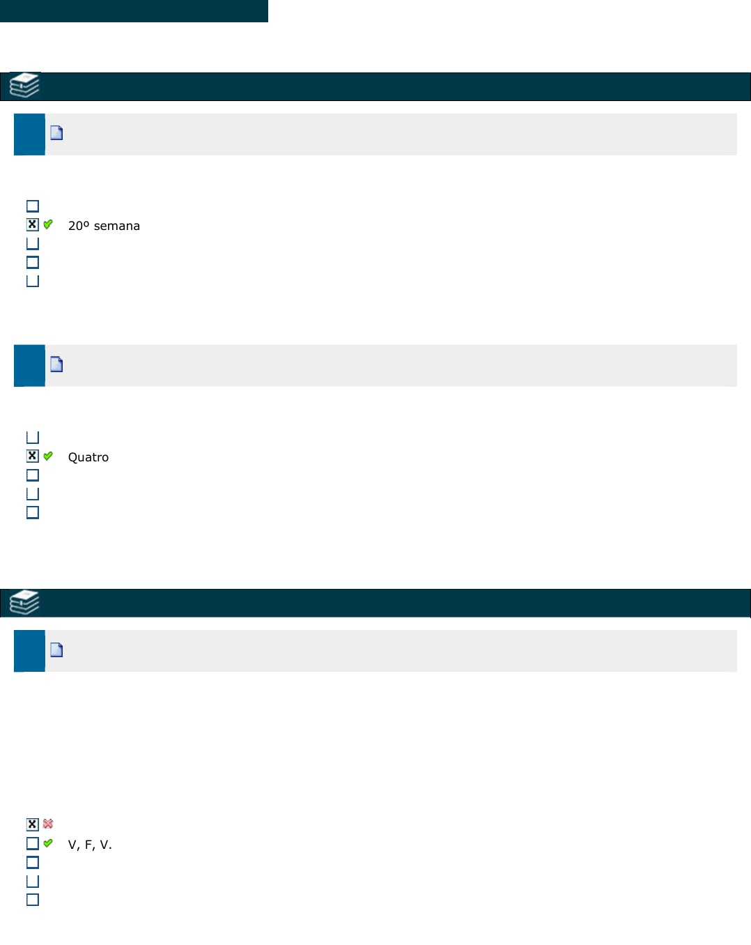 RADIOLOGIA ODONTOLÓGICA 03087 - PRINCÍPIOS EM RADIOLOGIA ODONTOLÓGICA 1. Ref.: 6064044 Pontos: 1,00 / 1,00 A formação dos dentes permanentes se inicia em qual semana intrauterina? 30º semana 20º semana 15º semana 10º semana 25º semana 2. Ref.: 6064046 Pontos: 1,00 / 1,00 Em condições normais, quantos incisivos são esperados por arcada? Oito Quatro Três Seis Dois 03088 - RADIOPROTEÇÃO E BIOSSEGURANÇA 3. Ref.: 6074817 Pontos: 0,00 / 1,00 Assinale V (verdadeiro) e F (falso) sobre as características do colimador. ( ) é um disco de chumbo com abertura central também conhecido como diafragma. ( ) Possui 3,0 mm de espessura e reduz a radiação secundária. ( ) A sua finalidade é limitar o campo de atuação dos raios X. V, V, V. V, F, V. F, F, F. F, F, V. V, V, F. FRANCISCO TAVARES Realce FRANCISCO TAVARES Realce FRANCISCO TAVARES Realce FRANCISCO TAVARES Realce FRANCISCO TAVARES Realce FRANCISCO TAVARES Realce 4. Ref.: 6074818 Pontos: 1,00 / 1,00 As profissionais gestantes têm um tratamento diferenciado durante a rotina funcional para a proteção do embrião das radiações ionizantes que podem causar malformações. Sobre este tema, todas as alternativas estão corretas, EXCETO: I. A gestante, assim que tomar conhecimento da sua condição, deve notificar imediatamente ao seu empregador; II. A legislação trabalhista assegura que durante o afastamento das atividades que utilizam a radiação ionizante, o salário e todos os direitos sejam mantidos, inclusive o retorno para a sua função anterior; III. Após a notificação da sua condição de gestante, o empregador tem a faculdade de remanejar a mulher para outra função, para que o feto não receba dose efetiva superior a 2 mSv durante o resto do período de gestação; IV. A trabalhadora deve ser afastada das atividades que utilizam a radiação ionizante, devendo ser remanejada para outra atividade compatível com a sua formação; V. O exercício do trabalho deve ser controlado para que, a partir da notificação da gravidez, o feto não receba dose efetiva superior a 1 mSv durante o resto do período de gestação. Qual/quais dessas alternativas estão corretas? II e IV. I e III. I, II, IV e V. I e II. II, III e V. 03089 - MÉTODOS AVANÇADOS 5. Ref.: 6082402 Pontos: 1,00 / 1,00 Os aparelhos de tomografias são uma evolução direta dos aparelhos de radiografia panorâmica, através da implantação de tecnologia de imagem em 3D nos mesmos. Para a formação da imagem tomográfica, o computador: Atribuí um valor a cada pixel da imagem digital que representa a espessura do tecido, e esse número é proporcional à intensidade que raios X incidem nos detectores Atribuí um valor a cada voxel da imagem digital que representa a densidade do tecido, e esse número é proporcional à intensidade que raios X incidem nos detectores Atribuí um valor a cada pixel da imagem digital que representa a densidade do tecido, e esse número não é proporcional à intensidade que raios X incidem nos detectores Atribuí um valor a cada voxel da imagem digital que representa a densidade do tecido, e esse número não é proporcional à intensidade que raios X incidem nos detectores Atribuí um valor a cada pixel da imagem digital que representa a densidade do tecido, e esse número é proporcional à intensidade que raios X incidem nos detectores 6. Ref.: 6082254 Pontos: 1,00 / 1,00 Todo tomógrafo possui um Campo de Visão (FOV, de Field of View) variável. O FOV escolhido determina o tamanho FRANCISCO TAVARES Realce FRANCISCO TAVARES Realce FRANCISCO TAVARES Realce FRANCISCO TAVARES Realce da área do corpo que irá aparecer no exame, o operador aumenta ou diminui o campo de acordo com a região de interesse. Sobre o Campo de Visão (FOV) utilizado nos tomógrafos analise as alternativas abaixo: I. O tamanho do FOV é variável nos aparelhos modernos II. O tamanho do FOV deve ser determinado pelo operador de acordo com o tamanho da área de interesse III. Não interfere na qualidade final do exame IV. Quanto maior o FOV utilizado, pior a qualidade da imagem V. Quanto maior o FOV utilizado, maior a dose de radiação absorvida pelo paciente Marque a alternativa correta: I, II, III I ,II, IV, V I, III, IV I, II, IV I, IV 03100 - ANATOMIA E PATOLOGIA 7. Ref.: 6078750 Pontos: 0,00 / 1,00 Durante a fase de desenvolvimento dos dentes podem ocorrer variações de forma do elemento dentário que são consideradas como anomalias e não patologias. Correlacione a coluna das anomalias com a sua correta definição. (1) Fusão (2) Concrescência (3) Geminação ( ) Dentes unidos pelo cemento. ( ) União de dois dentes com imagem de coroa dentaria dupla e cavidades pulpares separadas. ( ) Dentes unidos dos com imagem de coroa bífida e um conduto radicular em comum. Assinale a alternativa que apresenta a sequencia correta. FRANCISCO TAVARES Realce FRANCISCO TAVARES Realce 2-3-1 1-2-3 3-2-1 1-3-2 2-1-3 8. Ref.: 6078554 Pontos: 0,00 / 1,00 Os dentes são formados pela coroa dentária e raiz. Cada uma dessas estruturas anatômicas conta com um grau de radiopacidade diferente, caracterizado por sua interação com os raios X devido a sua composição, espessura e densidade. Marque a alternativa correta que representa uma estrutura dentária que possui imagem radiolúcida: Esmalte Polpa Dentina Lâmina dura Osso alveolar 03107 - EQUIPAMENTOS ODONTOLÓGICOS 9. Ref.: 6072969 Pontos: 1,00 / 1,00 Analise as afirmações sobre processamento químico radiográfico: I- Cada cristal de brometo prata na emulsão que foi exposto aos Raios X ficam sensíveis à revelação e formam imagem radiográfica. II- O revelador transforma os cristais irradiados em cristais metálicos de prata, formando as áreas claras da radiografia (radiopacas). III- O fixador remove os cristais de brometo de prata não expostos aos Raios X e não processados. IV- A remoção dos cristais de prata não expostos gera as imagens escuras (radiolúcidas) na radiografia. V-V-V-V F-F