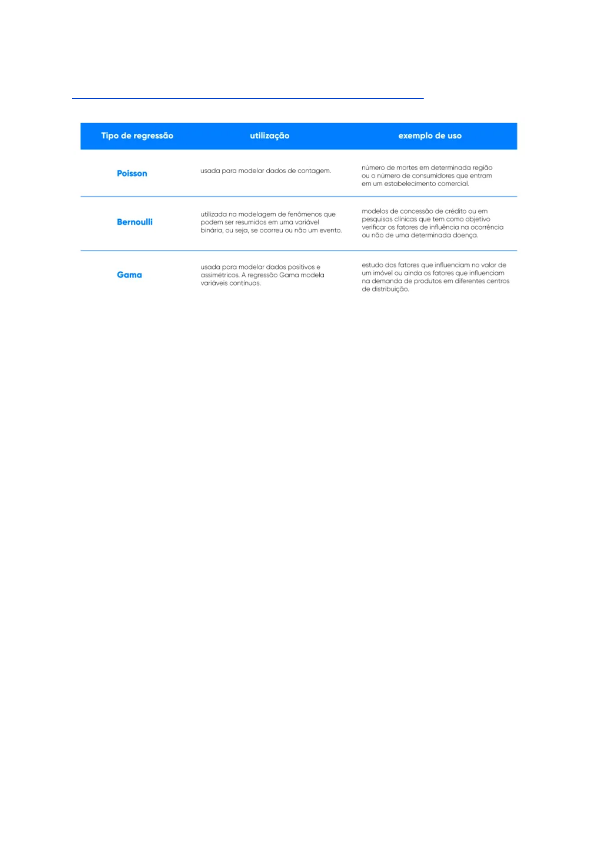O que um MLG precisa ter? https://operdata.com.br/blog/o-que-sao-modelos-lineares-generalizados/ Os MLGs (Modelos Lineares Generalizados) são uma extensão dos modelos de regressão simples e múltipla. Eles possibilitam utilizar outras distribuições para os erros e uma função de ligação relacionando a média da variável resposta à combinação linear das variáveis explicativas. Os modelos lineares generalizados são ajustados aos dados pelo método de máxima verossimilhança, fornecendo não apenas estimativas dos coeficientes de regressão, mas também erros padrão assintóticos estimados, ou seja, em amostras grandes dos coeficientes. Estima o beta, nas componentes sistemáticas Modelo satisfatório? o deviance e se os betas são significativos Na distribuição gama é importante a variabilidade, ou seja o deviance é escalonado é a partir da componente aleatória que se define qual modelo deve ser utilizado Funções de ligação: IDENTIDADE, LOGARÍTMICA E RECIPROCIDADE Regressão linear os dados tem que simétricos estimativa é com máxima verossimilhança REGRESSÃO GAMMA São para dados positivos e assimétricos o deviance tem que ser o escalonado = deviance residual X Alpha do gamma.shape com isso constrói a tabela pro resíduo o valor tem que cair dentro da área de aceitação, p value alto, acima de 5% https://operdata.com.br/blog/o-que-sao-modelos-lineares-generalizados/ Regressão Logística ● É um modelo que tem a análise de qualidade se o modelo satisfatório é curva ROC, Matriz de confusão; ● Distingue-se pelo fato de a variável resposta ser binária Yi=0 (fracasso) e Yi=1(sucesso); ● Método da máxima verossimilhança para estimar os parâmetros (β0 e β1); ● A interpretação dos parâmetros de um modelo de regressão logística é obtida comparando a probabilidade de sucesso com a probabilidade de fracasso, usando a função odds ratio - OR (razão de chances); ● Os dados precisam de distribuição binomial para ajustar um modelo logístico; ● Estimar os parâmetros do modelo: método iterativo de Newton-Raphson. Seleção de variáveis: A abordagem tradicional na construção de modelos estatísticos é encontrar o modelo mais parcimonioso que explica os dados. Quanto mais variáveis no modelo, maior se torna a estimativa do erro e mais dependente o modelo fica dos dados observados. Stepwise: procedimento para seleção ou exclusão de variáveis de um modelo é baseado em um algoritmo, AIC e BIC Ajuste do modelo: Teste de Qualidade do Ajuste de Pearson: avalia a discrepância entre o modelo atual e o modelo completo. Determina se as probabilidades preditas se desviam das probabilidades observadas. Se o p-valor do teste for menor do que seu nível de significância escolhido, as probabilidades preditas se desviam das probabilidades observadas. Predição: É válido nesse momento pensar em definir qual ponto de probabilidade define se o “futuro” ponto pertence à categoria “0” ou “1”. Esse ponto é conhecido como ponto de corte. ROC: Uma forma bastante utilizada para determinar o ponto de corte é através da Curva ROC (Receiver Operating Characteristic Curve). A curva ROC plota sensibilidade versus 1-especificidade Binária 0 ou 1 Multinomial ● Quando a variável resposta qualitativa tem mais do que duas categorias, por exemplo, a pressão sanguínea pode ser classificada em: alta, normal e baixa. Regressão para Dados de Contagem - Poisson Exemplos: ● Número de acidentes em uma rodovia por semana; ● Número de automóveis vendidos por dia; Modelos probabilísticos para variáveis aleatórias quantitativas discretas, com suporte no conjunto de números inteiros não-negativos, são potenciais candidatos para a análise de dados de contagens. Regressão para Dados de Contagem - Binomial Negativa Regressão para Dados Positivos e Assimétricos A classe de modelos para a análise de dados positivos assimétricos é bastante ampla, incluindo distribuições conhecidas para os erros, tais como gama, normal inversa, Weibull, Pareto e log-normal. Deviance Deviance: avalia a discrepância entre o modelo atual e o modelo simples por meio da soma dos quadrados dos resíduos. A estatística D, sob a suposição que o modelo ajustado é correto, tem distribuição assintótica qui-quadrado com (J-p) graus de liberdade. Se o p-valor do teste for menor do que seu nível de significância escolhido, as probabilidades preditas se desviam das probabilidades observadas. Motivos comuns para o desvio: - função de ligação incorreta; - dispersão alta dos dados; - covariáveis não bem relacionadas com a resposta. o residual deviance tem que ser menor que Null deviance Assim, um valor mais baixo do desvio residual indica que o modelo ficou melhor quando inclui as duas variáveis independentes. Já o AIC também é baseado no desvio (deviance) e é útil quando queremos comparar modelos e seu valor por si só não é interpretável. Odds ration https://rpubs.com/StevenDuttRoss/razao_de_chances#:~:text=Se%20a%20probabilidade%20de %20sucesso,probabilidade%20aumenta%20ou%20vice%2Dversa.