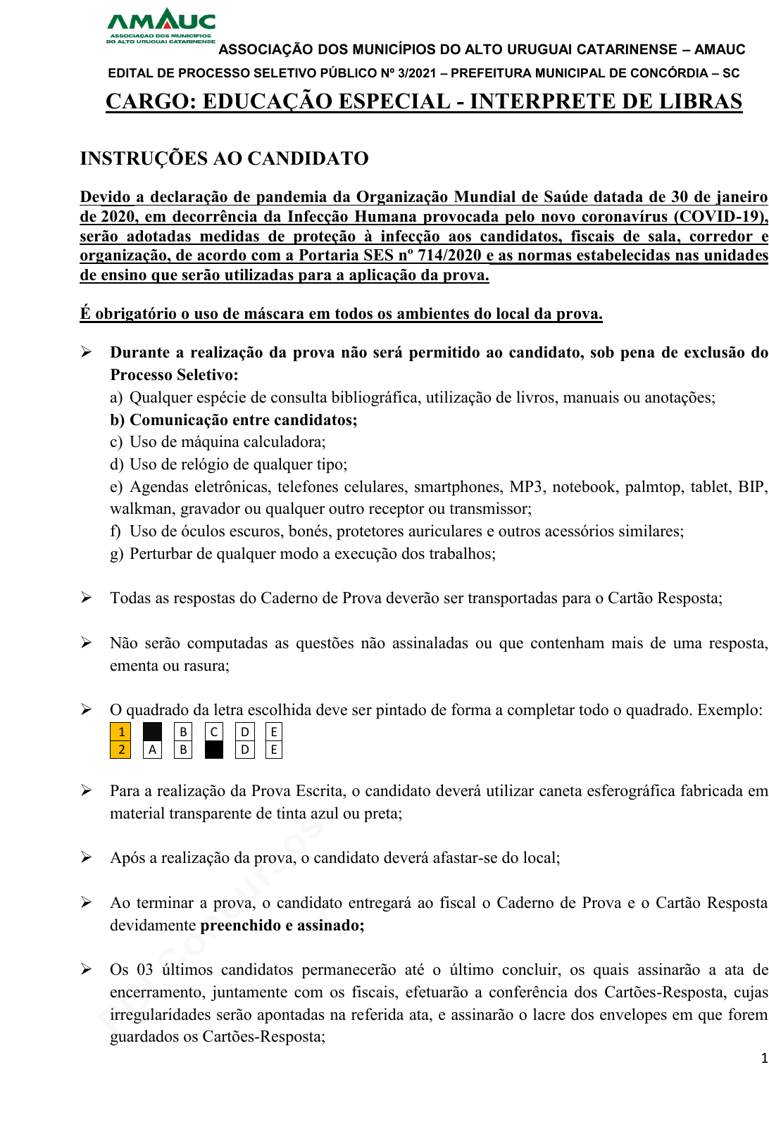 pcimarkpci MDAwMDowMDAwOjAwMDA6MDAwMDowMDAwOmZmZmY6YmI3ODoyMTg1:VHVlLCAyOSBOb3YgMjAyMiAxNTowMToyMyAtMDMwMA== www.pciconcursos.com.br ASSOCIAÇÃO DOS MUNICÍPIOS DO ALTO URUGUAI CATARINENSE – AMAUC EDITAL DE PROCESSO SELETIVO PÚBLICO Nº 3/2021 – PREFEITURA MUNICIPAL DE CONCÓRDIA – SC 1 CARGO: EDUCAÇÃO ESPECIAL - INTERPRETE DE LIBRAS INSTRUÇÕES AO CANDIDATO Devido a declaração de pandemia da Organização Mundial de Saúde datada de 30 de janeiro de 2020, em decorrência da Infecção Humana provocada pelo novo coronavírus (COVID-19), serão adotadas medidas de proteção à infecção aos candidatos, fiscais de sala, corredor e organização, de acordo com a Portaria SES nº 714/2020 e as normas estabelecidas nas unidades de ensino que serão utilizadas para a aplicação da prova. É obrigatório o uso de máscara em todos os ambientes do local da prova.  Durante a realização da prova não será permitido ao candidato, sob pena de exclusão do Processo Seletivo: a) Qualquer espécie de consulta bibliográfica, utilização de livros, manuais ou anotações; b) Comunicação entre candidatos; c) Uso de máquina calculadora; d) Uso de relógio de qualquer tipo; e) Agendas eletrônicas, telefones celulares, smartphones, MP3, notebook, palmtop, tablet, BIP, walkman, gravador ou qualquer outro receptor ou transmissor; f) Uso de óculos escuros, bonés, protetores auriculares e outros acessórios similares; g) Perturbar de qualquer modo a execução dos trabalhos;  Todas as respostas do Caderno de Prova deverão ser transportadas para o Cartão Resposta;  Não serão computadas as questões não assinaladas ou que contenham mais de uma resposta, ementa ou rasura;  O quadrado da letra escolhida deve ser pintado de forma a completar todo o quadrado. Exemplo: 1 B C D E 2 A B D E  Para a realização da Prova Escrita, o candidato deverá utilizar caneta esferográfica fabricada em material transparente de tinta azul ou preta;  Após a realização da prova, o candidato deverá afastar-se do local;  Ao terminar a prova, o candidato entregará ao fiscal o Caderno de Prova e o Cartão Resposta devidamente preenchido e assinado;  Os 03 últimos candidatos permanecerão até o último concluir, os quais assinarão a ata de encerramento, juntamente com os fiscais, efetuarão a conferência dos Cartões-Resposta, cujas irregularidades serão apontadas na referida ata, e assinarão o lacre dos envelopes em que forem guardados os Cartões-Resposta; pcimarkpci MDAwMDowMDAwOjAwMDA6MDAwMDowMDAwOmZmZmY6YmI3ODoyMTg1:VHVlLCAyOSBOb3YgMjAyMiAxNTowMToyMyAtMDMwMA== www.pciconcursos.com.br ASSOCIAÇÃO DOS MUNICÍPIOS DO ALTO URUGUAI CATARINENSE – AMAUC EDITAL DE PROCESSO SELETIVO PÚBLICO Nº 3/2021 – PREFEITURA MUNICIPAL DE CONCÓRDIA – SC 2  A Prova escrita terá início às 08h30min com término às 11h30min. A duração mínima para realização da prova é de 01 (uma) hora, com tempo máximo de 03h00min (três) horas. A Prova será composta por questões de múltipla escolha, sendo cada questão composta de 05 alternativas (a, b, c, d, e), possuindo somente uma alternativa correta;  O Caderno de Provas será composto: CONTEÚDO Nº DE QUESTÕES Língua Portuguesa 05 (cinco) Raciocínio Lógico Matemático 05 (cinco) Conhecimentos Específicos 10 (dez) Total de Questões 20 (vinte)  Verifique se o Caderno de Provas está completo, sem falhas de impressão e se a quantidade de questões está correta;  Você deverá transcrever as respostas das questões para o Cartão-Resposta, que será o único documento válido para a correção das provas.  O preenchimento do Cartão Resposta é de inteira responsabilidade do candidato e não será substituído em caso de erro do candidato. BOA PROVA! pcimarkpci MDAwMDowMDAwOjAwMDA6MDAwMDowMDAwOmZmZmY6YmI3ODoyMTg1:VHVlLCAyOSBOb3YgMjAyMiAxNTowMToyMyAtMDMwMA== www.pciconcursos.com.br ASSOCIAÇÃO DOS MUNICÍPIOS DO ALTO URUGUAI CATARINENSE – AMAUC EDITAL DE PROCESSO SELETIVO PÚBLICO Nº 3/2021 – PREFEITURA MUNICIPAL DE CONCÓRDIA – SC 3 CADERNO DE PROVA LÍNGUA PORTUGUESA 01 – Com base nas regras de colocação pronominal, assinale a alternativa incorreta: a) Se me pagar, farei o trabalho assim que me sobrar um tempinho. b) Tenho dedicado-me muito ao estudo da Língua Portuguesa. c) Tudo aquilo lhe passou despercebido. d) Ninguém nos falou sobre o problema da empresa. e) Não, converta-se ao cristianismo urgentemente. 02 – Sobre a regência do verbo “perdoar”, analise: I – É verbo pronominal em: “Não se perdoou sofrimento e muita lida para dar aos filhos uma vida digna.”. II – É verbo transitivo direto em: “A virtude, a beleza, o talento, a mocidade, a força, a saúde, e principalmente a fortuna, eis o que ele não perdoava a ninguém, amaldiçoando todo aquele que conseguia o que ele não obtivera […]”. III – É verbo transitivo indireto em: “Ele perdoou a todos da família, inclusive aos que o caluniaram.”. Dos itens acima: a) Apenas os itens I e III estão corretos. b) Apenas o item I está correto. c) Apenas o item II está correto. d) Apenas os itens II e III estão corretos. e) Todos os itens estão corretos. Sobre a análise sintática da oração e do período, analise o período a seguir para responder às questões 03 a 05: “Anunciou-se que o novo pacote do governo entrará em vigor amanhã.” 03 – É correto afirmar que a partícula “que” introduz uma: pcimarkpci MDAwMDowMDAwOjAwMDA6MDAwMDowMDAwOmZmZmY6YmI3ODoyMTg1:VHVlLCAyOSBOb3YgMjAyMiAxNTowMToyMyAtMDMwMA== www.pciconcursos.com.br ASSOCIAÇÃO DOS MUNICÍPIOS DO ALTO URUGUAI CATARINENSE – AMAUC EDITAL DE PROCESSO SELETIVO PÚBLICO Nº 3/2021 – PREFEITURA MUNICIPAL DE CONCÓRDIA – SC 4 a) Oração subordinada substantiva completiva nominal. b) Oração subordinada substantiva objetiva direta. c) Oração subordinada substantiva subjetiva. d) Oração subordinada adjetiva restritiva. e) Oração subordinada adverbial causal. 04 – O tre