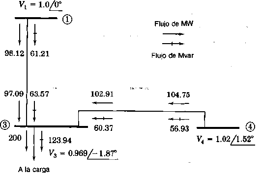 Flujos de P y Q en la barra (5) del sistema del ejemplo 9.5. Los números al lado de las flechas muestran el flujo de P y Q en megawatts y megavars. El voltaje de barra se muestra en por unidad.