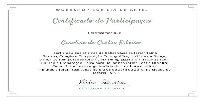 ATIVIDADES COMPLEMENTARES ALUNO: CAROLINE DE CASTRO RIBEIRO, RA: 0529640, CURSO: EDUCAÇÃO FISICA- BACHAREL EAD, POLO SÃO JOSE DOS CAMPOS TIPO: ATIVIDADES ESPORTIVAS Participação no workshop de Ballet clássico, Criação e Composição Coreográfica, História da dança, Dança contemporânea, jazz, hip hop e Preparação física para bailarinos. Data:06/04/2019. Ministrada: Zoe cia de Artes, na cidade de Jacareí- SP. RESUMO :Workshop realizado na finalidade de arrecadar lucros para a companhia ZOE, que busca ensinar diversas modalidades de dança para bairros carentes no vale do paraíba. O conteúdo abordado no curso foi diversificado e voltado para idade acima de 14 anos, na sala havia bailarinos de todos os níveis e todos nós conseguimos agregar algum tipo de ensinamento para nossa carreira. Durante o curso tivemos aula de ballet clássico, criação coreográfica, história da dança, dança contemporânea, jazz dance, hip hop e preparação física. BENEFICIOS PARA MINHA FORMAÇÃO ACADEMICA: Neste dia tive experiencias que nunca achei que teria, como por exemplo o hip hop, pois sempre fui voltada as danças clássicas e ter o primeiro contato com um tipo de dança urbana foi inovador e me trouxe uma nova perspectiva para a dança. Além de aprender métodos para ajudar na criação de coreografias, estimulando a criatividade e a sair do nosso âmbito de conforto coreográfico. E com toda certeza a minha aula favorita foi a de preparação física, onde pude juntar as duas áreas que eu amo na educação física, aprendendo ainda mais a importância de um treinamento de força na prevenção contra lesões em bailarinos. ANEXO: