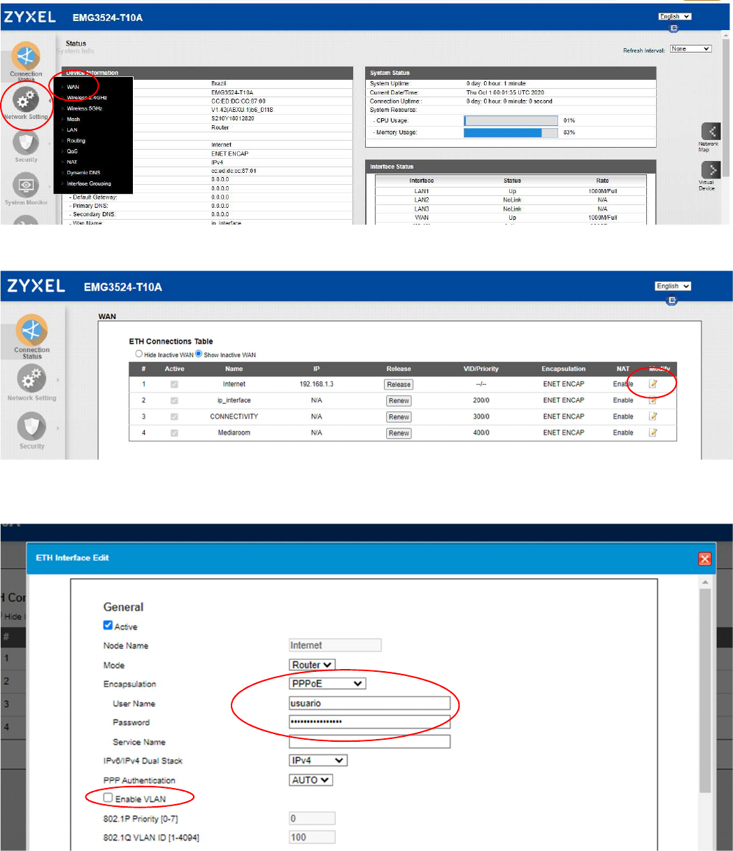 Passo a passo do roteador Zyxel Usuario/ senha: admin/ admin 1º .: Configurar WAN: Network Setting -> WAN 2º .:Na tela seguinte, editar a primeira WAN -> 1 Internet 3º .: Após clicar para editar, irá abrir uma outra tela com as configurações da WAN, desmarcar Enable VLAN – em Encapsulation selecionar PPPoE e colocar usuário e senha. 4º .: Habilitar o acesso remoto -> Maintenance -> colocar em PORT 6680 e em Server Access trocar para WAN 5º .: Alterar nome da rede e senha. Ir em Network Setting -> Wireless 2.4GHz e Wireless 5GHz.P
