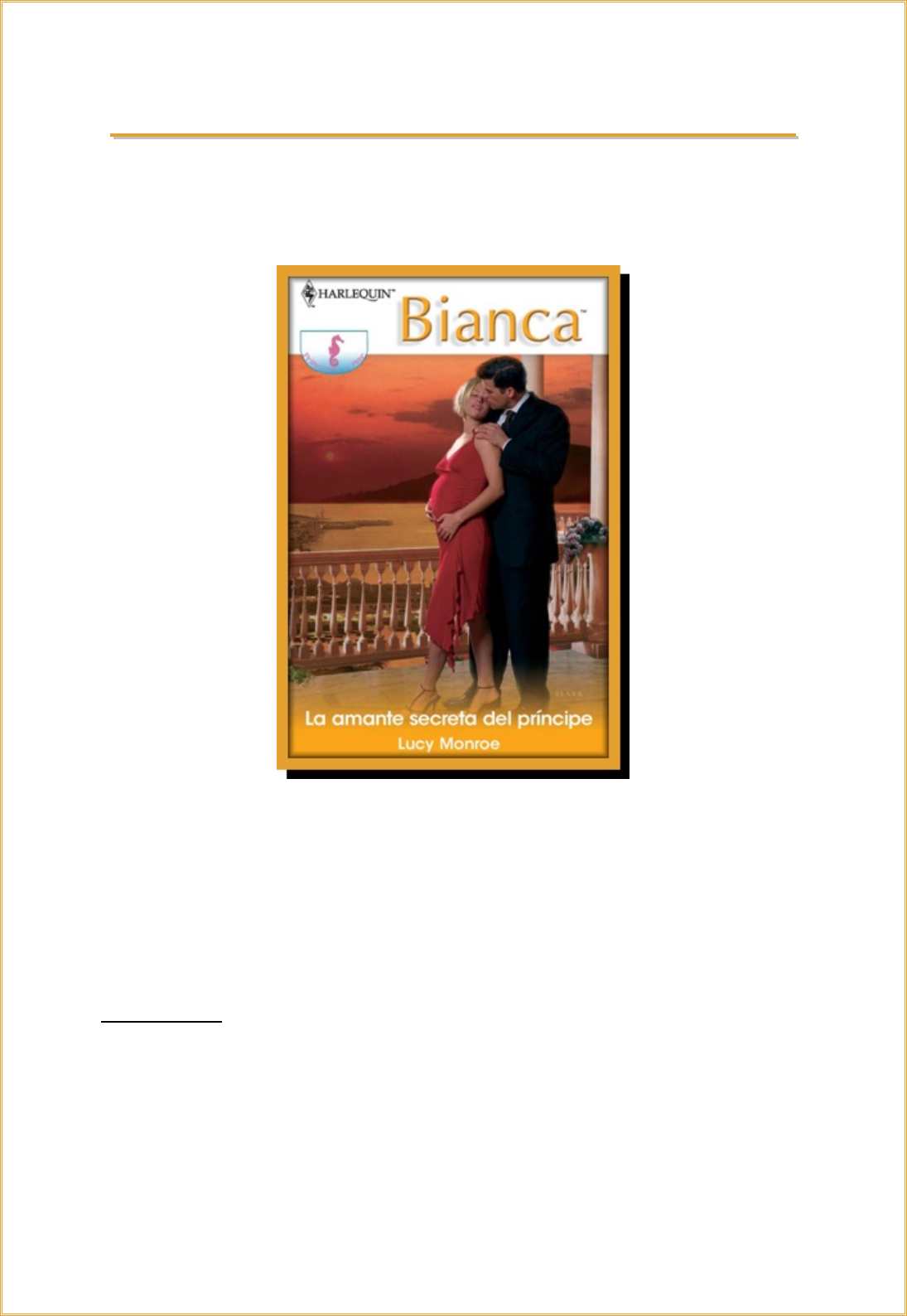 LLaa aammaannttee sseeccrreettaa ddeell pprríínncciippee LLuuccyy MMoonnrrooee 44ºº PPrriinncceessaass ddeell mmaarr Lucy Monroe - La amante secreta del príncipe (10.2009) Título Original: His Royal Love-Child (2006) Serie: 4º Princesas del mar Editorial: Harlequin Ibérica Colección: Deseo 1958 Género: Contemporánea-Príncipes Protagonistas: Marcello Scorsolini y Danette Michaels Argumento: Danette Michaels conocía las reglas del juego cuando se convirtió en la amante secreta del príncipe Marcello Scorsolini. No habría matrimonio entre ellos, ni futuro en común, ni reconocimiento público. Sólo tenía su fuerte cuerpo siciliano y toda su pasión. Pero Danette no soportó seguir siendo su inconfesable secreto ni un día más. Quería todo o nada; y eso significaba que su aventura había terminado. https://www.facebook.com/novelasgratis Escaneado y corregido por ID Nº Paginas 2-100 CCaappííttuulloo 11 Danette Michaels cerró el periódico de pequeño formato y lo dejó sobre la mesa de centro cuidadosamente. No le temblaban las manos, y eso le sorprendió porque por dentro estaba muerta de dolor. No dijo nada, aunque tuviera ganas de gritar; y también de hacer trizas el ofensivo periódico… Pero no podía. Si volvía a tocar el periódico… si desahogaba aunque fuera una mínima parte de la tormenta que le desgarraba el alma, perdería totalmente el control. Se negaba a hacerlo. Llevaba años controlando sus sentimientos, rechazando tanto el dolor físico como emocional, y también negándose la posibilidad de llorar. La traición de Ray le había hecho llorar, y entonces había jurado no volver a permitir que otro le hiciera lo mismo; ni siquiera el príncipe Marcello Scorsolini. —Este hombre es una delicia, ¿verdad? —suspiró Lizzy, ajena a la desolación que su visita le había causado a Danette. Se inclinó, abrió de nuevo el periódico y señaló la fotografía que tanta angustia le estaba provocando a Danette en esos momentos. —¿Te imaginas ser esa mujer? Aunque no quería, Danette se fijó en la fotografía, sin poder evitarlo. Una emoción tan fuerte como el amor que le desangraba el corazón fue lo que la empujó a mirar. La necesidad de saber, y la necesidad desesperada de haberse equivocado. Pero no había sido así. La fotografía era la misma que ella ya había visto. Mostraba al apuesto presidente de Naviera Scorsolini del brazo de una mujer igualmente atractiva en la fiesta de cumpleaños del padre de él celebrada en Isla Scorsolini. En la foto, el príncipe y la rubia estaban prácticamente pegados el uno al otro. El príncipe Marcello sonreía, y la mujer parecía una bella y elegante gatita que acabara de tomarse un cuenco de rica crema. ¿Cómo había podido ser tan tonta para liarse con ese hombre? ¿De creer que tenían lo suficiente en común en lo importante? Había caído en sus brazos sin pensar en las consecuencias. Ella le había entregado su virginidad, no había pedido nada a cambio salvo su pasión. Él le había ofrecido su fidelidad, pero esa foto le hacía dudar de la sinceridad de sus palabras. Contrariamente a lo que él le había dicho, su príncipe era el rey de los playboys. ¿Sería una estúpida con los hombres, o simplemente no tenía suerte? —Danette, vuelve a la tierra, por favor. ¿Eh, hay alguien ahí? La voz de Lizzy penetró en sus pensamientos. —¿Qué? —¿Dónde estabas, chica? No me digas que estabas pensando en el trabajo. https://www.facebook.com/novelasgratis Escaneado y corregido por ID Nº Paginas 3-100 —Sí, algo así —dijo Danette en tono tenso. Para ella, su trabajo y su amante estaban inexorablemente ligados. —Te he preguntado si te imaginas que fueras esa mujer. Se lo imaginaba sin problemas; aunque cuando Marcello la abrazaba de ese modo, ella nunca llevaba un vestido de diseño como el de la belleza de la foto. La mayor parte del tiempo, estaba desnuda. —Sí. Lizzy se echó a reír. —Tienes mejor imaginación que yo, entonces. —En realidad no. —¿Estás bien? —le preguntó Lizzy, con el rostro crispado de preocupación—. Te veo atolondrada; y es algo más que tu preocupación habitual por hacer todo tu trabajo a la perfección. Danette dejó de mirar la foto y miró a su amiga, una joven rubia y menuda. Las dos eran estadounidenses, pero allí era donde terminaban las similitudes. Lizzy medía uno cincuenta y cinco aunque con el cuerpo de una Venus de bolsillo. Una melena corta y rubia que le enmarcaba la cara en forma de corazón. Por el contrario, Danette tenía una figura esbelta y bien formada. Marcello siempre le decía que tenía cuello de cisne, pero a ella le parecía demasiado largo. En su opinión no era ni guapa ni fea, aunque Marcello aseguraba que poseía una belleza refrescante y natural. Era de estatura media, aunque al lado de él, que medía un metro ochenta y cinco, se sentía como una enana. Tenía el pelo liso y lo llevaba en una melena que le rozaba la barbilla. Marcello le decía que lo tenía suave como la seda, y que le encantaba que no se lo dejara tieso echándose un montón de productos. La rubia de la foto no podía tenerlo más arreglado y lleno de laca. Y eso que Marcello le había dicho que prefería a las mujeres sin arreglos ni adornos. Al mirar la foto Danette se preguntaba si no se habría engañado con Marcello como lo había hecho con Ray. Trató de sonreír, pero sólo pudo suspirar. —Estoy bien, sólo un poco cansada. He estado muy dedicada al proyecto Córdoba. —Con las horas que has echado, no es de extrañar que no tengas vida social. Pero Danette sí que tenía vida social… una vida secreta que le proporcionaba más placer del que habría soñado jamás; al menos hasta hacía un rato. —Ya sabes cómo son las cosas. Lizzy esbozó una sonrisa cariñosa y preocupada. —Lo que sé es que trabajas demasiado. —No tanto. Además, me encanta mi trabajo. https://www.facebook.com/novelasgratis Escaneado y corregido por ID Nº Pa