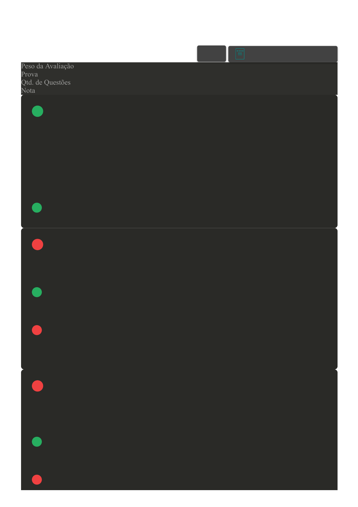 29/11/2022 13:48 Avaliação da Disciplina about:blank 1/7 Prova Impressa GABARITO | Avaliação da Disciplina (Cod.:644861) Peso da Avaliação 10,00 Prova 59514972 Qtd. de Questões 20 Nota 2,00 Uma criança que apresenta características como: inclinação anormal das fissuras palpebrais, Hipertelorismo, Macroglossia e hipotonia, pode ser uma criança com... Assinale a alternativa que completa corretamente a frase: A Asperger. B Medula bífida. C TDAH. D Síndrome de Down. A somatognosia trata da percepção que temos do nosso próprio corpo. É fundamental principalmente para o processo de aprendizagem da escrita. Sobre a somatognosia, analise as afirmações a seguir: I. É o mesmo que noção corporal.II. Pode ser cinestésica e de autoimagem. III. Não depende dos fusos musculares. Assinale a alternativa correta: A Apenas as afirmações I e II estão corretas. B Apenas as afirmações II e III estão corretas. C Apenas a afirmação IIII é correta. D Apenas a afirmação I é correta. Durante o processo de aprendizagem escolar é mais identificável as dificuldades de uma criança, já que é na escola que estas passam a maior parte do tempo construindo o conhecimento, socializando, questionando, etc. As dificuldades que se tornam mais evidentes estão nos âmbitos da leitura, escrita e matemática. Pode-se dizer que são dificuldades de aprendizagem (DA) as denominações relacionadas em qual alternativa? A Dislexia, disgrafia e discalculia. B Síndrome de Down, dislogia e autismo. C Autismo, dislexia e discalculia. VOLTAR A+ Alterar modo de visualização 1 2 3 29/11/2022 13:48 Avaliação da Disciplina about:blank 2/7 D Paralisia cerebral, Dispraxia e discalculia. Este autor apresenta uma abordagem sociointeracionista, onde caracteriza os aspectos humanos do comportamento, além de elaborar hipóteses de como tais características são formadas ao longo da história do indivíduo. Qual o nome do autor desta abordagem? A Vitor da Fonseca. B Vigotski. C Piaget. D Wallon. As dificuldades no ambiente escolar como a leitura, escrita e a matemática, assim como problemas refletidos na psicomotricidade, podem ou não estarem relacionadas a uma disfunção psiconeurológica. Ao se falar em dificuldades de aprendizagem (DA) podemos citar a dislexia, a disgrafia, disortografia, discalculia, e a dislogia. A dislexia e a discalculia são, respectivamente: Assinale a alternativa correta: A É a inabilidade corporal – É a inabilidade na praxia global. B É a dificuldade em escrever que envolve apenas problemas de motricidade fina. – É a dificuldade de se relacionar. C É quando a criança escreve perfeitamente, mas não consegue ler - Caracteriza-se pela dificuldade na aprendizagem do português. D É quando a criança não apresenta uma sequencialização racional, e tem dificuldades para escrever ou ler - Caracteriza-se pela dificuldade na aprendizagem da matemática. Nós humanos processamos mentalmente de forma que diferentes estruturas cerebrais trabalham em conjunto. A atividade mental surge da cooperação de unidades funcionais. Um grande pesquisador as dividiu em três unidades funcionais. Este pesquisador chama-se: Assinale a alternativa correta: A Wallon. B Luria. C Vigotsky. D Piaget. 4 5 6 29/11/2022 13:48 Avaliação da Disciplina about:blank 3/7 O SNC é o responsável por conseguirmos nos integrar com o meio que nos cerca. Isso ocorre por intermédio das nossas sensações, movimentos, pensamentos etc. Associe as principais funções desse sistema. I. Sensorial.II. Motora.III. Homeostase. ( ) Nossos músculos dependem de seu controle para contrair ou relaxar, mesmo inconscientemente. ( ) Promove a estabilidade interna do organismo. ( ) Controla todas as sensações, desde as mais simples, até as especiais. Assinale a alternativa que apresenta a sequência correta: A II – I - III. B III – II - I. C I – II - III. D II – III - I. Definir o que é empreendedor não é uma tarefa fácil. Porém, pode-se dizer que ser empreendedor é ter iniciativa para criar algo novo, realizar um empreendimento garantindo seu sucesso e assumir riscos. Nesse contexto, analise a seguinte asserção-razão: O empreendedor por necessidade não enxerga mais perspectivas no mercado de trabalho. Porque Muitas vezes, possui idade avançada e suas qualificações profissionais estão defasadas. Assinale a alternativa que apresenta a resposta correta: A A primeira afirmação é correta e a segunda afirmação é falsa. B As duas afirmações são corretas e estabelecem relação entre si. C A primeira afirmação é falsa e a segunda afirmação é correta. D As duas afirmações são corretas, mas não estabelecem relação entre si. Quando a criança organiza seu sentir quanto a ela em relação com o meio que a cerca; já se conscientiza de seu esquema corporal, podemos afirmar que se trata do... Assinale a alternativa que completa corretamente a frase: A Elemento da motricidade humana chamado lateralização. B Elemento da motricidade humana chamado estruturação-espaço-temporal. C Elemento da motricidade humana chamado praxia global. D Elemento da motricidade humana chamado Noção corporal. 7 8 9 29/11/2022 13:48 Avaliação da Disciplina about:blank 4/7 Sabe-se da existência de diferentes exames/instrumentos de avaliação motores. Quanto a estes analise as sentenças que seguem, classificando-as como verdadeiras (V) ou falsas (F): ( ) Pode-se tomar como definitiva a aplicação de um tipo de instrumento avaliativo como forma de avaliar toda uma população. ( ) É de extrema importância a avaliação para o monitoramento de alterações, bem como descobertas de atrasos; além de esclarecimentos sobre estratégias para uma melhora de um quadro. ( ) Para decidirmos um instrumento avaliativo confiável, estes devem apresentar as características principais de confiabilidade, de validade e de objetividade. Assinale a alternativa que apresenta a sequência correta: A F – F – V.