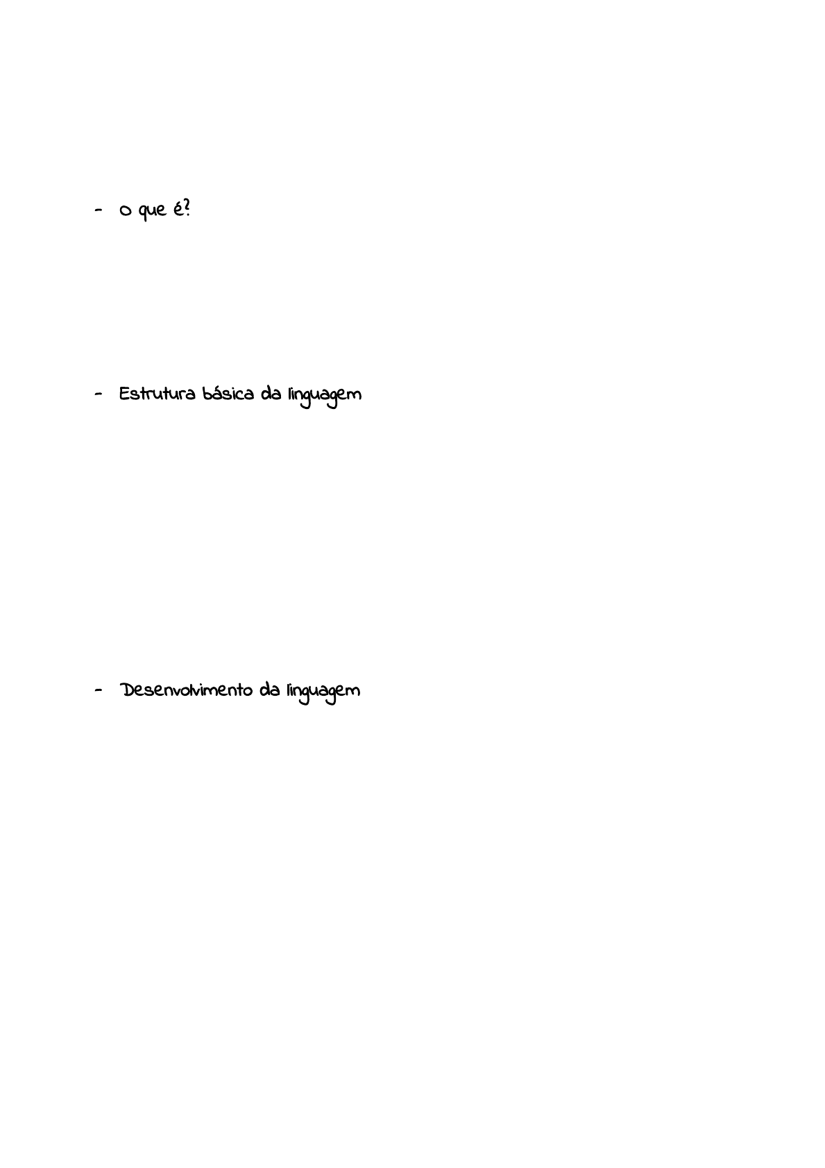 Linguagem - O que é? é a comunicação da informação por meio de símbolos, os quais são organizados de acordo com regras sistemáticas. Está ligada ao modo como nós compreendemos o mundo e como pensamos. Ela nos possibilita adquirir conhecimentos, cooperar com o outro (viver em sociedade), e transmitir informações. Para entendermos como a linguagem funciona e como ela se relaciona com os pensamentos, precisamos primeiro entender alguns elementos formais da linguais ou a estrutura básica da linguagem. - Estrutura básica da linguagem Começamos com a gramática. A gramática nada mais é do que um sistema de regras que determinam como nossos pensamentos podem ser expressos. Dentro dela, há três componentes: 1° - Fonologia: Estudo das menores unidades da fala, chamadas de fonemas. 2° - Sintaxe: São as regras que indicam como palavras e frases podem ser combinadas para formar sentenças. Sentença é algo que tem um propósito comunicativo. 3° - Semântica: maior componente da linguagem, é ela que estuda o significado das palavras. Muitas vezes, essas “regras” váriam de cultura para cultura. Apesar de toda essa sistematização, adquirimos essa habilidade sem termos um estudo prévio. Mas então, como isso ocorre? - Desenvolvimento da linguagem Começa com os balbucios, os quais produzem sons semelhantes à fala ( mas sem significado) mais ou menos dos 3 meses a 1 ano de idade. Enquanto balbuciam, eles podem produzir, em algum momento, qualquer um dos sons presentes em todas as línguas, não apenas daquela ao qual eles estão expostos. Mesmo crianças surdas apresentam sua forma particular de balbucio, pois bebês que são incapazes de ouvir, mas que são expostos a língua dos sinais desde o nascimento, “balbuciam” com suas mãos. Os bebês começam a se “especializar” na língua à qual são expostos à medida que os neurônios em seu cérebro se reorganizam para responder a determinados fonemas que os bebês ouvem rotineiramente. - período crítico da fala: ocorre nos primeiros anos de vida, onde a criança é especialmente sensível aos sinais da língua e a adquire, então, com mais facilidade. Uma criança que nunca foi exposta à linguagem, também não irá aprender a falar e terá dificuldade para aprender. - Produção da linguagem: 1 ano - param de balbuciar e então começam a produzir palavras, começando pelas mais curtas. 2 anos - começam a produzir uma fala telegráfica - sentenças que soam como se fizessem parte de um telegrama, em que as palavras que não são essenciais à mensagem são omitidas. Por exemplo, em vez de falar “eu te mostrei o livro”, ela fala “eu mostro o livro”. Com o passar do tempo, elas vão deixando de usar essas falas telegráficas. 3 anos - aprendem a usar os plurais, mas nesse processo elas acabam supergeneralizando (aplicam as regras de linguagem mesmo que estejam erradas), o que é normal porque elas estão aprendendo agora. 5 anos - adquirem a regras da linguagem. Porém, só mais tarde elas alcançam um vocabulário completo e a capacidade de compreender e usar as regras gramaticais. - Identificando (ou tentando, hahah) identificar as raizes da linguagem: Os psicólogos ofereceram três explicações principais para isso: uma baseada na teoria da aprendizagem, outra baseada em processos inatos e uma terceira que envolve uma certa combinação das duas. - Abordagem da teoria da aprendizagem: segue os principios de reforço e condicionamento. Por exemplo, uma criança que diz “mama” ganha abraços e elogios de sua mãe, o que reforça o comportamento de dizer “mama” e aumenta a probabilidade dessa repetição(condicionamento). Esse enfoque sugere que as crianças primeiro aprendem a falar sendo recompensadas por fazerem sons que se aproximam da fala. Em última análise, por meio de um processo de modelagem, a linguagem torna-se cada vez mais semelhante à fala adulta. Em apoio à abordagem da teoria da aprendizagem da aquisição de linguagem, quanto mais os pais falam com seus filhos pequenos, mais proficiência as crianças adquirem no uso da linguagem. Essa teoria tem dificuldade em explicar esse processo de aquisição da linguagem, porque os pais também elogiam as crianças quando elas falam errado, por ser “fofo”, então, por isso ela não é bem sucedida. - Abordagem nativista: aqui, defende-se que a linguagem é um processo inato, ou seja, acredita-se que os seres humanos já nascem com a habilidade da linguagem. Noam Chomsky propôs que o cérebro humano tem um sistema neural herdado que nos permite compreender a estrutura que a linguagem fornece – uma espécie de gramática universal. Essas capacidades inatas oferecem-nos estratégias e técnicas para compreender as características únicas de nossa língua nativa. - Abordagem interacionista: pressupõe que o desenvolvimento da linguagem é produzido por predisposições genéticas e circustancias ambientais. De modo específico, os proponentes da abordagem interacionista defendem que o cérebro é fisicamente conectado para aquisição da linguagem, fornecendo em essência o “hardware” que permite o desenvolvimento da linguagem (genética). Entretanto, é a exposição à linguagem em nosso ambiente que nos permite desenvolver o “software” apropriado para compreendê-la e produzi-la. - Hipótese da relatividade linguística: linguagem molda a maneira como as pessoas de uma cultura específica percebe e compreende o mundo. Precisamos entender esse processo porque podemos nos deparar com casos de pessoas que têm a linguagem comprometida, e precisamos entender e traçar mecanismos para conseguirmos tratá-las mesmo assim. Geralmente nesses casos é usado a música, ou imagens para nos nortear. A linguagem é comprometida quando o paciente é deficiente ou usa substâncias quimicas, bebidas e etc.